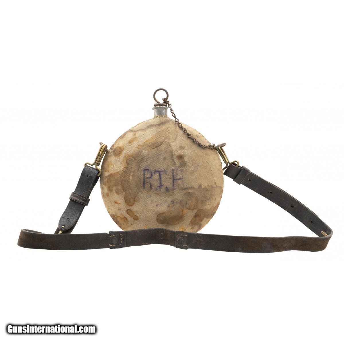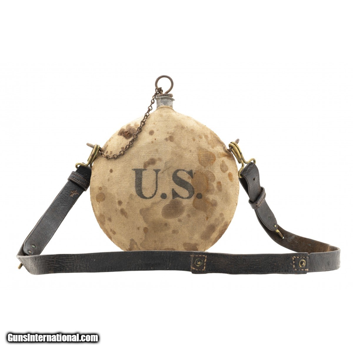 Description: " U.S. Pattern Model 1878 canteen with sling. Outside cover does so staining but the ""U.S."" is still visible. The original cork is also present. Sling is in over good condition with flaking noted on the surface. The back has initials with and regimental markings. SOLD |