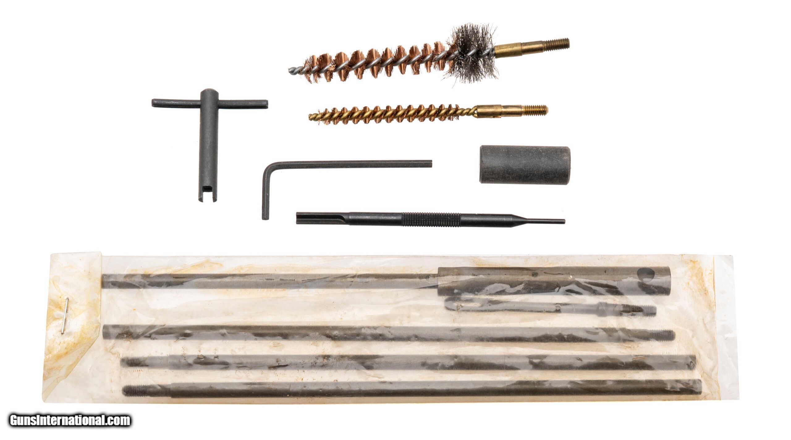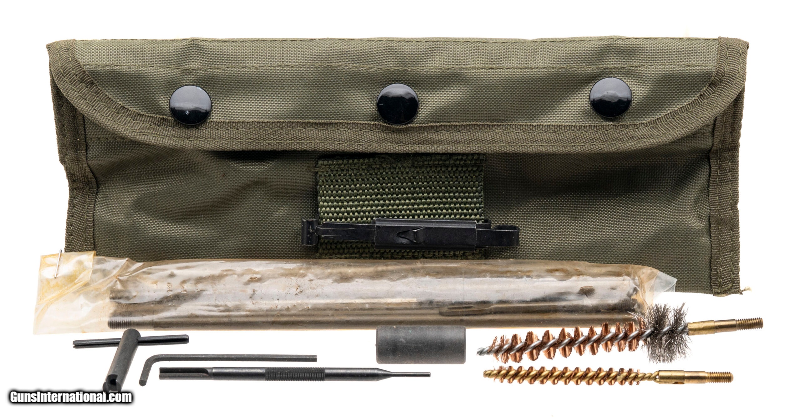 Description: "USGI surplus 8-piece cleaning kit for the M16A1 rifle that includes cleaning rod with patch-puller, bore brush, chamber brush, front sight adjustment tool, etc. Comes in nylon pouch with ALICE equipment clip. SOLD |