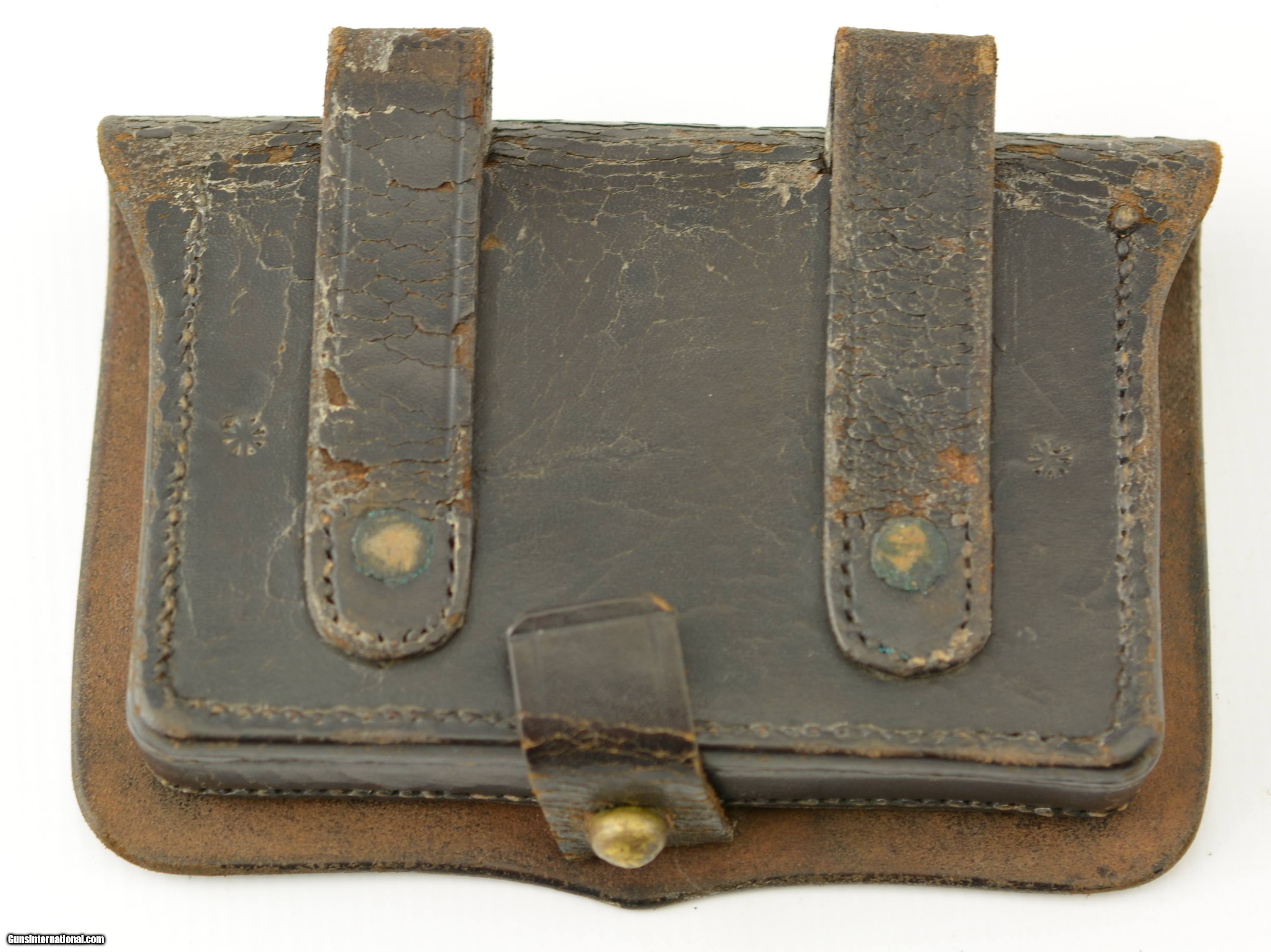 Description: This is a typical federal revolver cartridge box with small “US" and “T. J. Shepard" inspector cartouche on the outside of the cover flap. The leather is in good condition, but does have heavy crazing along the cover with moderate flaking on the flex points. The interior is in fine shape, although the rear wall of the compartment is bowed inwards and away from the exterior wall. The closure tab and belt loops have moderate flaking as well, but are intact, and still quite supple. This is a very good, original piece of Civil War equipment, and would make a nice addition to a collection. SOLD Manufacturer: US Military Model: Cartridge Box |