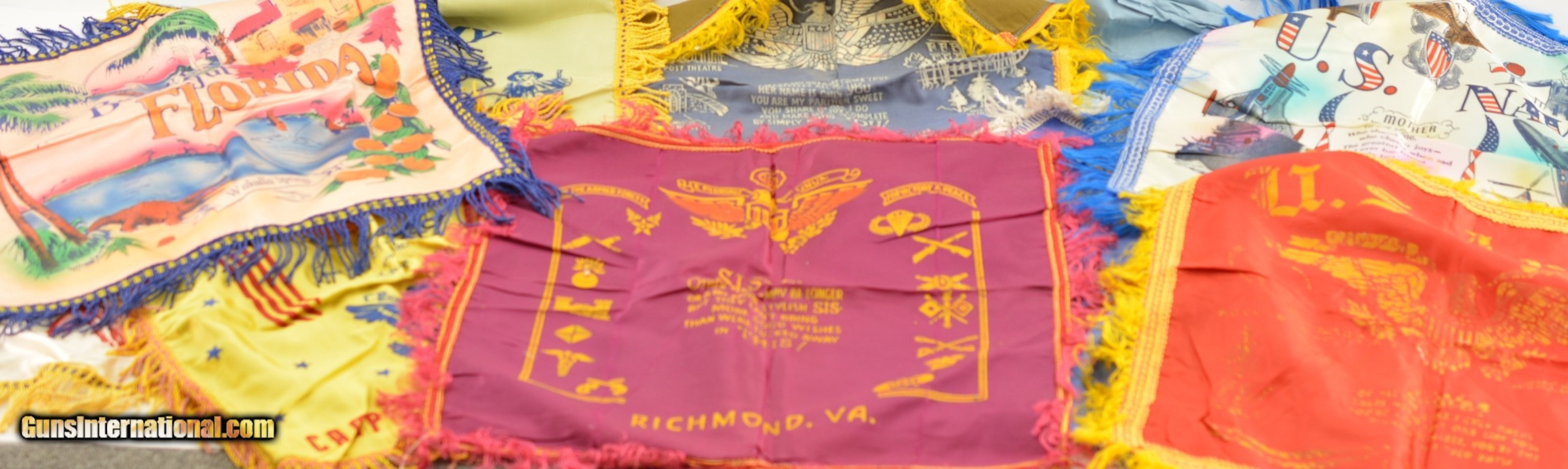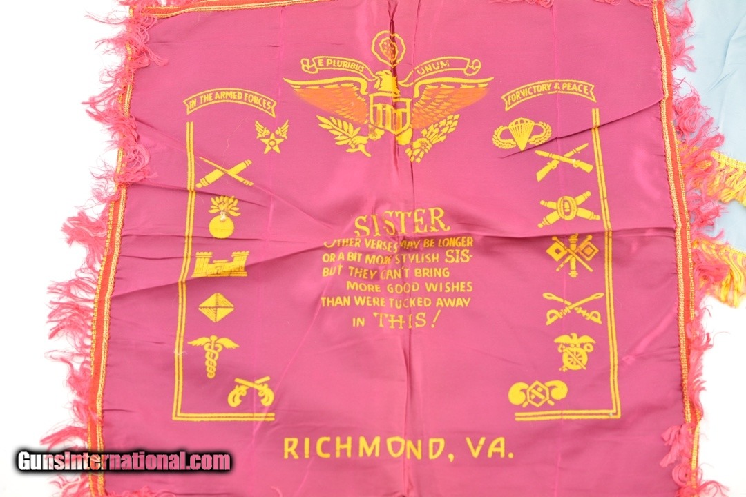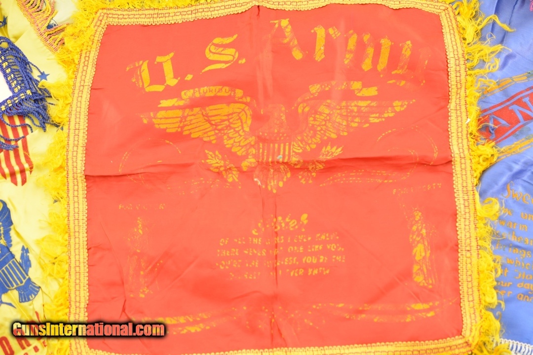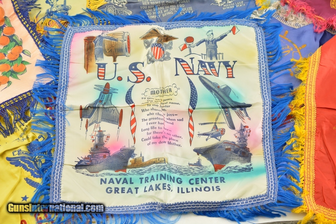 Description: This is a great collection of 8 16"x16" and 1 US Air Forces wall hanger 32"x32" in good condition. The other 8 are from different places and bases Army/Navy. Really a fine collection. Condition varies from almost new to very good, all are lined to accept a pillow. Price: $29.95 Contact Seller |