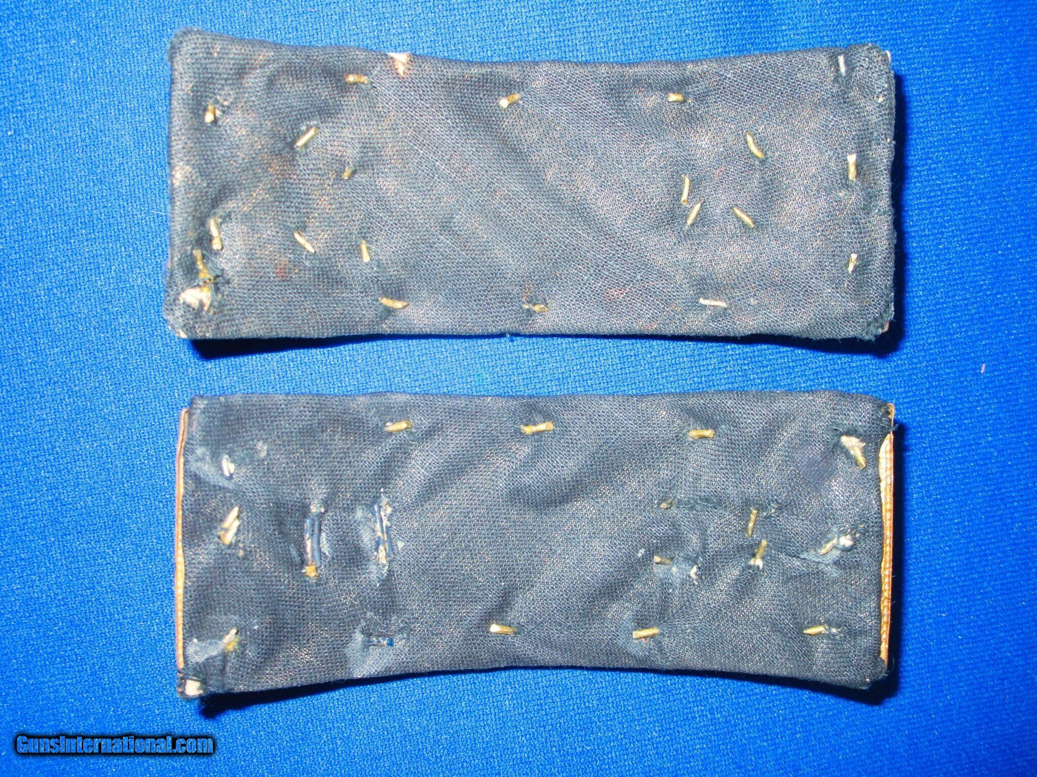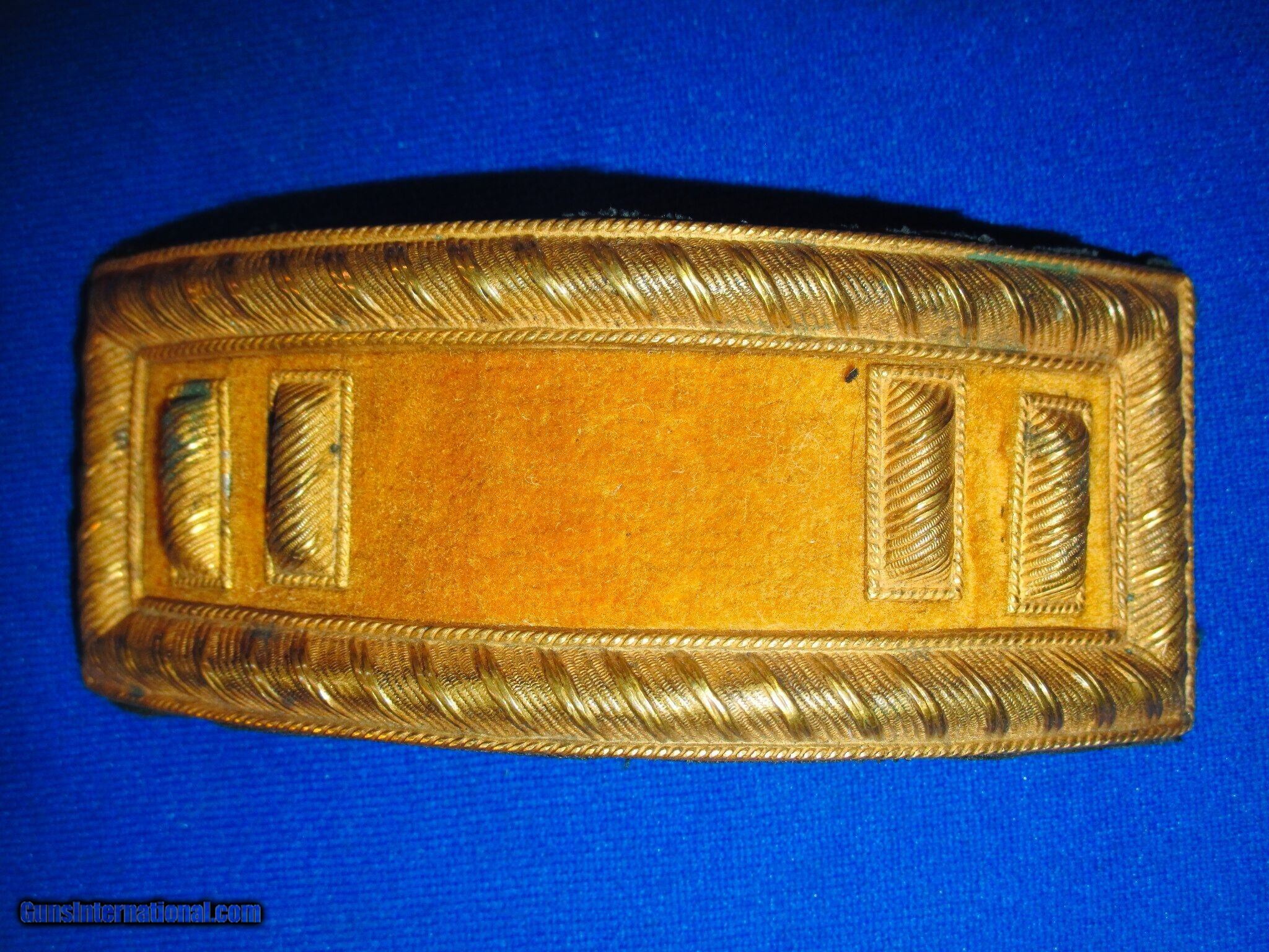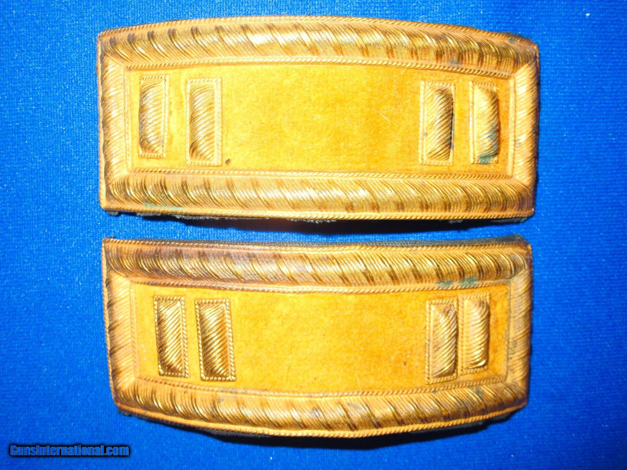 Description: A Very Early & Scarce Original Pair Of U.S. Smith's Patent Captains Cavalry Straps In Excellent Untouched Condition. All original and complete. The rare straps are are excellent on both the front and back as shown. They have bright yellow & gold colors throughout them including the bullion. The back of the straps are also excellent throughout. This Is A Very High Condition Original Pair Of Early & Scarce U.S. Smith's Patent Captains Cavalry Straps That Would be a Wonderful Addition To Any Collection! Price: $795.00 Contact Seller |