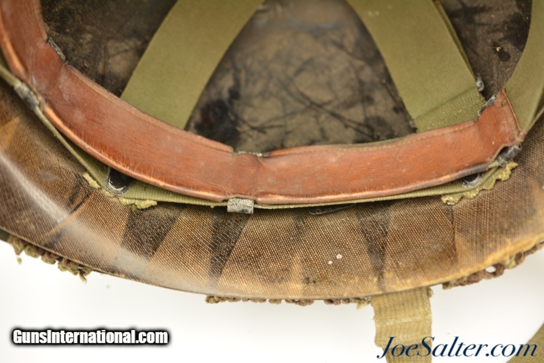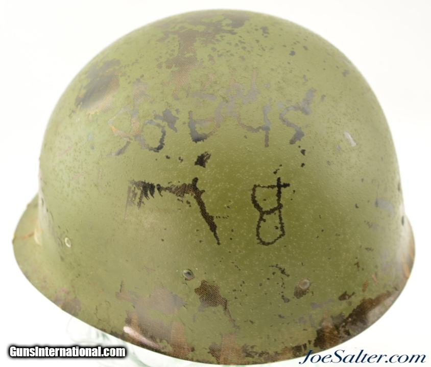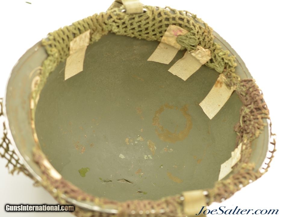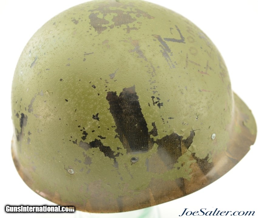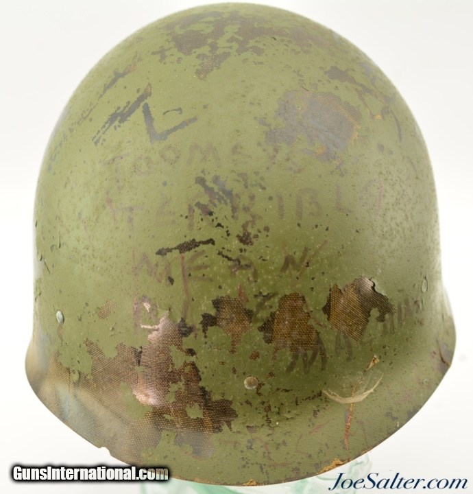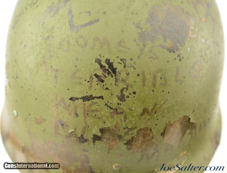 Description: This is a very nice example of an original WWII Front-Seam Fixed Bale M1 Helmet made by McCord Radiator, with a Westinghouse liner. This helmet is very early war 1941- early 42 made. This is a correct McCord front seam, production number is obscured with an excellent later painted interior, right angle fixed bale, OD straps with brass hardware correct chin strap with a light presence of oxidation on the surface interior. The inside of the helmet has the name "Lovell B" and and something else that cannot be made out. The outside of the helmet is covered with camouflage netting held on by athletic tape and also has writing. The Westinghouse plastic liner is complete and matching, this liner was manufactured between 1961- 69 and I believe this made made in 1964 (The M1 Helmet: Mark A Reynosa 1996) This liner has been painted and has writing on the exterior as follows "Toomeys Terrible Mean Machine". SOLD |