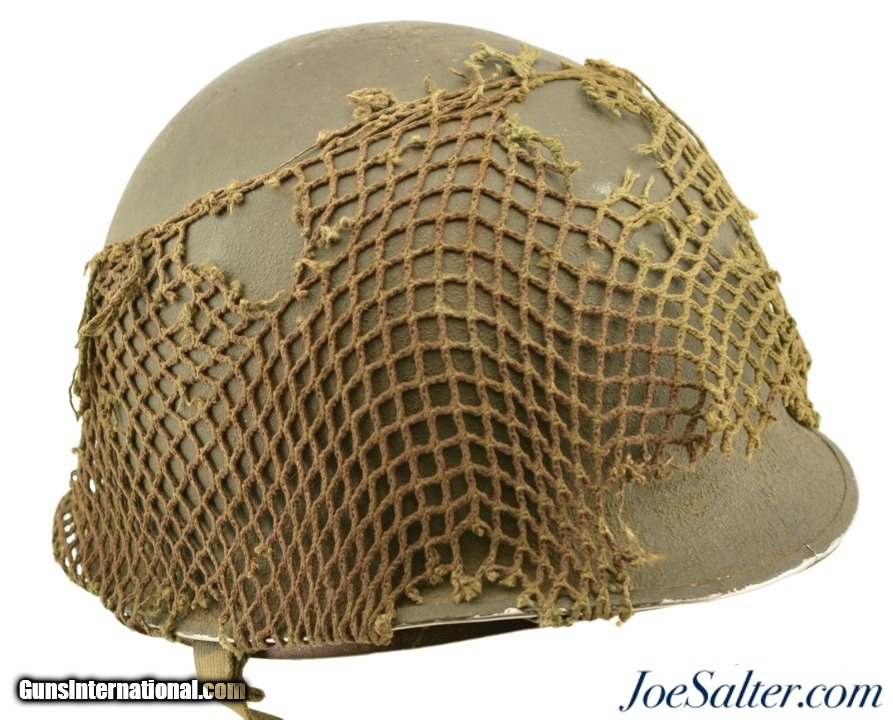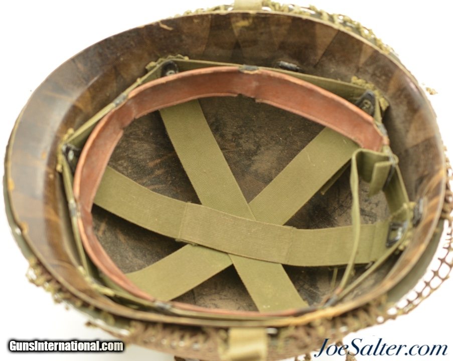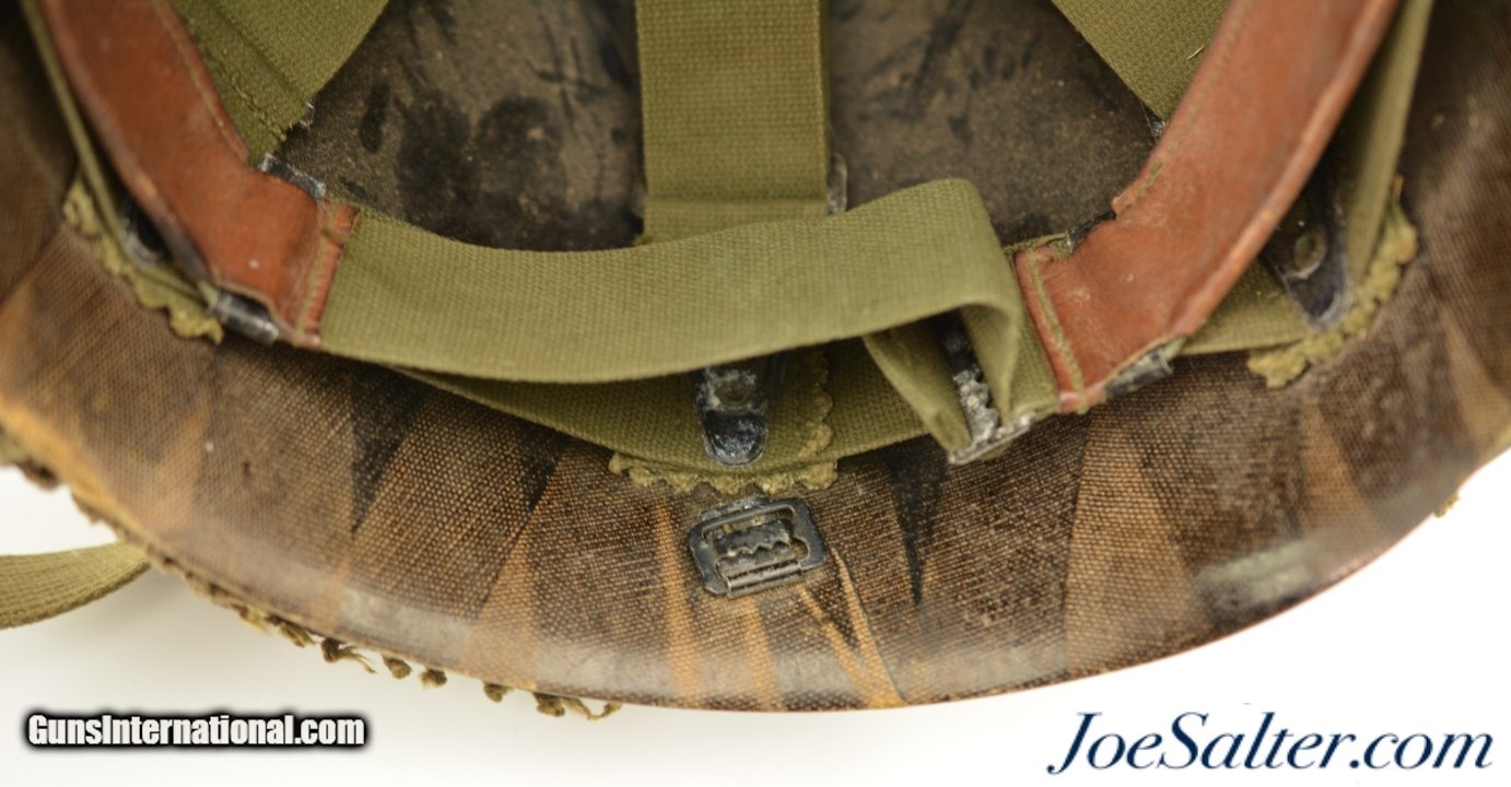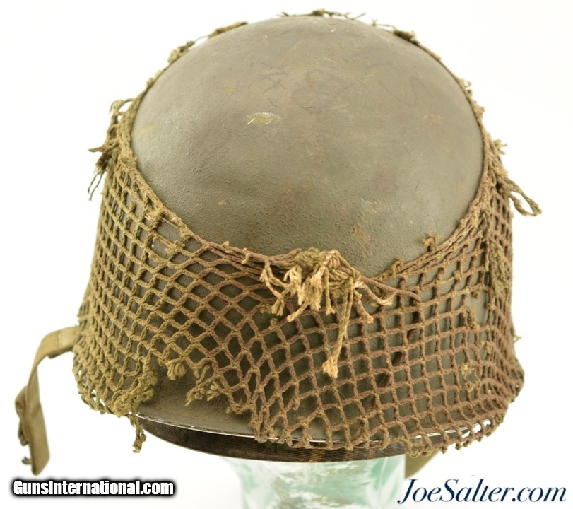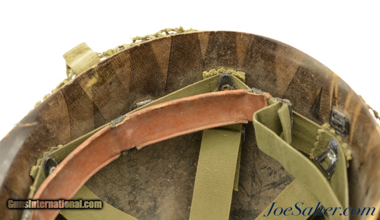 Description: This is a very nice example of an original WWII Front-Seam Fixed Bale M1 Helmet made by McCord Radiator, with a Westinghouse liner. This helmet is very early war 1941- early 42 made. This is a correct McCord front seam, production number is obscured with an excellent later painted interior, right angle fixed bale, OD straps with brass hardware correct chin strap with a light presence of oxidation on the surface interior. The inside of the helmet has the name "Lovell B" and and something else that cannot be made out. The outside of the helmet is covered with camouflage netting held on by athletic tape and also has writing. The Westinghouse plastic liner is complete and matching, this liner was manufactured between 1961- 69 and I believe this made made in 1964 (The M1 Helmet: Mark A Reynosa 1996) This liner has been painted and has writing on the exterior as follows "Toomeys Terrible Mean Machine". SOLD |