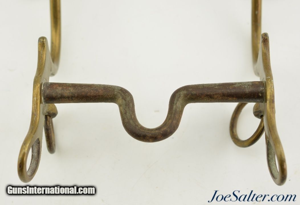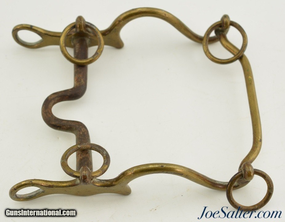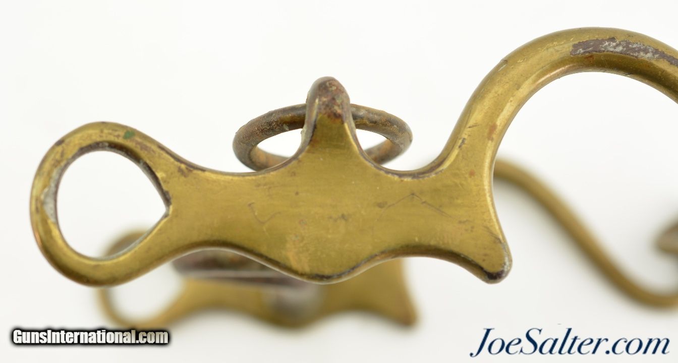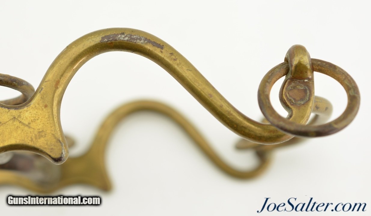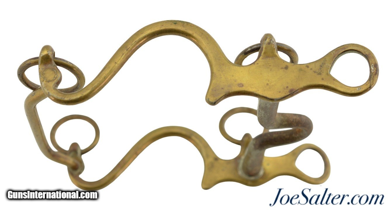Description: This is a very interesting horse bit attributed to Artillery Major Samual Ringgold in the 1840's. He also furnished the army with a new saddle type in 1844 and a watering bit. This is an exact copy of the bit found on page 86 Fig. 2 of "Horse Equipment of the Civil War Era" by Howard R Crouch. This example is in very good condition with most of the heavy brass coating and light oxidation on the un-plated mouthpiece. Distinctive double side ring are all free and functional. Excellent piece of cavalry history.; Price: $199.00 Contact Seller |