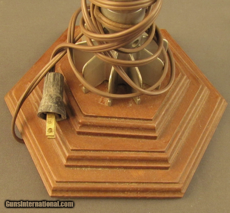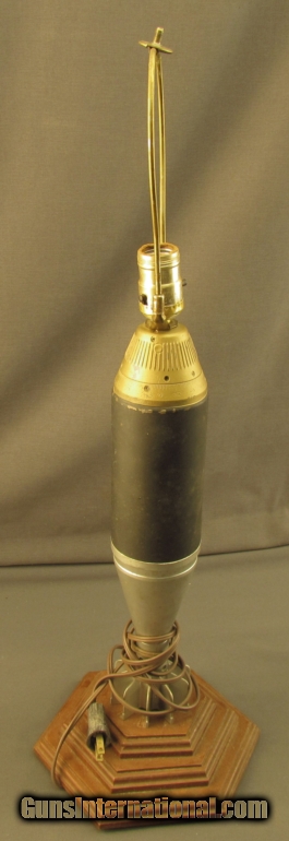 Description: This M252 US 81mm mortar shell has been deactivated and made into a lamp. Base is pine, stained dark. Shell has been painted, it shows a few scratches and stains. Lamp works, however cord and socket are quite old and need careful inspection before use. A great gunroom decoration. SOLD Manufacturer: Morter Round Model: Lamp |