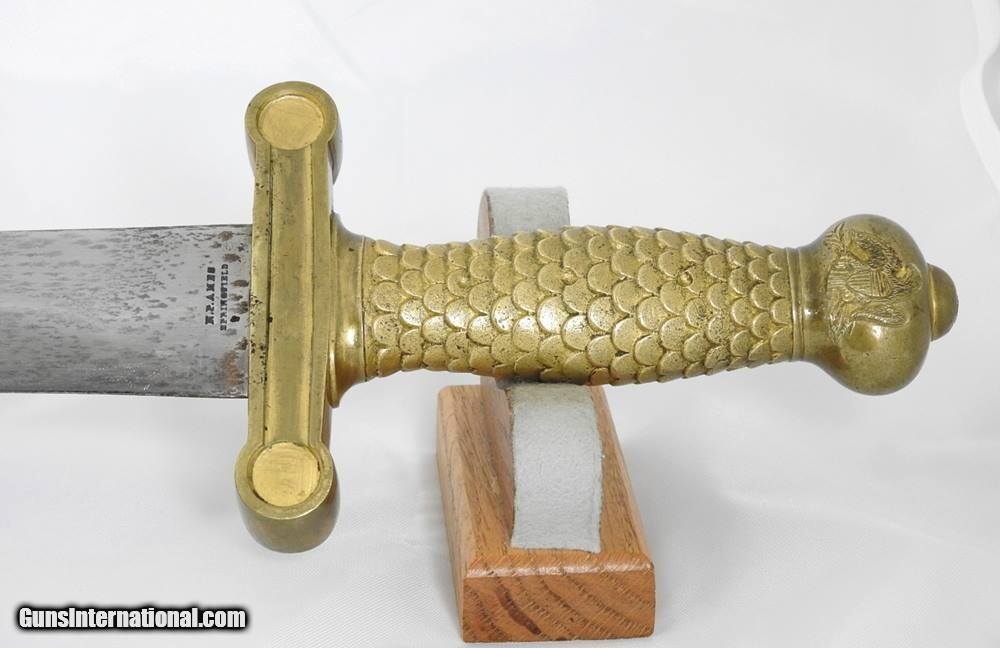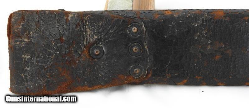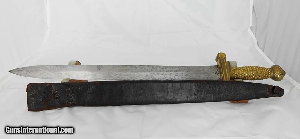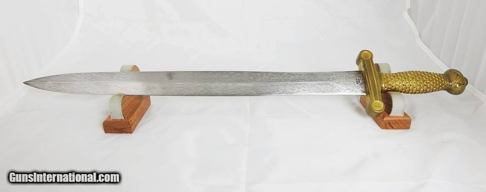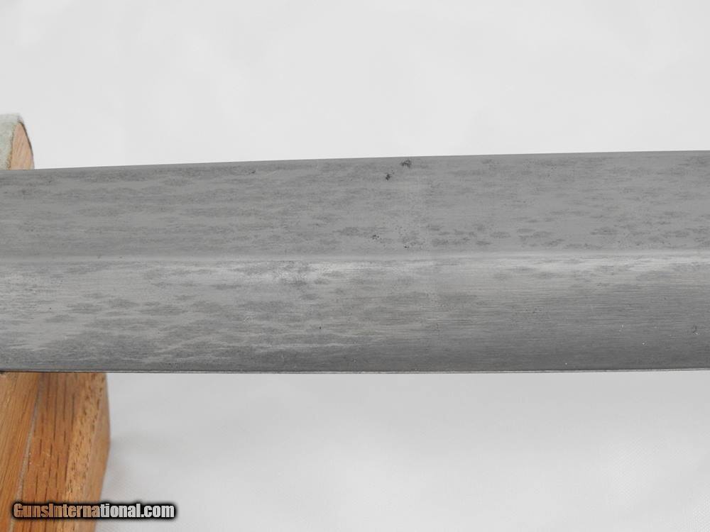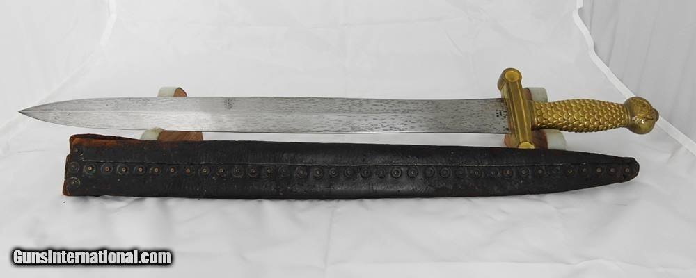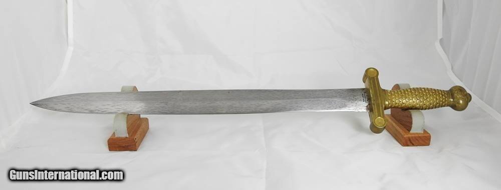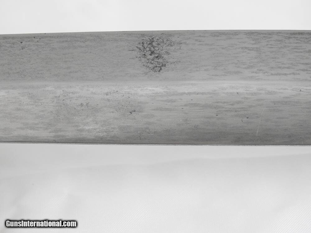 Description: This one does not have a knuckle guard and there are no inspector initials on the grip or guard. It does not have the three handle grip rivets. The blade does not have any fullers but has the same shape as the Model 1841 Naval Cutlass with the knuckle Guard and comes with a leather scabbard with 39 rivets on the front side. On the backside the tip is cracked and the top of the belt loupe cracked and has worn open. The blade is nice with only light stains on both sides. I would consider trades for pre 1899 ANTIQUE PISTOLS and rifles on any of my items.. WHAT DO YOU HAVE TO TRADE? Ask about our 30-90 day lay-away program. We accept Bank Check, Money order, Personal checks or wire transfer. Price: $1,000.00 Contact Seller |
