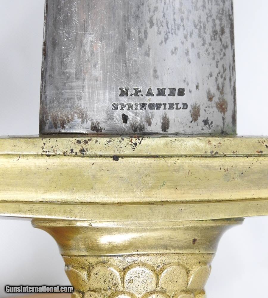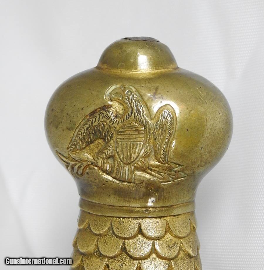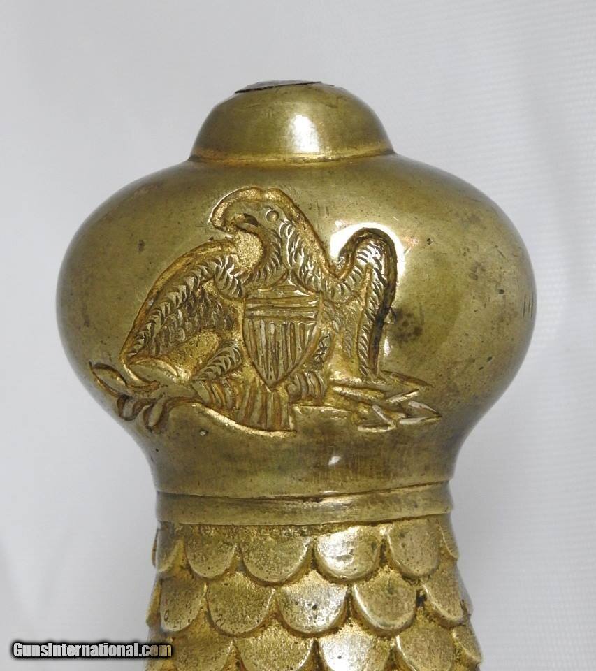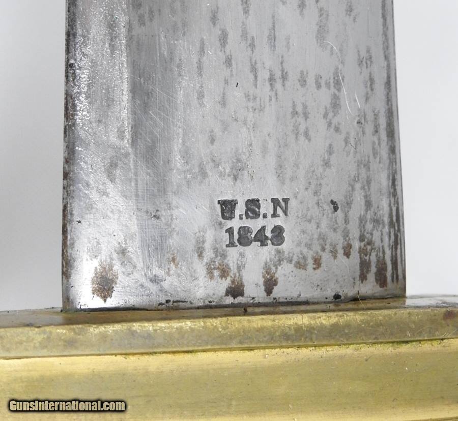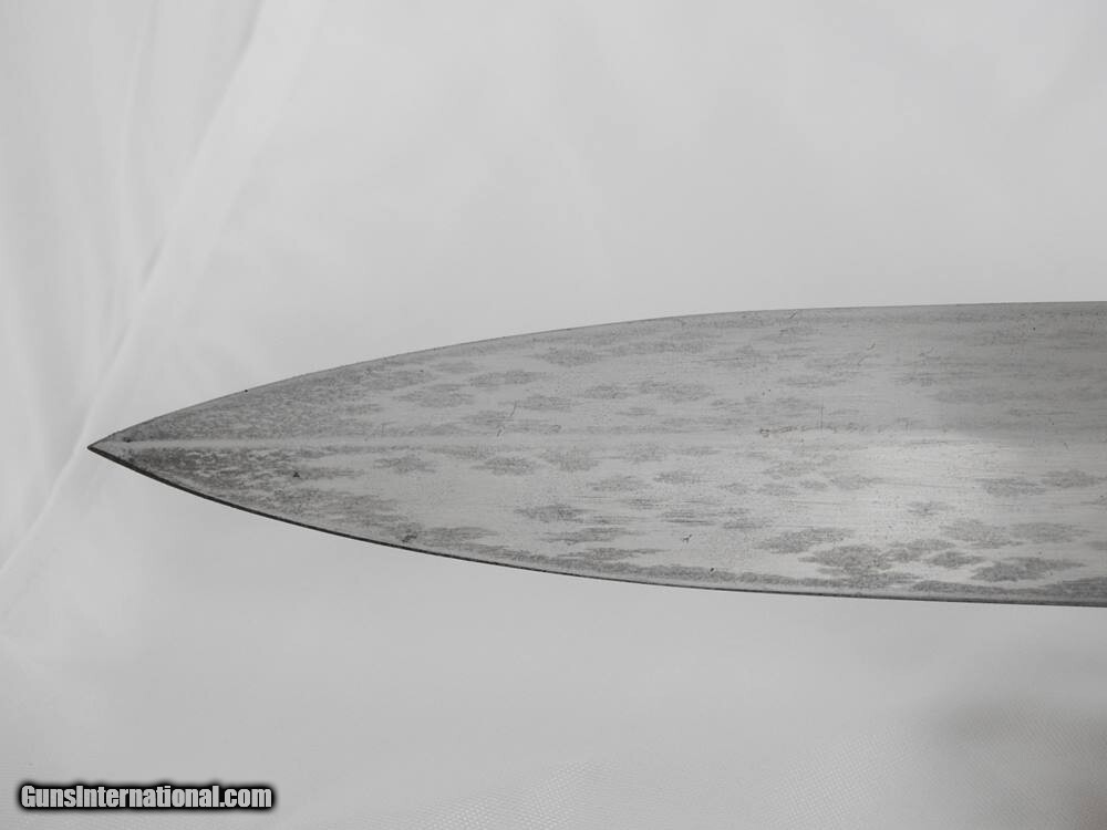 Description: This one does not have a knuckle guard and there are no inspector initials on the grip or guard. It does not have the three handle grip rivets. The blade does not have any fullers but has the same shape as the Model 1841 Naval Cutlass with the knuckle Guard and comes with a leather scabbard with 39 rivets on the front side. On the backside the tip is cracked and the top of the belt loupe cracked and has worn open. The blade is nice with only light stains on both sides. I would consider trades for pre 1899 ANTIQUE PISTOLS and rifles on any of my items.. WHAT DO YOU HAVE TO TRADE? Ask about our 30-90 day lay-away program. We accept Bank Check, Money order, Personal checks or wire transfer. Price: $1,000.00 Contact Seller |