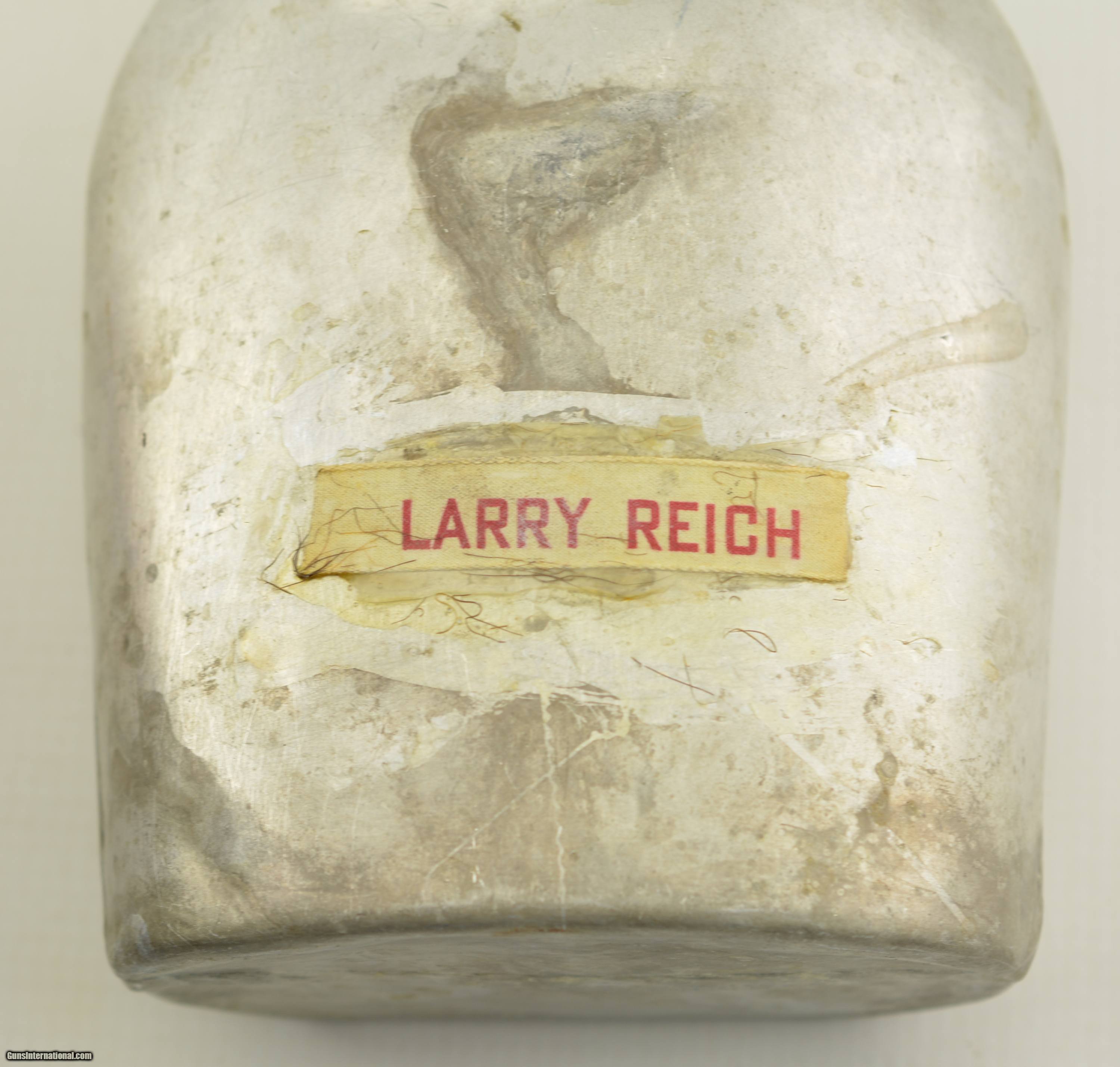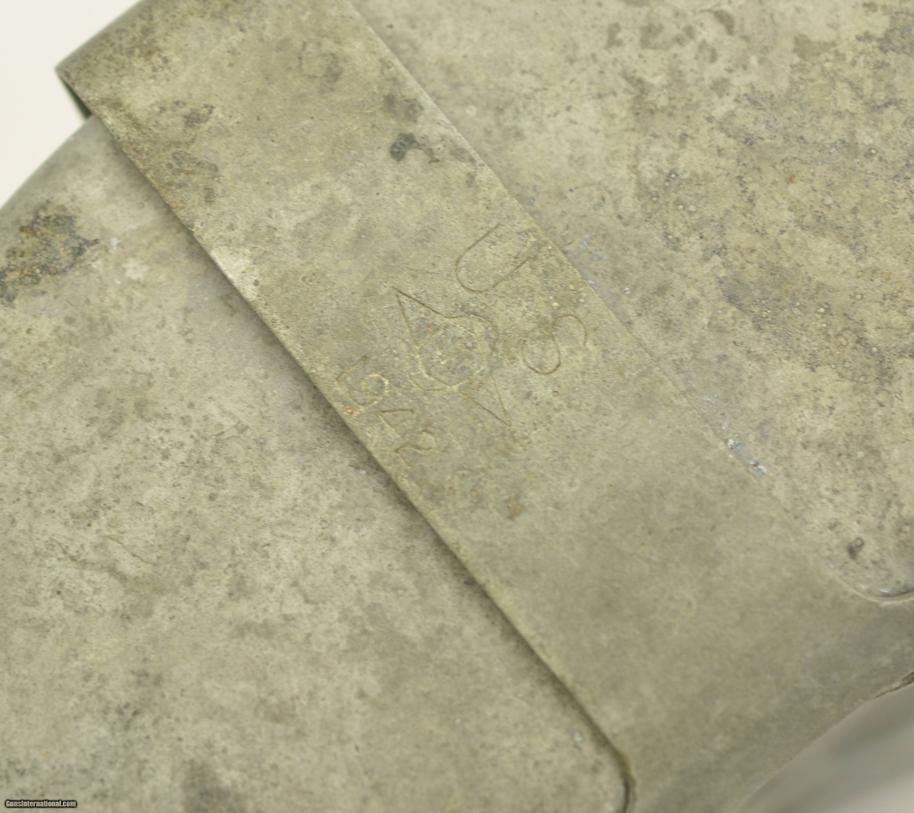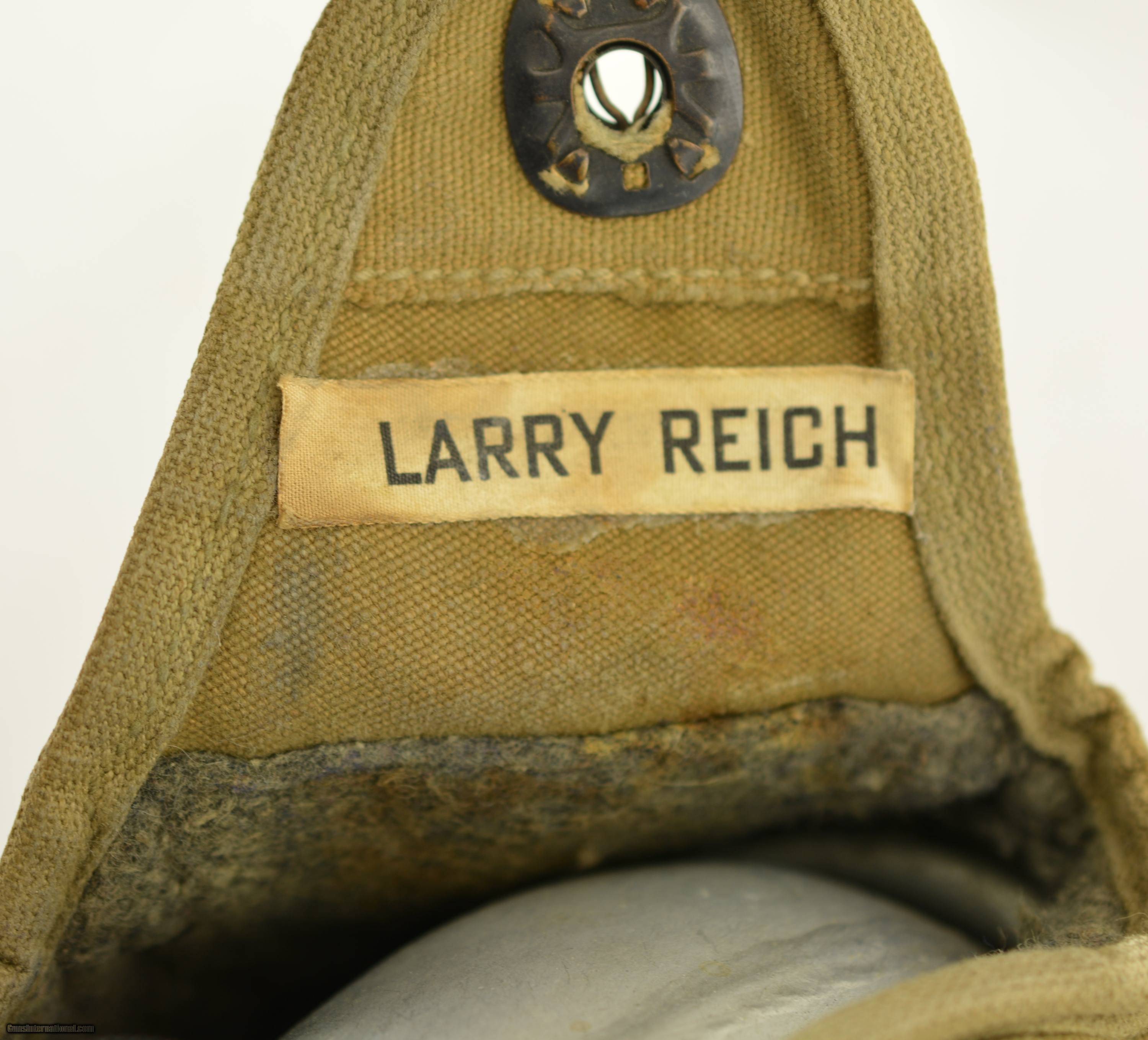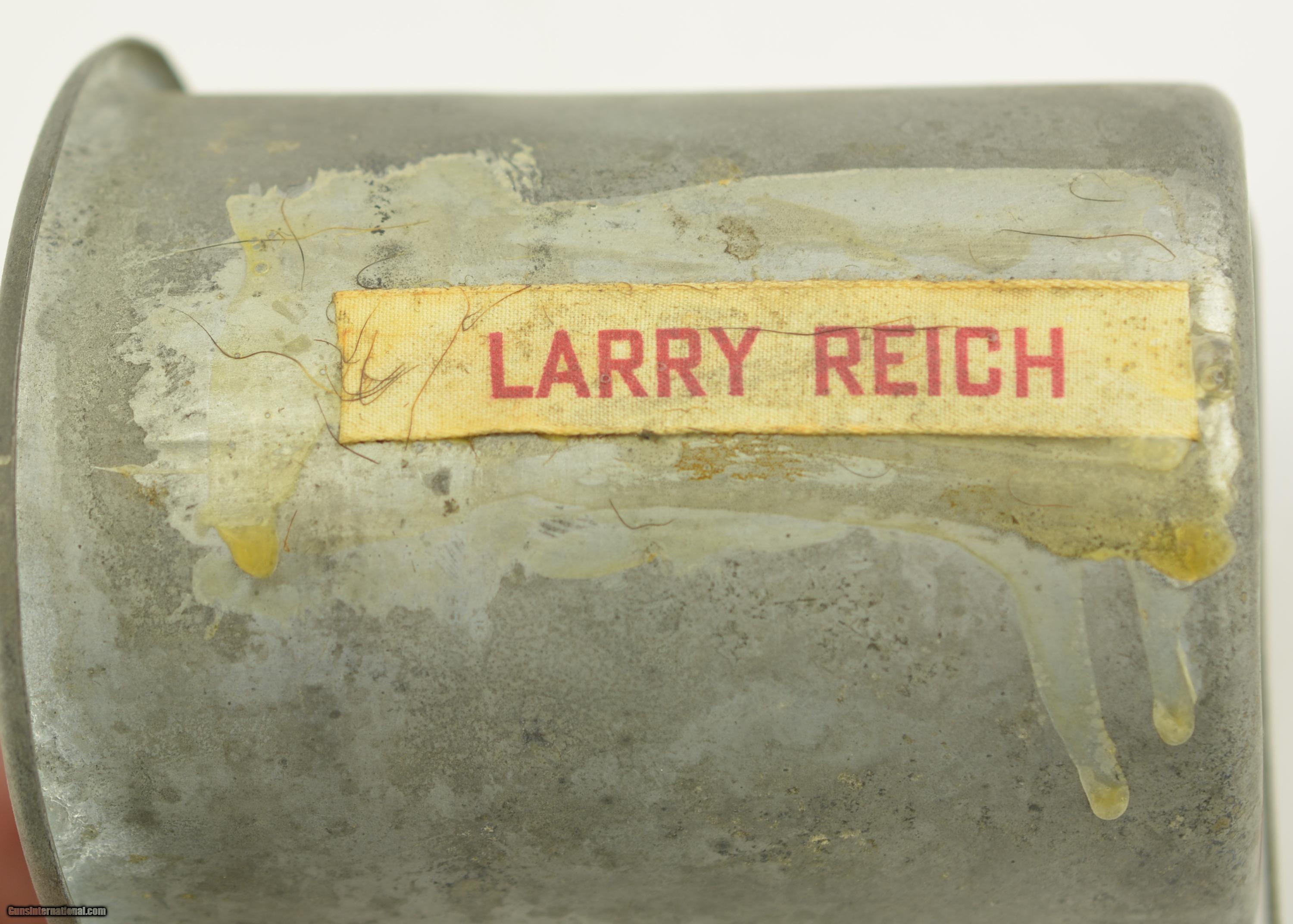 Description: This is a World War II Canteen with cup and canvas lined pouch belonging to Larry Reich. The canvas lined pouch is marked US and was made by Scott Mfg. Co. and has the soldiers name “Larry Reich" printed on cloth tape inside the flat. The canteen has the flat top and is marked “U.S. T.A.C. Co. 1943" with a cloth name tag glued to the front. The handled cup is marked “U.S. 1942" with the manufacturer symbol and the cloth name tag glued to the outside. While the provenance is not clearly delineated an online search revealed that a Larry Reich, a city planner from Baltimore served in World War II in the 312th Combat Engineers which was part of Gen. George Patton’s 3rd Army which saw action during the Battle of the Bulge. The canteen has several dents and use marks and the cap turns easily. The cup shows some surface corrosion on the inside and the aluminum surface has darkened with age and use. A great piece of World War II history that would add to any collection and would be fun to research. Please see the photographs for further information on condition. SOLD Manufacturer: US Military Model: Canteen |