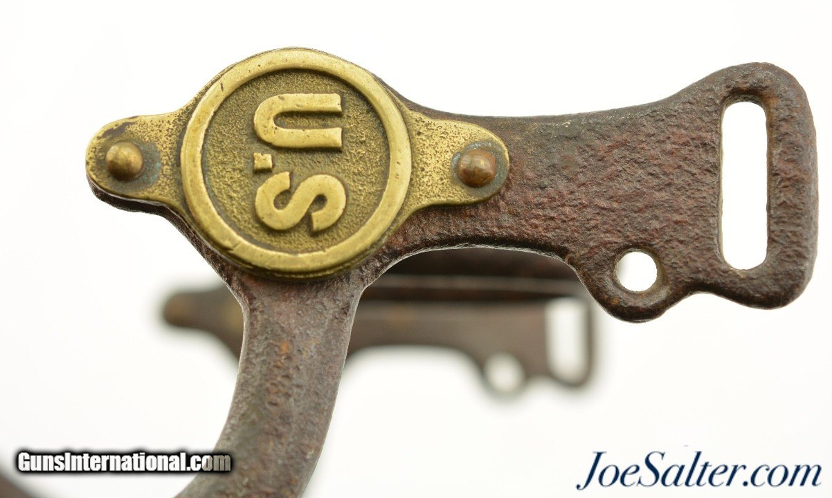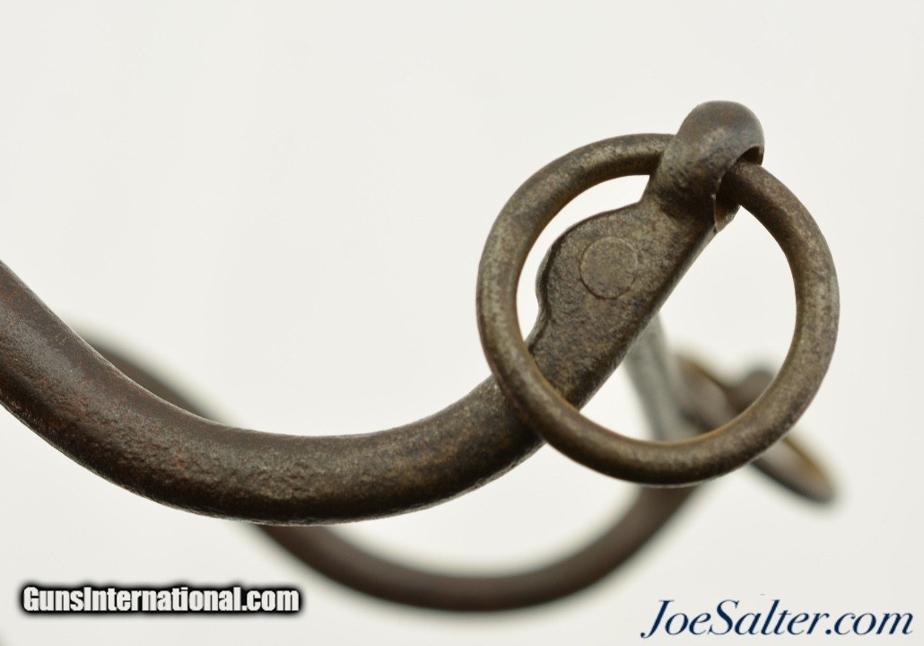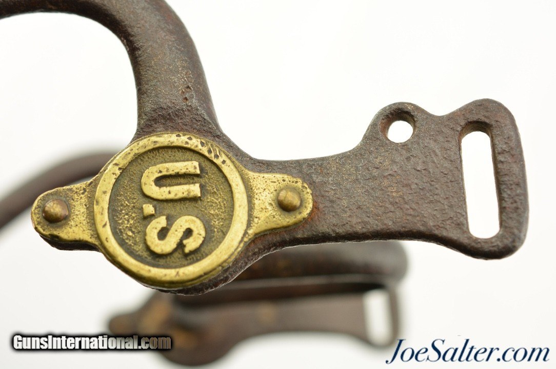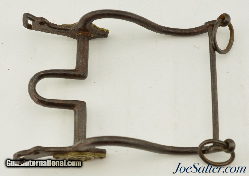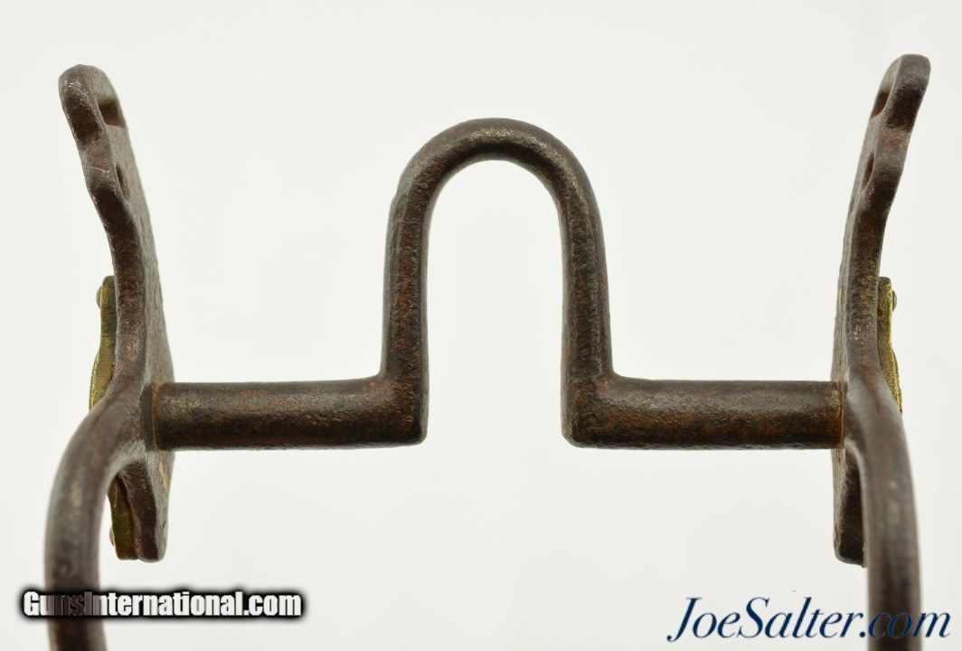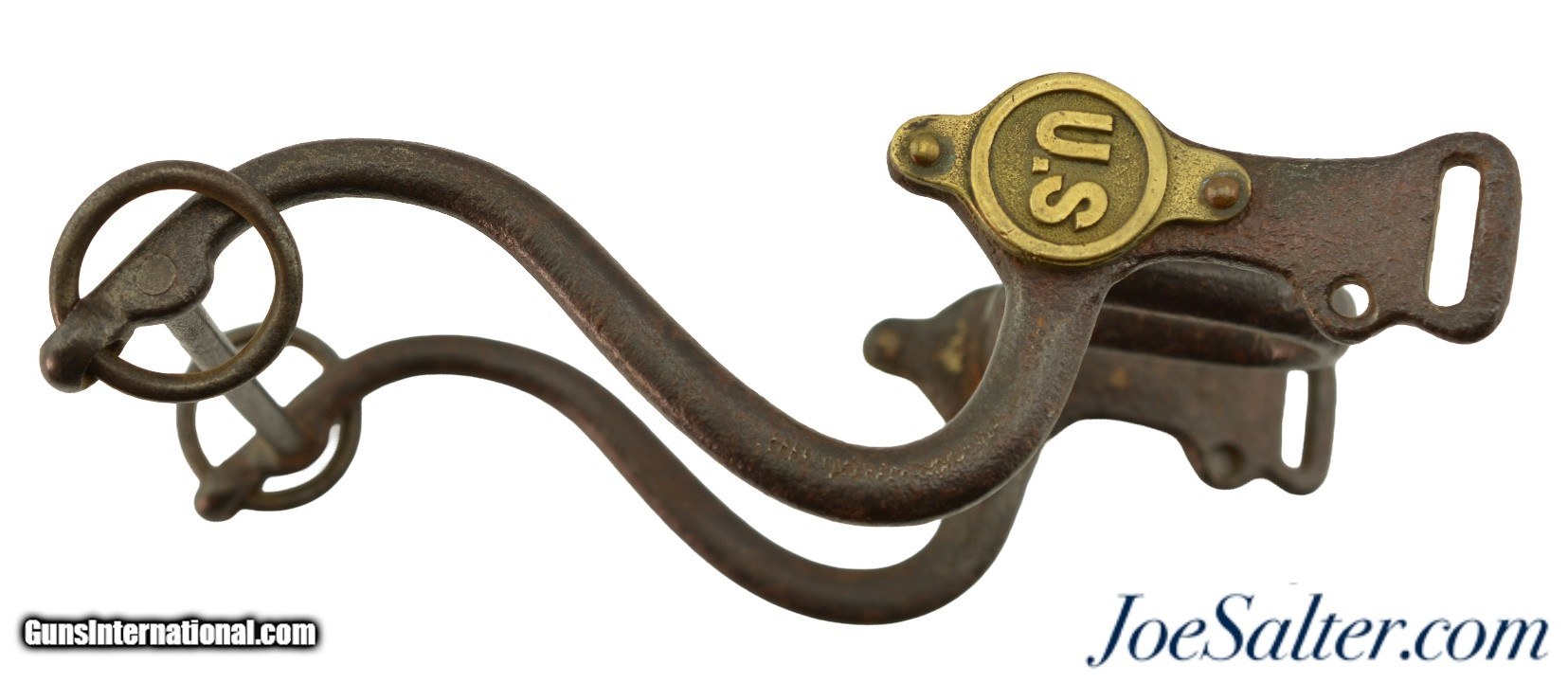 Description: This is a Civil War period, M1859 Hi Port US Cavalry Bit. This example has Brass "US" medallions riveted in place on either side of the bit with a weathered surface and no makers mark. Complete with #1 highest port, rings, and bottom cross bar. This example is in very good condition with surface oxidation, great brass patina. Approx 8 1/2" long and 6 1/2" wide.; Price: $259.00 Contact Seller |