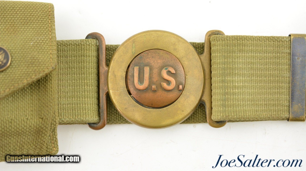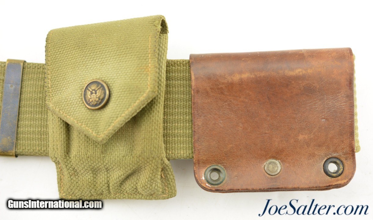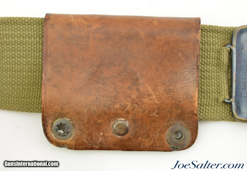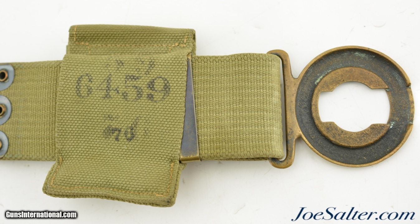 Description: This is a M1910 Garrison belt with a pair of M1915 rimmed eagle snap pouches. The belt is of MILLS manufacture with a patent date of April 18 1905/January 29 190_, this example is in very good original condition with tight stitching and nice US brass buckles. This has what appears a period leather belt hanger for the M1912 or M1916 US 1911 .45 holster, also in very good condition. This has two very good condition MILLS pouches dated 1915 and marked on the back "153 over 93" and the left "69 over 6459 over 76" This is a near complete belt set up minus the holster.; Price: $299.00 Contact Seller |
