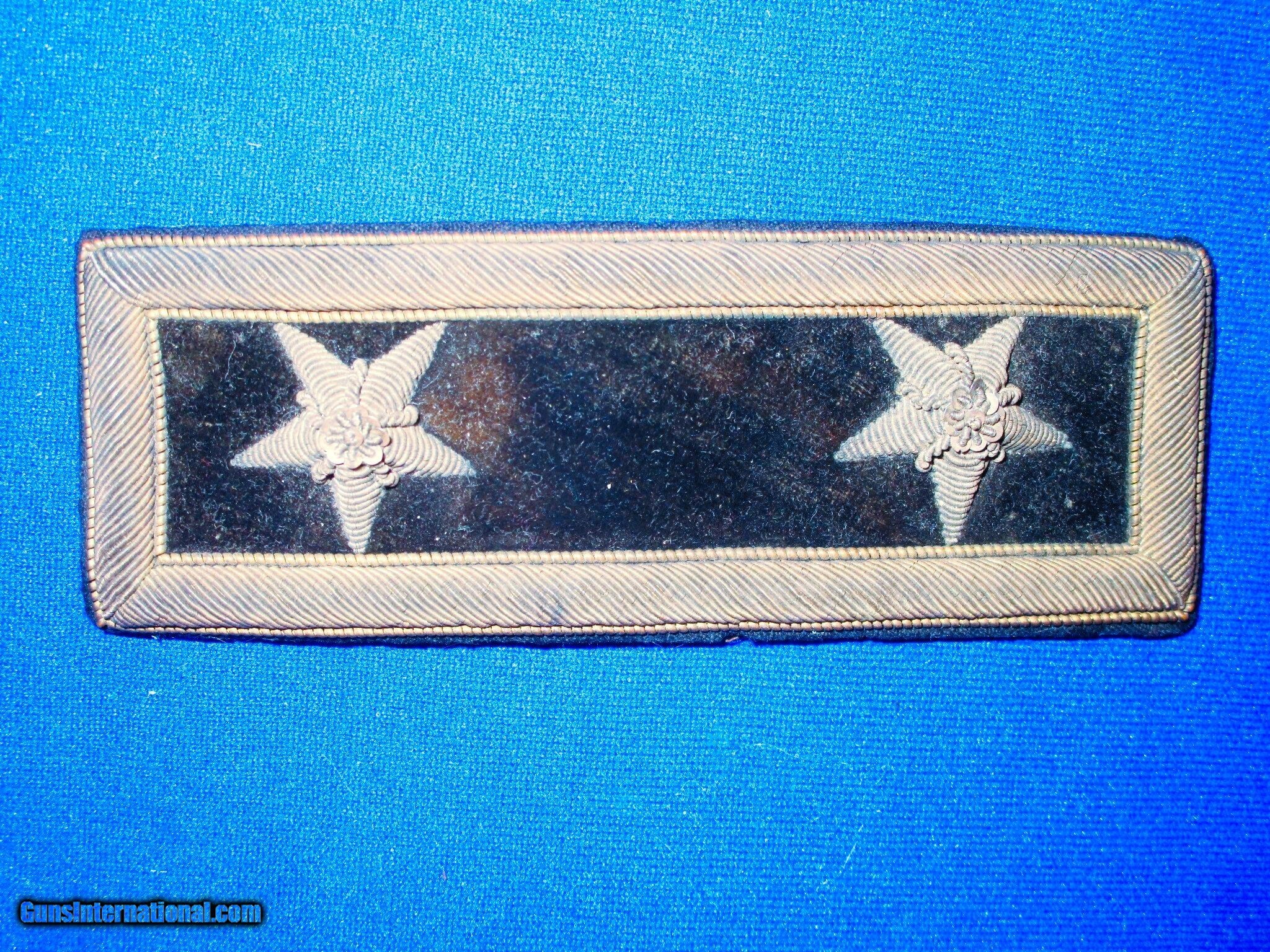 Description: An Early & Rare Original Single U.S. Civil War Major General's Shoulder Strap With Bullion Border & Stars In Excellent Untouched Condition. All original & complete. The insignia has a fine background with a bullion border and 2 stars in it. It has a fine original backing as shown. It measures 4 1/2 inches by 1 5/8 inches. It has a very fine untouched look to it. This Is A Fine Looking & Untouched Example Of A Scarce U.S. Civil War Major General's Shoulder Strap! Price: $625.00 Contact Seller |