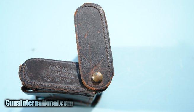 Description: ROCK ISLAND U.S.M.C. MCKEEVER CARTRIDGE BOX FOR THE 6MM LEE STRAIGHT PULL RIFLE. Excellent example and all original with the correct leather magazine inserts. The scarcest of all Marine Corps cartridge boxes of the cartridge era. Perfect inspector’s stamp “ROCK ISLAND/ARSENAL/1904/T.C.”. SOLD |