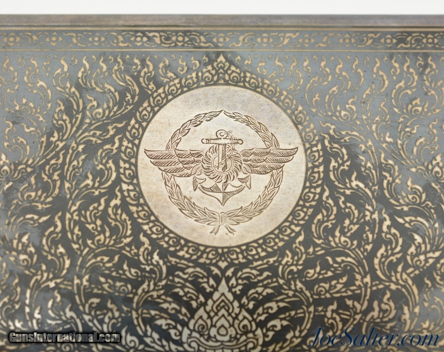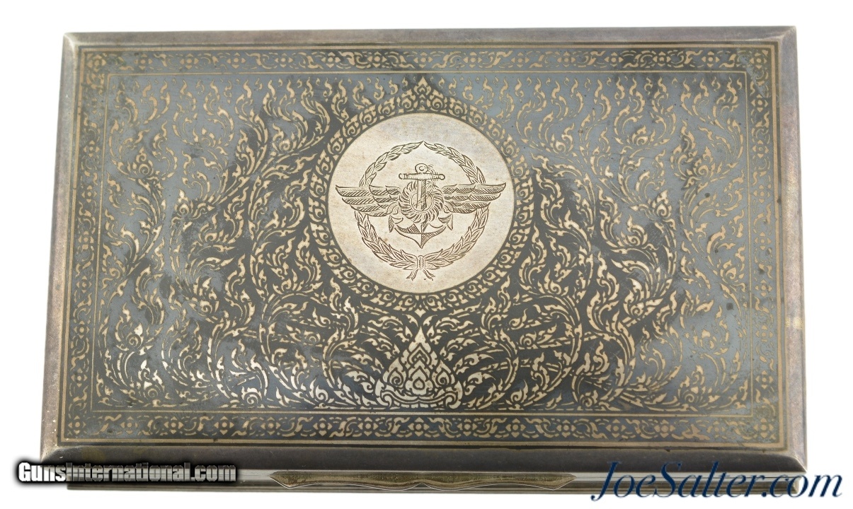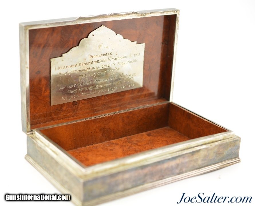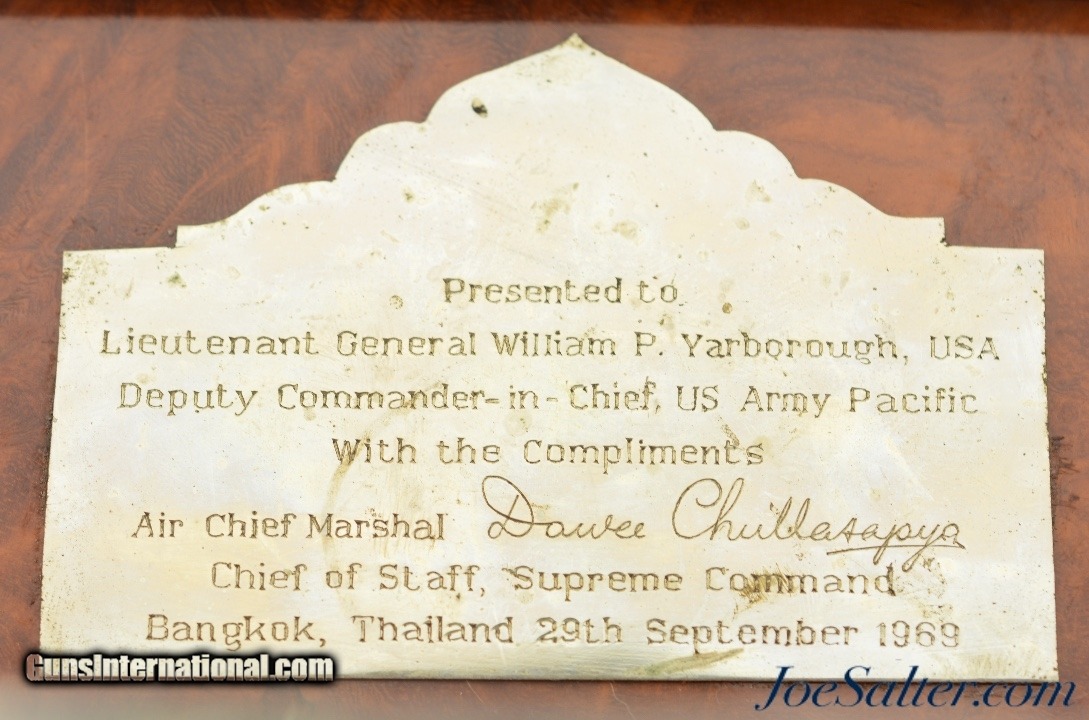 Description: This is an attractive, highly ornate metal case that measures 6 1/8" x 3 11/16" x 1 3/8". The exterior has a two-tone filigree motif on the lid with the engraved emblem of the Royal Thai Armed Forces on a circular escutcheon in the center. The remainder of the silver cladding has developed a pleasing bluish-black tarnish over time. The interior is lined with nicely burled wood and there is a silver presentation plaque affixed to the inside of the lid that reads: "Presented to / Lieutenant General William P. Yarborough, USA / Deputy Commander-In-Chief, US Army Pacific / With the Compliments / Air Chief Marshal Dawee Chullasapya / Chief of Staff, Supreme Command / Bangkok, Thailand 29th September, 1969." Lt. Gen. William Pelham Yarborough (1912 & 2005) was a 1936 graduate of West Point and volunteered for the fledgling US Army airborne forces while assigned to the 29th Infantry Regiment at Fort Benning, GA in 1940. In 1941, Yarborough was responsible for the design of the famous paratrooper jump boot, paratrooper uniform, as well as the US Army Parachutist Badge (still in use today). Yarborough served in North Africa and Italy during WW2, with postwar service in Occupied Germany, and the US. In 1961 Yarborough was appointed the commandant of the US Army Special Warfare Center/School for Special Warfare at Fort Bragg, NC (now the John F. Kennedy Special Warfare Center and School at Fort Liberty, NC). Yarborough worked hard to build up the capabilities of the Special Forces, and oversaw a dramatic increase in the professional and academic standards of the school. His most well-known contribution was the introduction of the iconic Green Beret as a distinguishing symbol of the Special Forces. Following his time at the Special Warfare School, he became the Senior Member, UN Command Military Armistice Commission, Panmunjom, Korea, where he was the chief negotiator with the DPRK and Chinese. Following that, he was posted to the Pentagon where he eventually became the top Army intelligence officer. In 1969 he was made Deputy Commander-in-Chief, US Army Pacific, retired from Army service in 1971, and lived an active life before he passed away on December 6, 2005. Yarborough’s Special Warfare legacy continues, however, as every graduate of the Special Forces Qualification Course is awarded a "Yarborough Knife" named for the general and made by Chris Reeves Knives of Boise, ID. This is a great piece of Vietnam War era militaria, presented to a very important officer in the history of the Special Forces. SOLD |