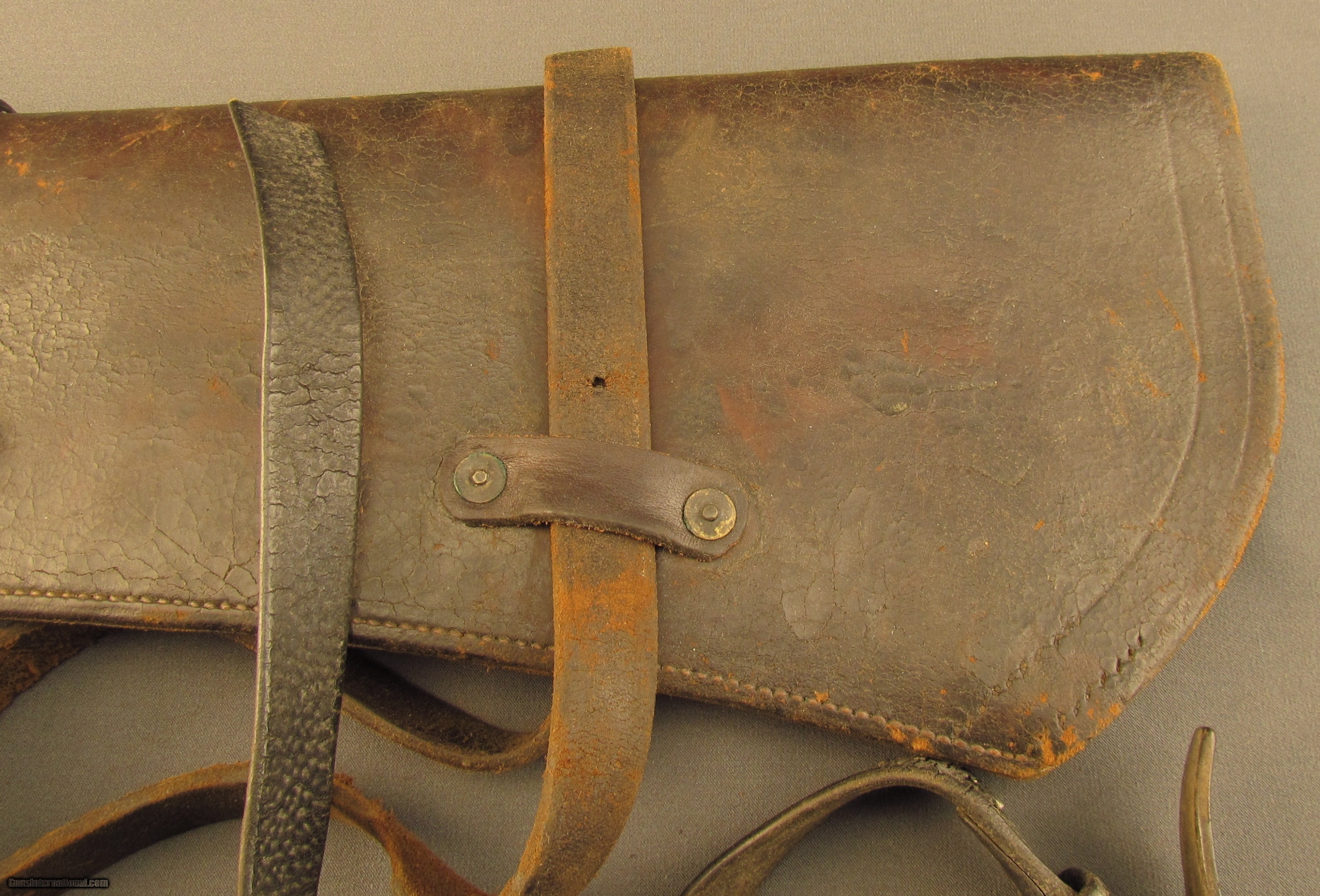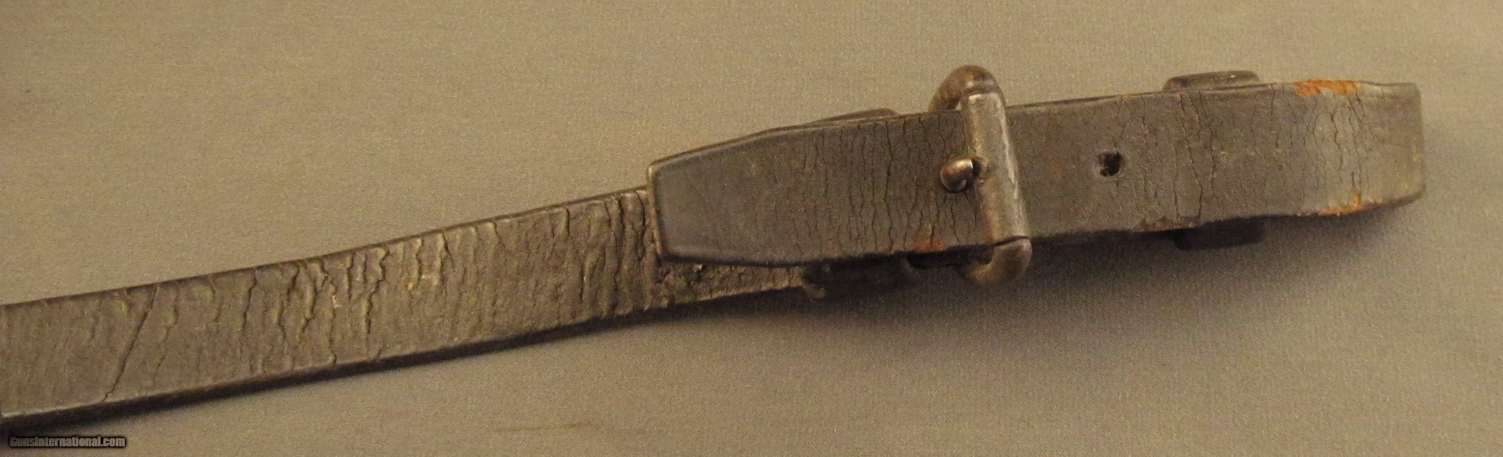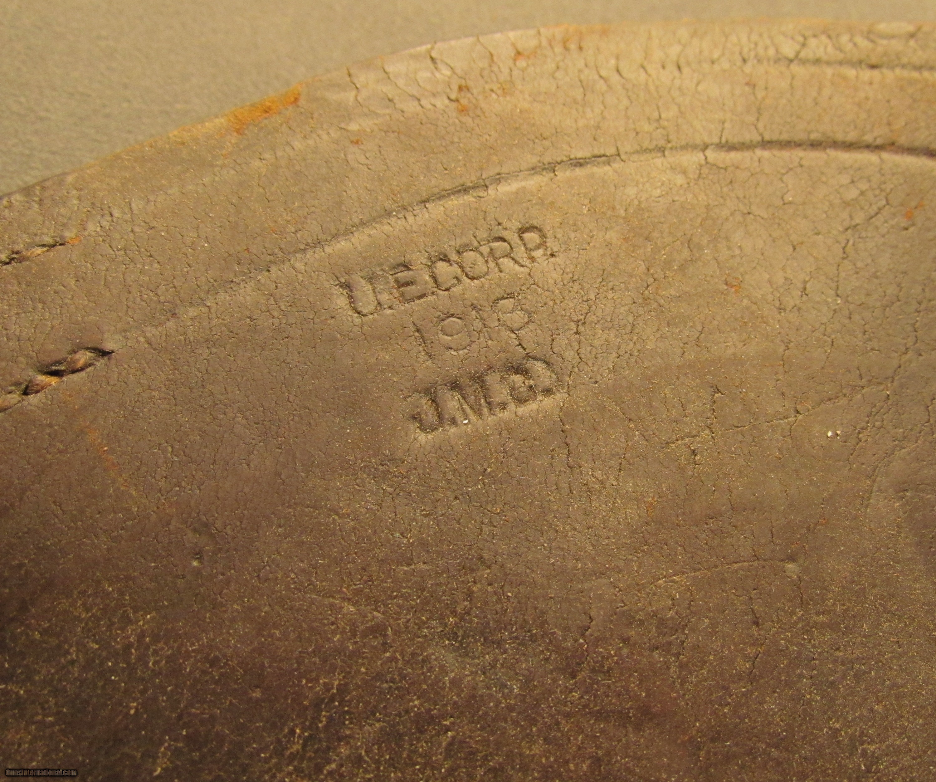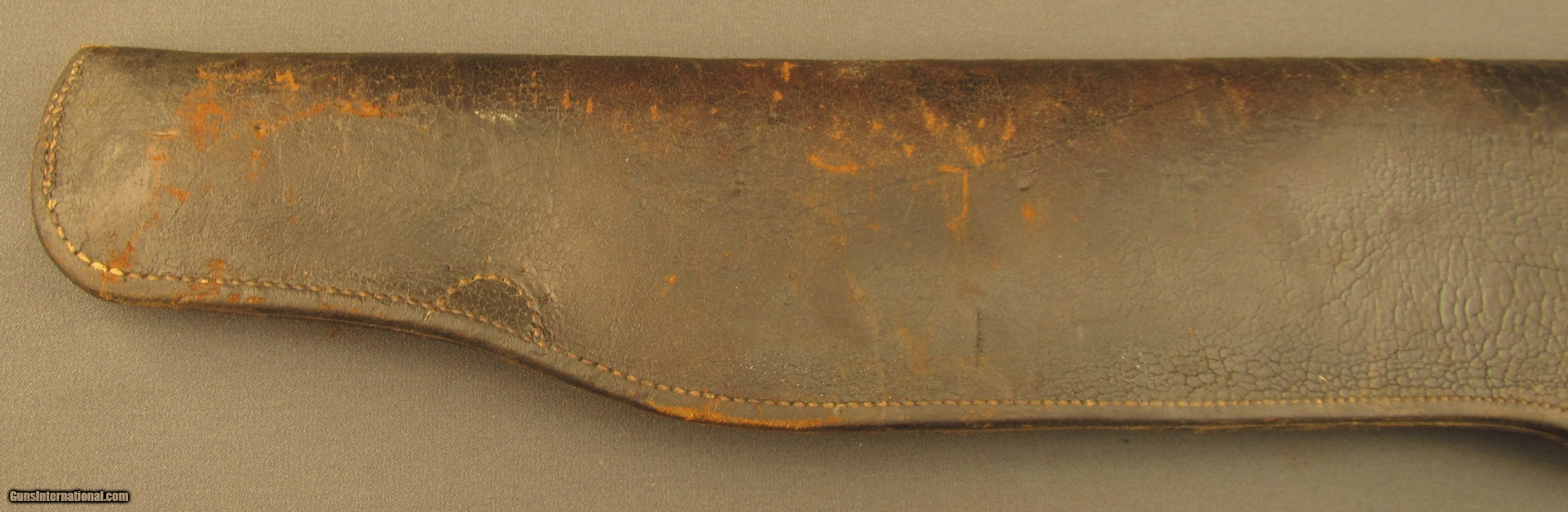 Description: This scabbard is described on pages 421-422 of Brophy's "Springfield '03" book. This is marked "U.E. Corp 1918 JMC" near mouth. Comes with one original strap and one replacement made from black leather. Leather shows light cracking with scuffs and marks from use. A great display item for the '03, cavalry or WWI enthusiast. SOLD Manufacturer: Spfld Model: 1903 |