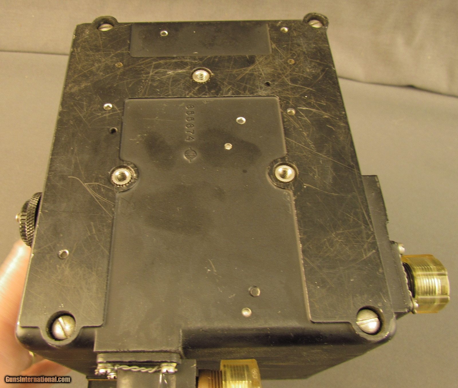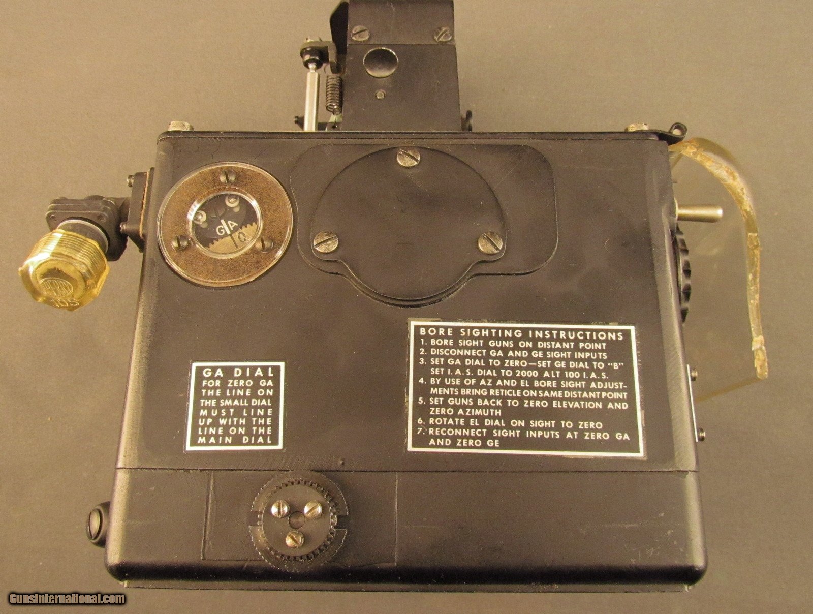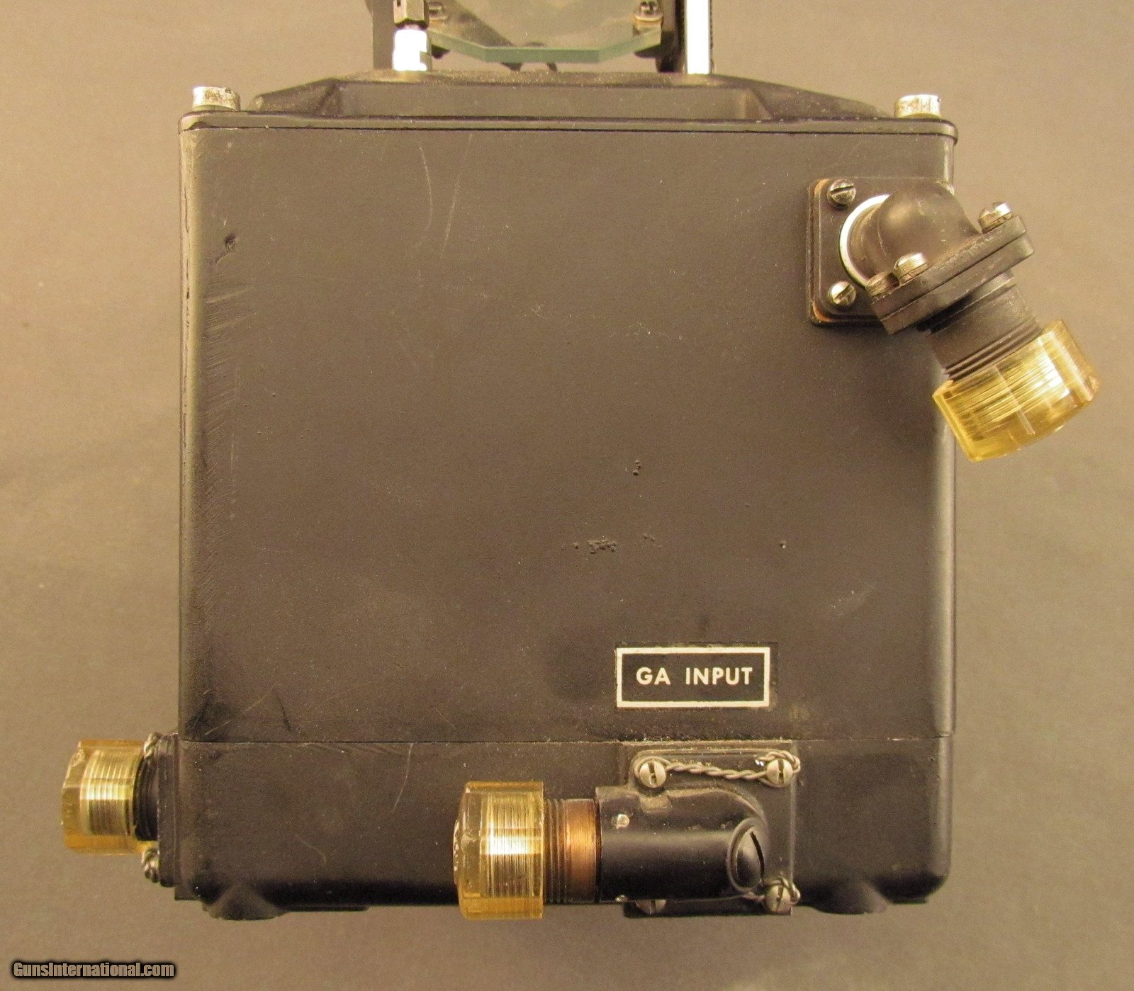 Description: Serial #7202. This is a box-like assembly, manufactured by Sperry Gyroscope Co., which measures 5 1/4" x 8 3/4" x 6 1/4" and has a series of calibration controls on the front face. The top of the assembly has a small angled glass pane for projecting the concentric ring reticle as well as flip-down auxiliary ring and post sights in case of power or bulb failure. The front controls are protected from unintended contact by a spring-loaded acrylic cover (the lower left corner and edge are broken off) and the power inputs still have their original Sperry-marked transparent covers. These sights were used in the nose turret gun emplacements of B-24 Liberator bombers and this example is in fine condition; a great piece of World War II aviation memorabilia. SOLD Manufacturer: USAAF Model: Sight Serial Number: 7202 |