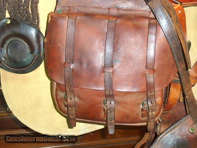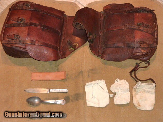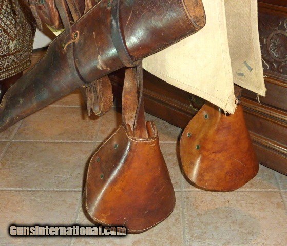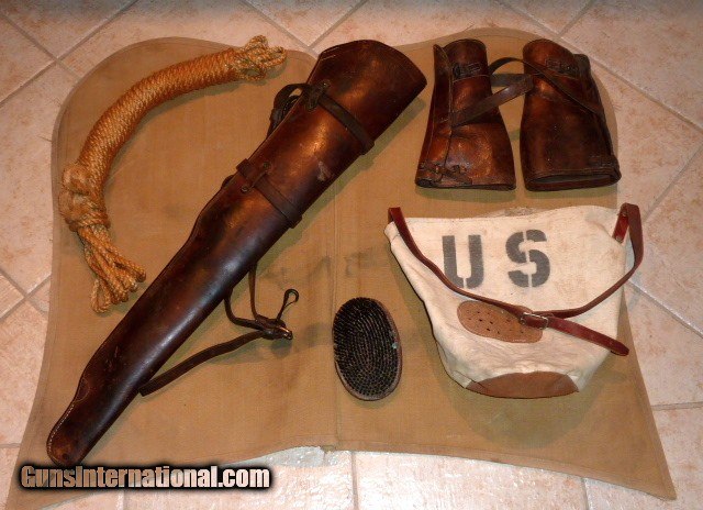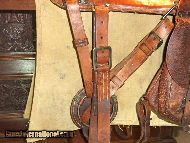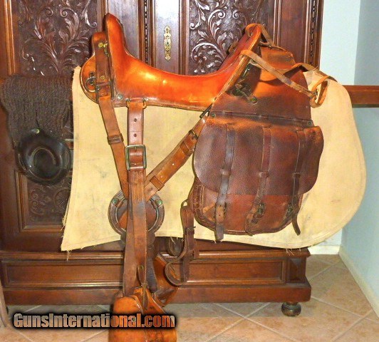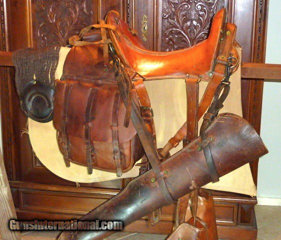 Description: Genuine, 100% original 1918 issued, U.S. Army Cavalry, McClellan saddle. Saddle is in excellent condition, size 11. U.S. marked oak sturrups with leather guards. Sheep skin underside of the saddle is in very good, original condition. Included is the original canvas saddle blenket, marked F Co., 7th Cavalry. Also included are the original saddle bags w/ canvas liners, U.S. marked, in excellent condition, all straps are there. Original soldiers name and Glendale, California address is marked on saddle bag. Original knife, fork, spoon and leather case, (3) condiment bags. Original 1903 Springfield leather scabbard, pair of leather leggings, picket rope, black horsehair cinch, brush and feed bag. This is a beautiful, fully functional, complete, original U.S. Army Cavalry Saddle set. Hard to believe its is over 100 years old. Shipping included to U.S. mainland. SOLD |