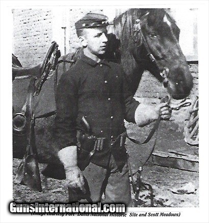 Description: This is a pattern 1885 Prairie belt with a commercial, non-regulation, vintage half skirt holster. The informal adaption of non-regulation gun leather was not uncommon in the Indian-fighting Army. This is a beautiful troopers rig in excellent condition. Matched up with a Colt Cavalry revolver in similar condition would be a great addition to any antique or Military gun room. The belt is a pattern 1885 regulation .45-70 caliber cartridge belt, type 1 with 45 cartridge loops. It is accompanied with a commercial single loop half flap holster. Both circa late 1880's. This rig is nearly identical to one worn in the photo of a Sixth Cavalry trooper at Fort Union, New Mexico in the 1880's (see "Packing Iron" by Richard Rattenbury, page 31) and photo here. The pattern 1885 belt is also on page 48 and in "American Military & Navel Belts" by R. Stephen Dorsey, page 271. The belt has no maker mark but is stamped "6C" for 6th Cavalry (same as the trooper in the photo) and "26" probably an inventory number. The holster is a single loop half flap variety for a Colt SAA with a 7 ½" barrel. Both belt & holster are in excellent lightly used condition. They both show no damage or losses and all the original stitching is in good strong condition. Neither one has been modified. Cavalry revolver in photos not included. We at Clarks Antiques are collectors of original vintage and antique old west gun leather. We have an extensive selection of authentic holsters, belts and leather items for your cowboy era firearms, at our home on line. Search for Clarks Antiques in google. SOLD |