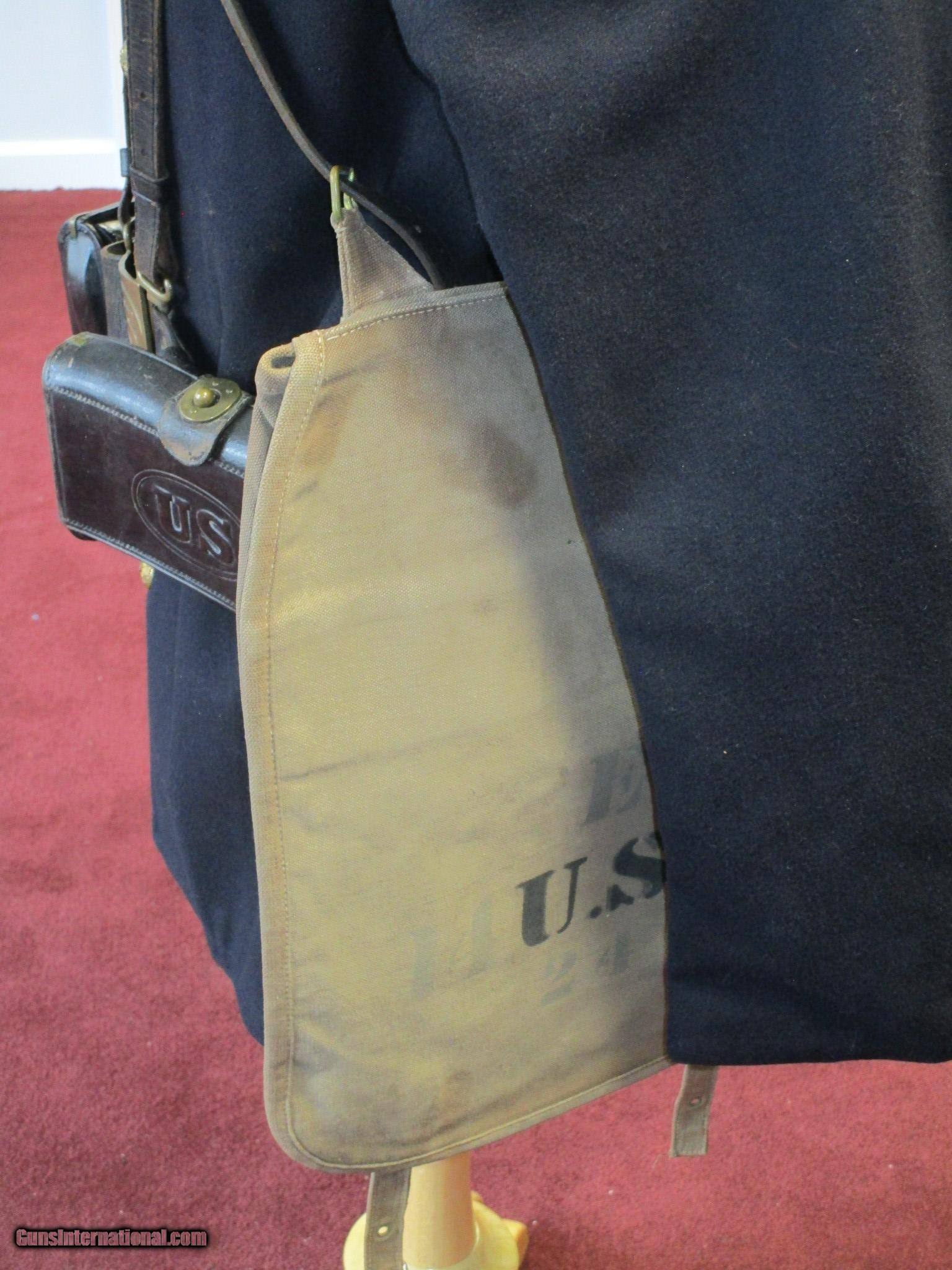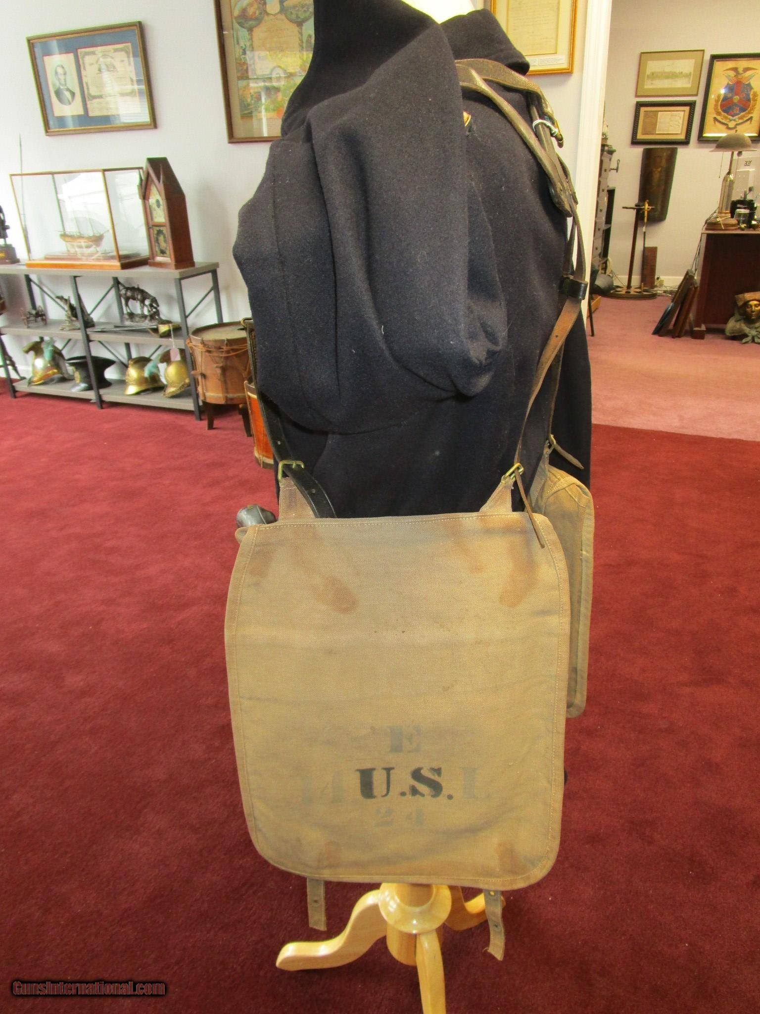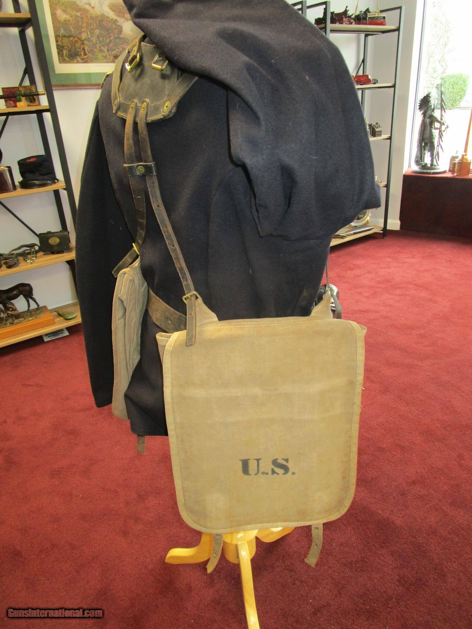 Description: This is an original U.S. Military Indian Wars “Palmer” Brace System ca. 1874. This system is complete as specified in U.S. Army regulations of 1874. Accompanying this system is a pair of 1st pattern flat sided McKeever cartridge boxes. Both haversacks bear the "U.S." stencil. One of the haversacks additionally is stenciled "E / 14 / U.S. / I / 24". Palmer Brace Systems were field-trialed in the 1870's. They were deemed cumbersome by field troops and judged unacceptable. This factor resulted in a very limited production quantity. SOLD |