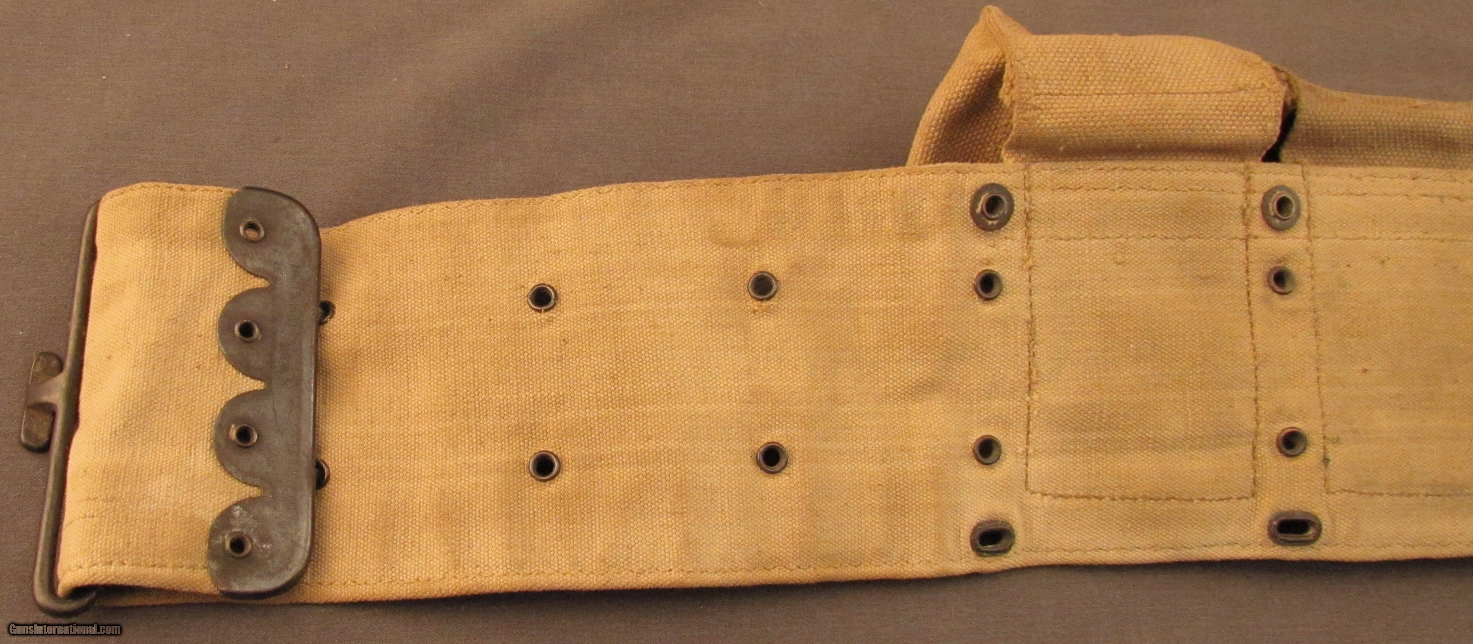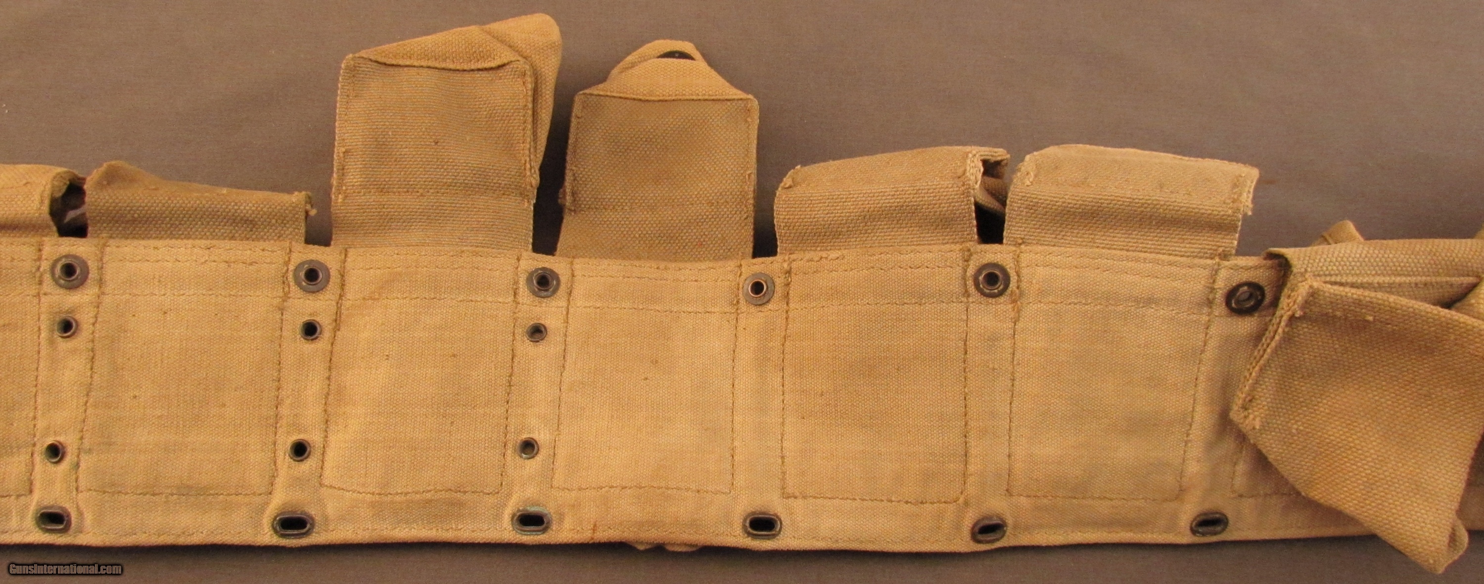 Description: 10 pocket belt marked "DEC 1917/Mills". 'Lift the dot' type snaps. Two of posts have separated from the pockets, but are still attached. Belt is soiled and has some staining. Metal tabs are also marked Mills. Scarce belt for the WWI collector. Condition fair. SOLD Manufacturer: US Military Model: 1910 |
