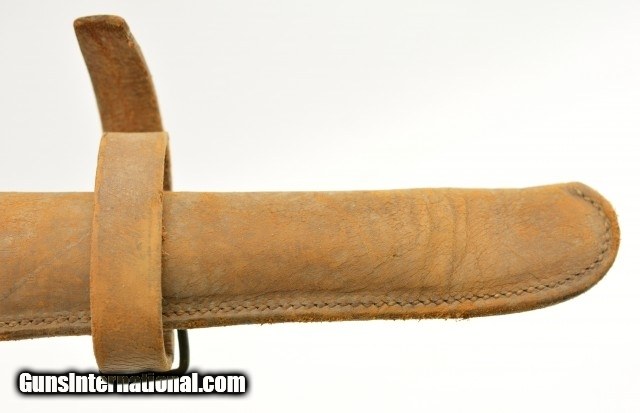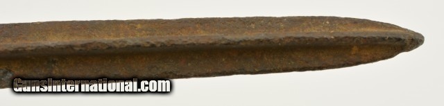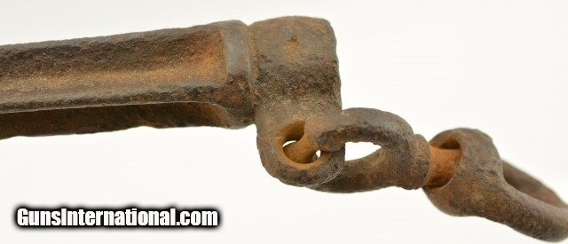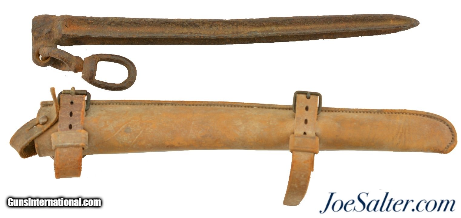 Description: This is a Pattern 1874 US Calvary Picket Pin with a 12" Spike and a leather case. The pin appears that it has spent some time exposed to the elements with heavy corrosion on the cruciform spike and body. The metal rings are still free and would functions as designed. I can find no markings on this pin due to the heavy weathering. The Leather case is in very good original condition with tight stitching and great hardware, buckles and rings. The leather itself is still pliable but getting to the toward the dryer side. Nice original set of Indian war Calvary history. SOLD |