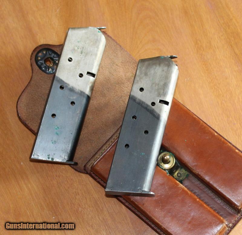 Description: Original U.S. Model 1912 leather 1911 magazine pouch w/ two magazines. Saddle tan/brown pouch in excellent condition showing minor wear, is marked 'Q.M.C. , JEFF. 1922, H.E.K.' Magazine are the proper two-tone and are unmarked as many Colt manufactured magazines were during this period. Don't missing this outstanding military collectible. Payment is to be made with secured funds, bank check or money orders. No credit cards. Shipping & handling is FREE for this item- USPS. SOLD |