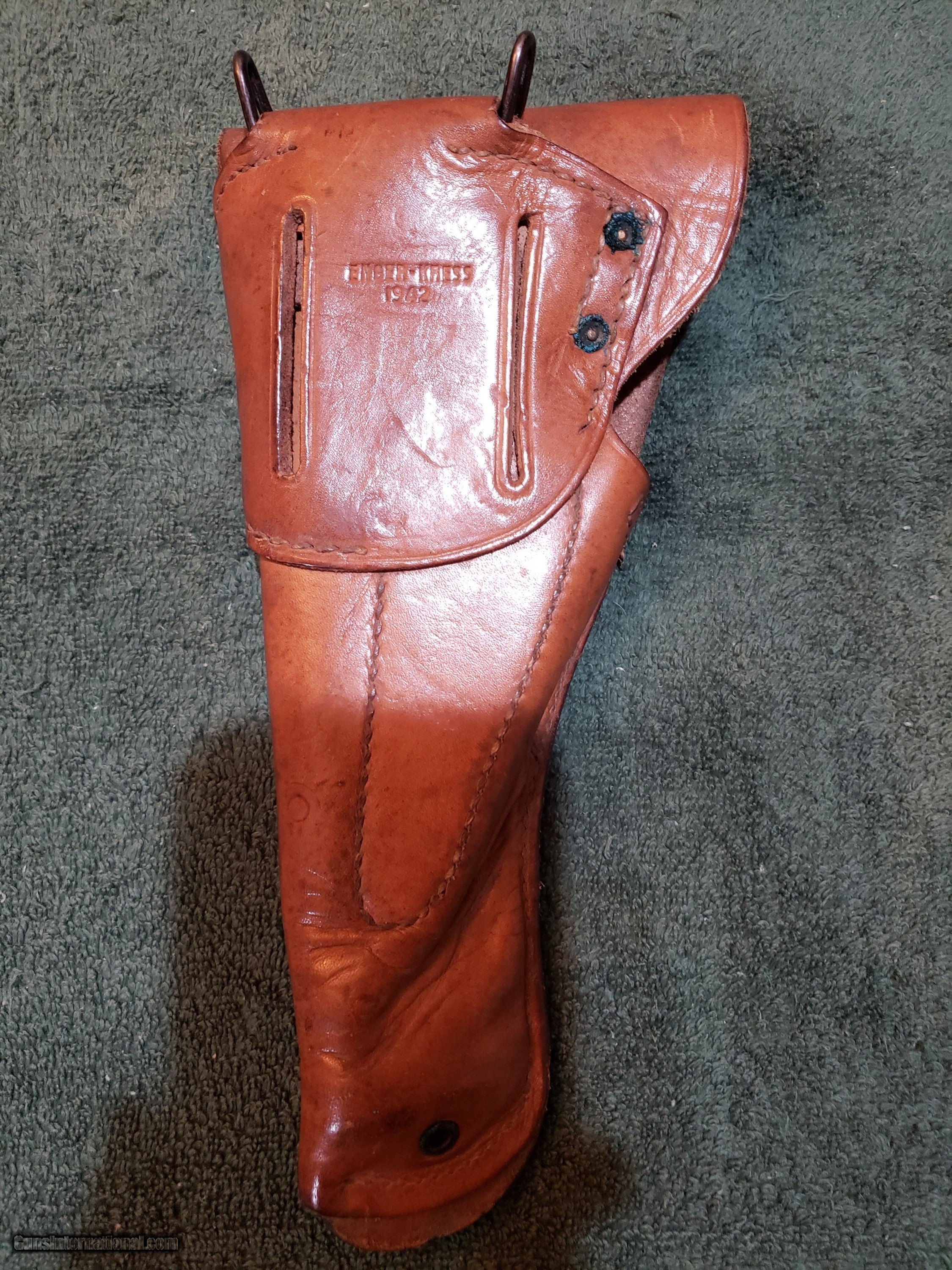Description: SPF RH Original Enger-Kress U.S. WWII M1916 Colt 1911 brown Leather Holster dated 1942. Nice condition. Price firm includes shipping. Sold pending funds. SOLD |