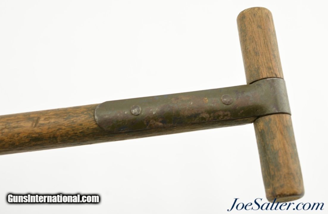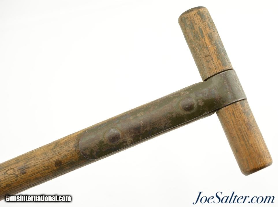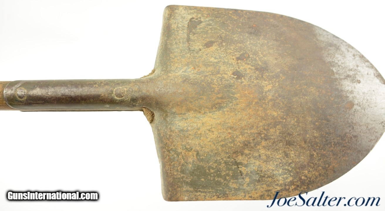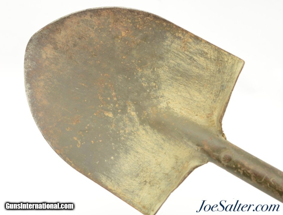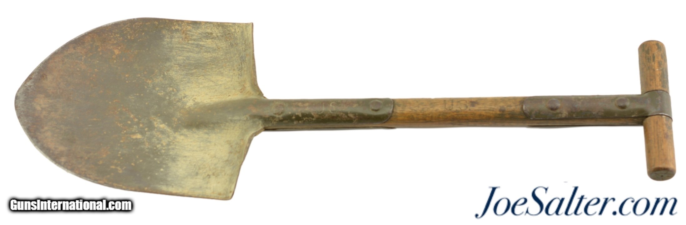 Description: This is an original US M1910 T-Handled shovel as issued in WW1. The M1910 T-handle, had a sheath that could be carried on a belt or backpack. This example has US stamping's on the metal and the wood shaft with wood corners wedges. Nice patina with some of the original paint, looks to have been issued and used. No cracks in the turned wood handle or shaft. SOLD |