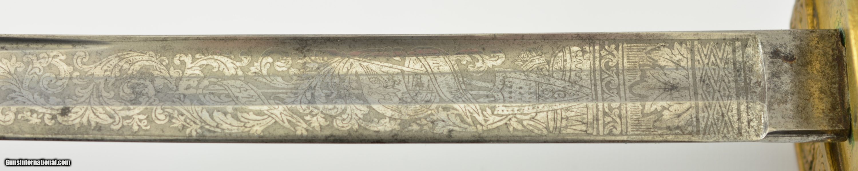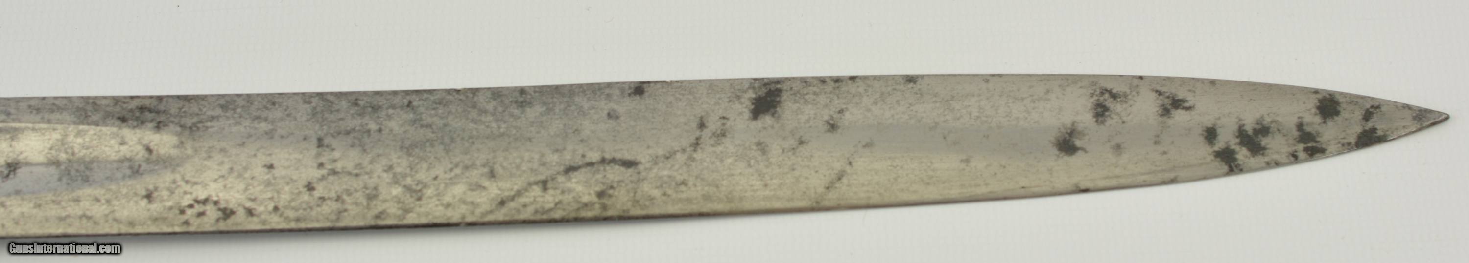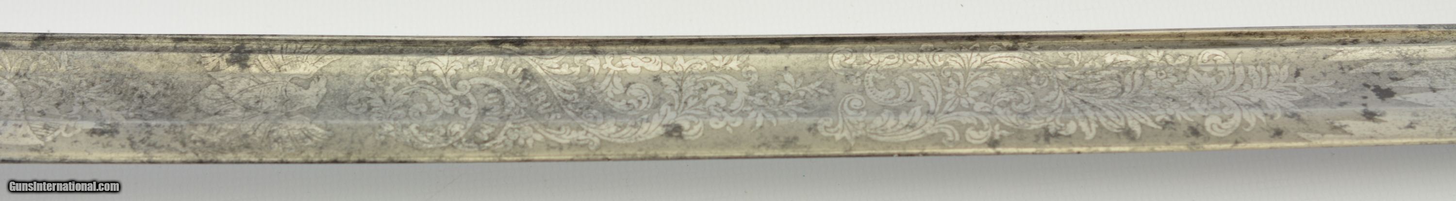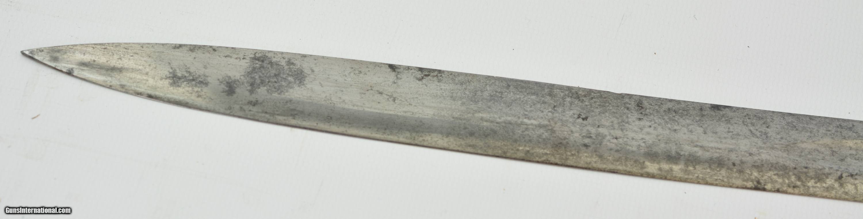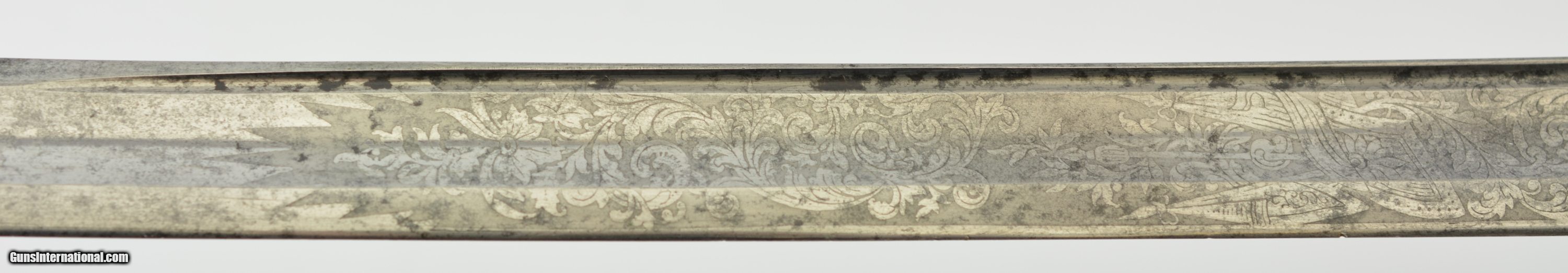 Description: This is a rare sword that measures 37 1/2" overall, with a 31 1/2" slightly curved, single-edged blade having wide and narrow fullers. The blade has large etched panels with foliate scrollwork and patriotic motifs including the American Eagle, “E PLURIBUS UNUM" in riband, panoplies of arms, and US shield. The bottom of the obverse panel features the maker’s mark: “Schnitlzer / Kirschbaum / Solingen" in Gothic script. The base of the spine is etched “IRON PROOF". The blade rates very good plus with an overall pewter gray patina having dark spots of freckling throughout, heaviest towards the tip. Additionally, there are a few minor nicks along the blade edge. The brass hilt has a typical pierced floral counterguard with single, forward-swept quillon, shagreen grip with intact braided wire wrap, and a Phrygian helmet pommel with a floral button capstan. The brass has tarnished to a yellow-ochre patina with some brighter spots on protected areas. The leather scabbard exhibits light crazing and flaking along its length, along with tarnish on the brass furniture. Also included is a period bullion sword knot that rates very good condition with some minor wear and a few old creases. Schnitzler & Kirchbaum officer swords are not often seen, and this is a fine example of one of the rarer import Model 1850 Foot swords. SOLD Manufacturer: US Military Model: Sword |