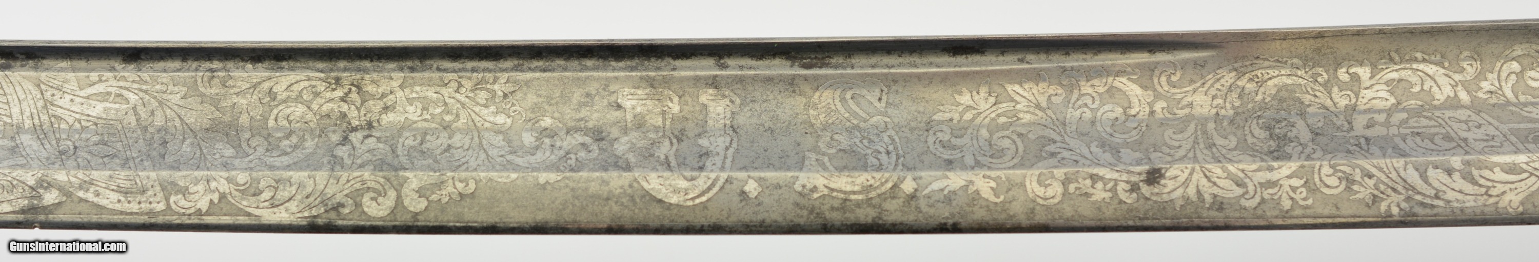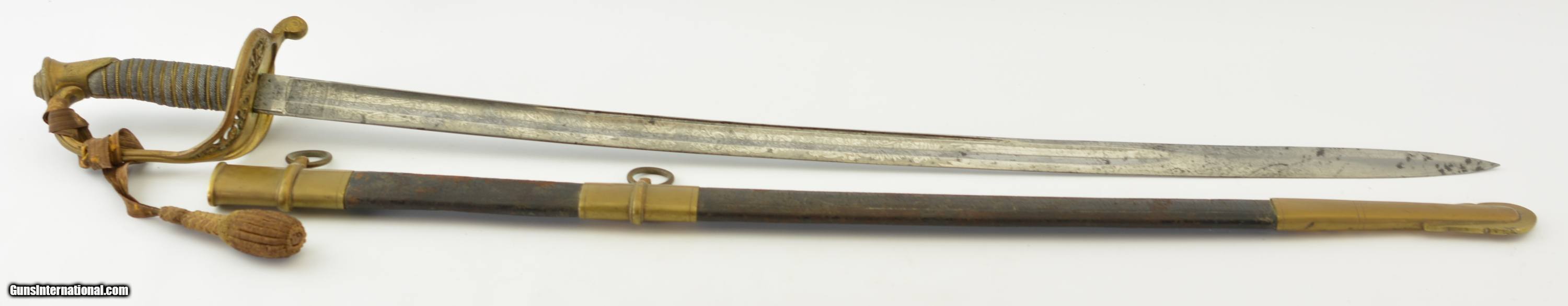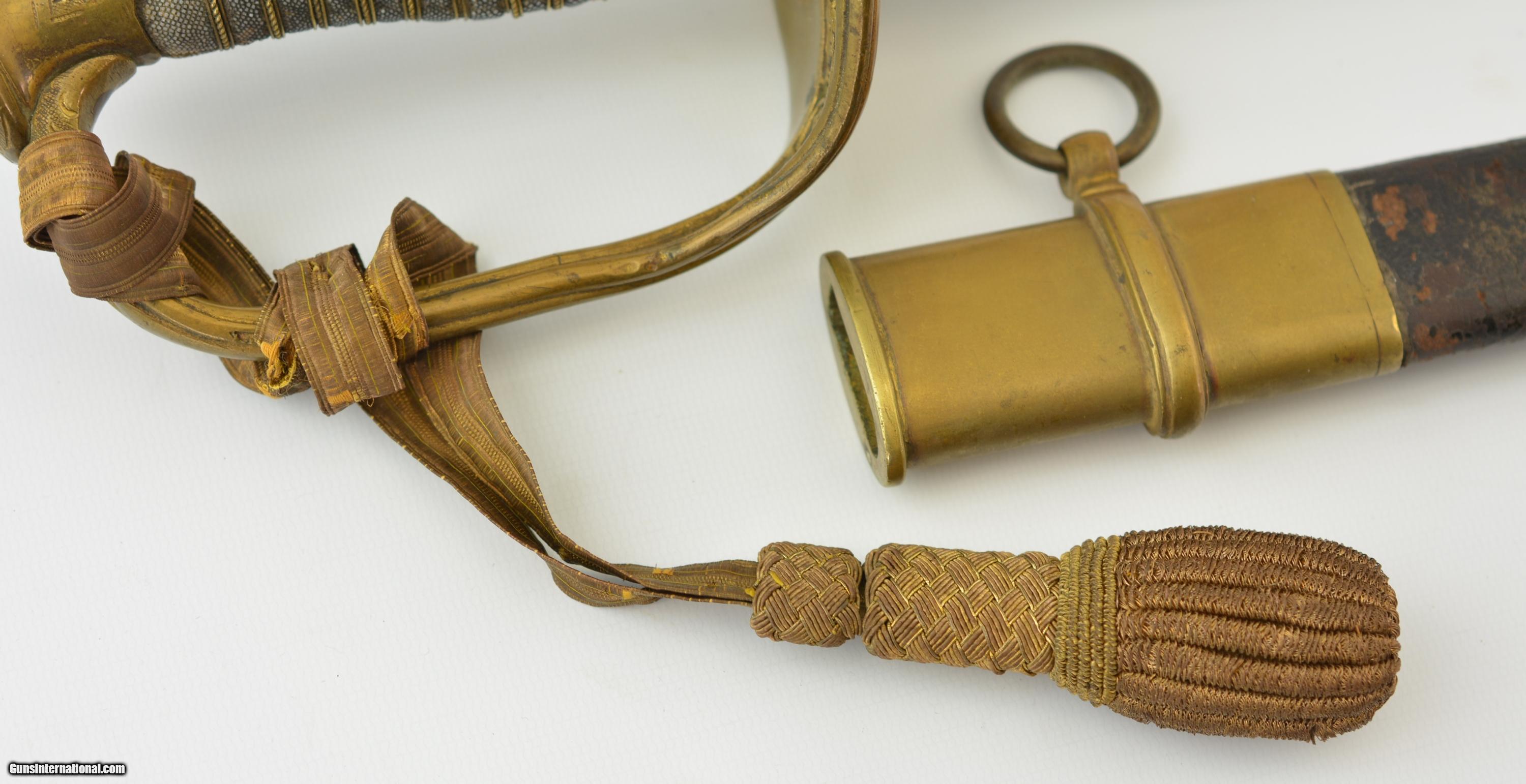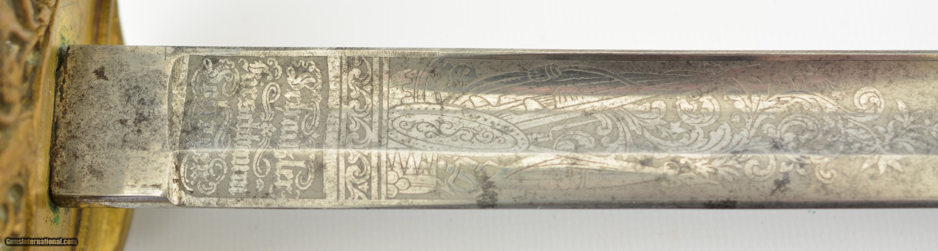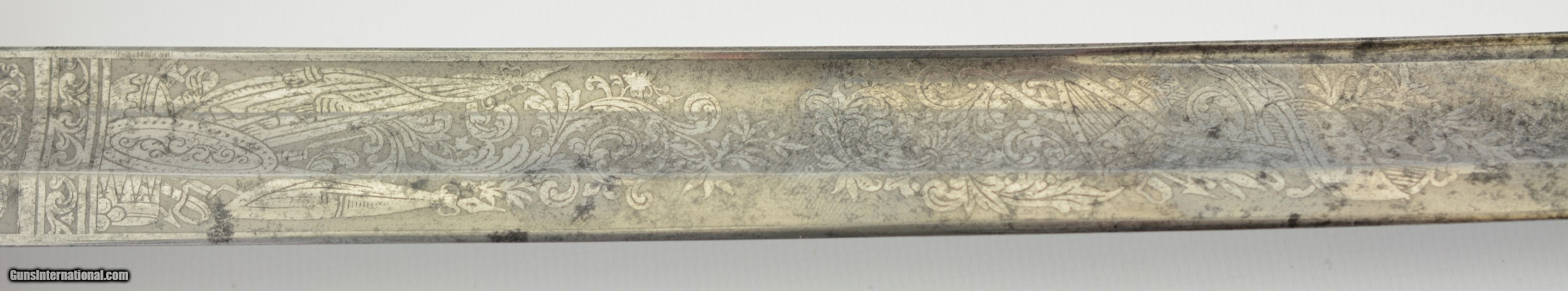 Description: This is a rare sword that measures 37 1/2" overall, with a 31 1/2" slightly curved, single-edged blade having wide and narrow fullers. The blade has large etched panels with foliate scrollwork and patriotic motifs including the American Eagle, “E PLURIBUS UNUM" in riband, panoplies of arms, and US shield. The bottom of the obverse panel features the maker’s mark: “Schnitlzer / Kirschbaum / Solingen" in Gothic script. The base of the spine is etched “IRON PROOF". The blade rates very good plus with an overall pewter gray patina having dark spots of freckling throughout, heaviest towards the tip. Additionally, there are a few minor nicks along the blade edge. The brass hilt has a typical pierced floral counterguard with single, forward-swept quillon, shagreen grip with intact braided wire wrap, and a Phrygian helmet pommel with a floral button capstan. The brass has tarnished to a yellow-ochre patina with some brighter spots on protected areas. The leather scabbard exhibits light crazing and flaking along its length, along with tarnish on the brass furniture. Also included is a period bullion sword knot that rates very good condition with some minor wear and a few old creases. Schnitzler & Kirchbaum officer swords are not often seen, and this is a fine example of one of the rarer import Model 1850 Foot swords. SOLD Manufacturer: US Military Model: Sword |