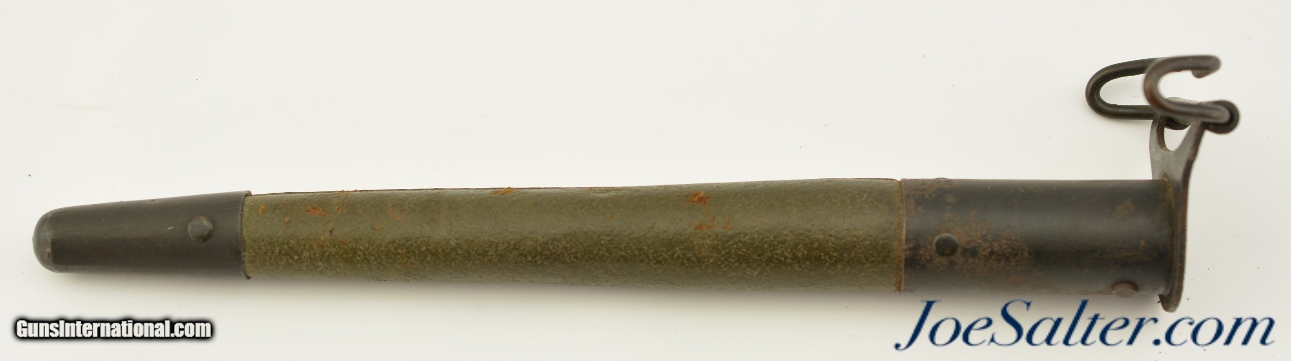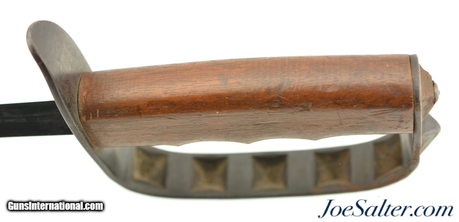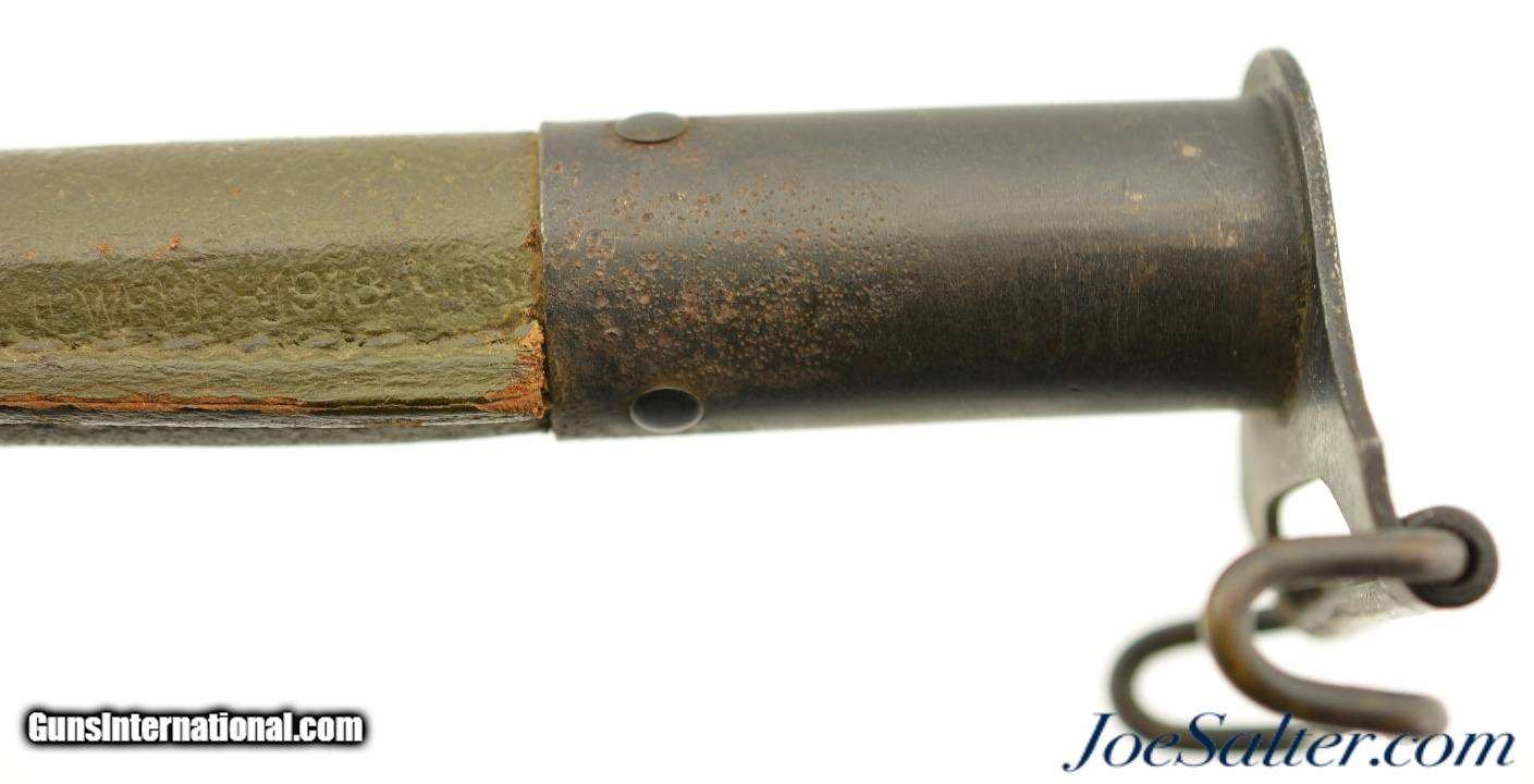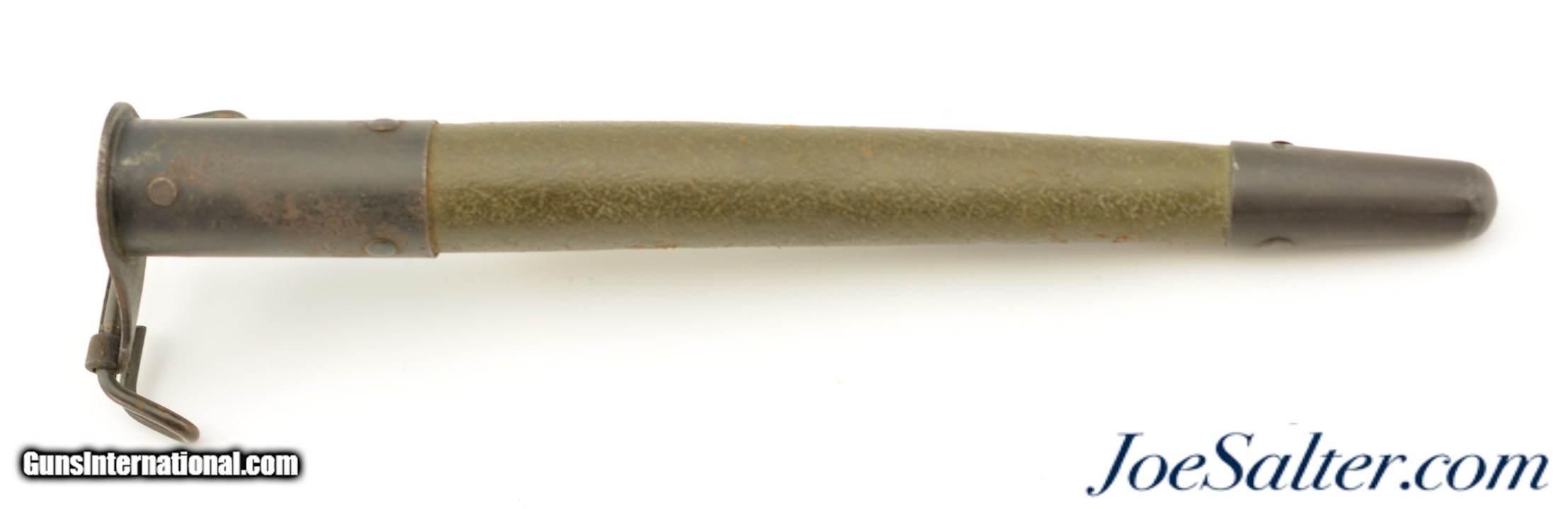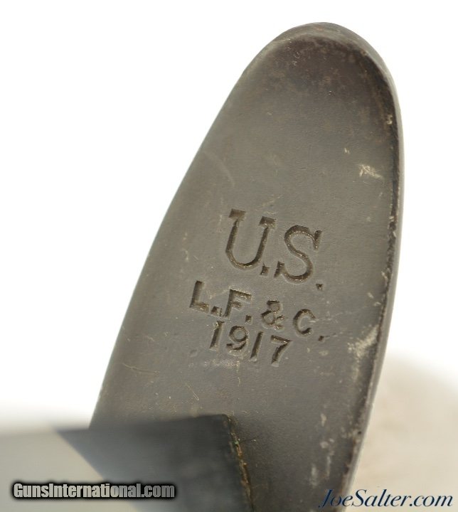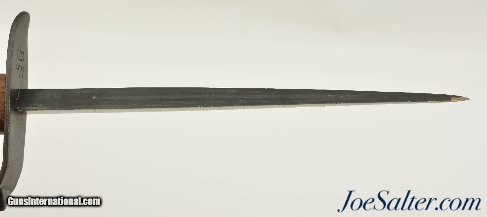 Description: This formidable knife measures 14" overall with a 9" straight, angular blade. The blade retains 95-97% of the original blued finish that has silvered slightly along the centers of the facets from contact with the scabbard, and has a bright metal tip where the blade was machined slightly, possibly in order to straighten the point. The hilt has the pyramidal type "D"-guard with large "U.S./L.F.&C./1917" stamp on the front of the quillon, and has mild ruddy-brown freckling at the bases of the pyramidal projections, with about 85-90% of the original blued finish remaining on the balance. The finger-grooved wooden grip has a few minor surface scratches and light blemishes in the original oil finish, heaviest near the pommel. The "JEWELL 1918" marked scabbard is in very good shape and has a commensurate amount of the original blue on the lightly freckled throat and riveted chape. The leather body has light-moderate surface scuffs and retains much of the original olive green paint. This is a very nice Landers, Frary & Clark-made trench knife, and is in fine-near excellent condition overall.; SOLD |