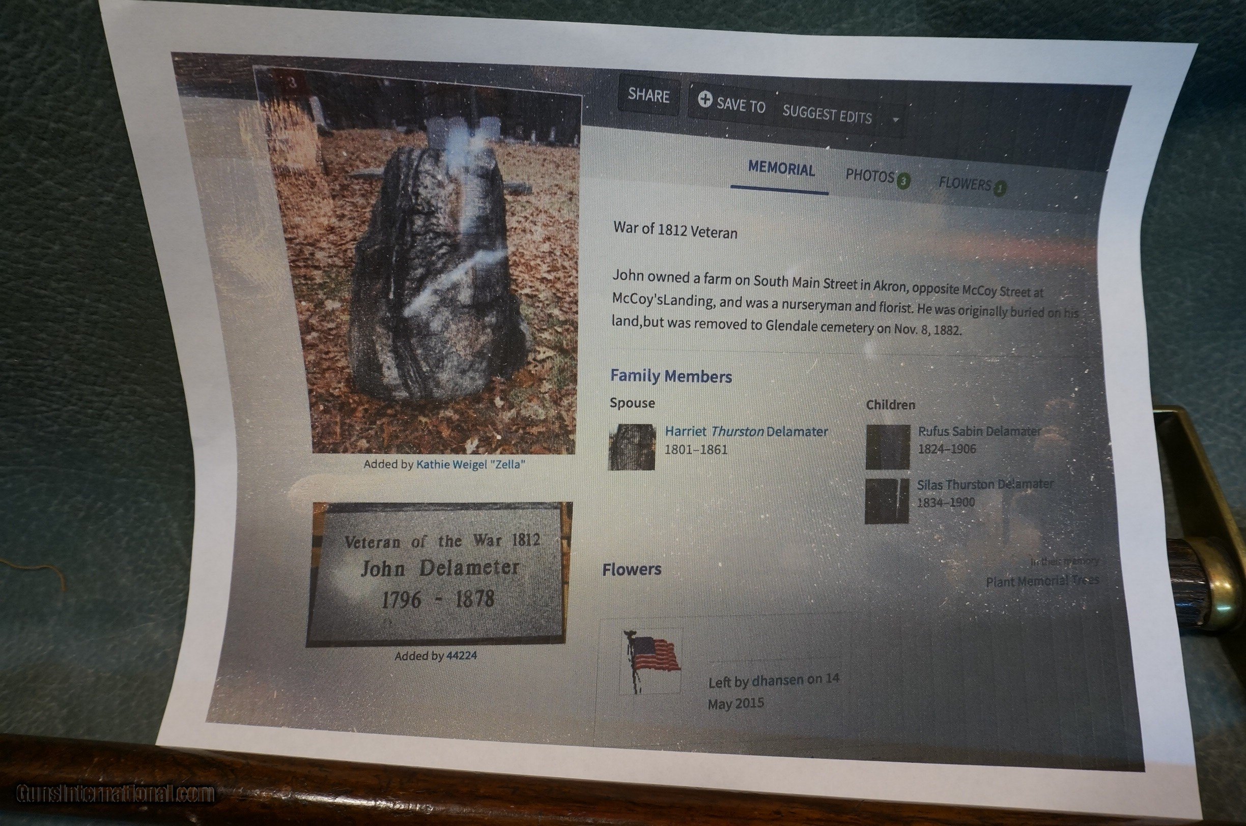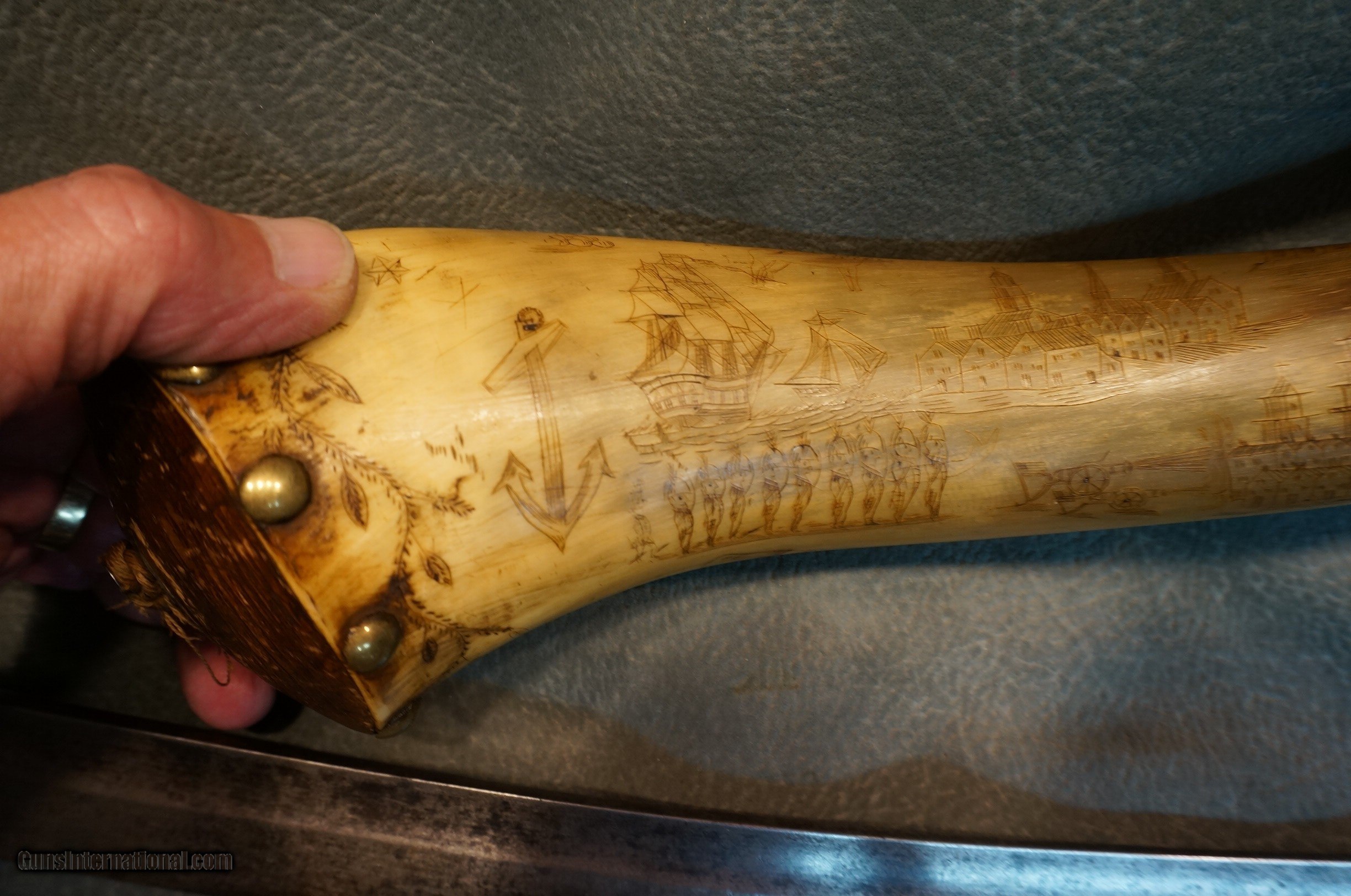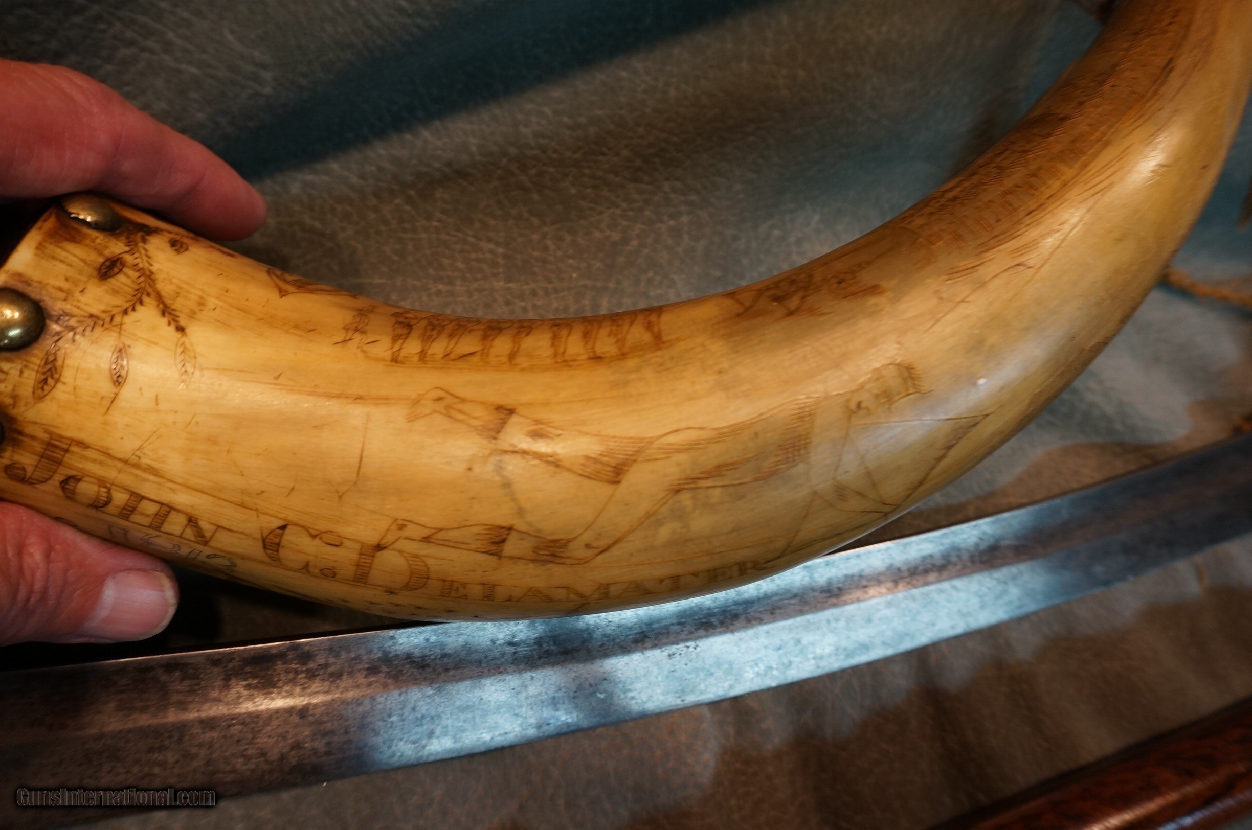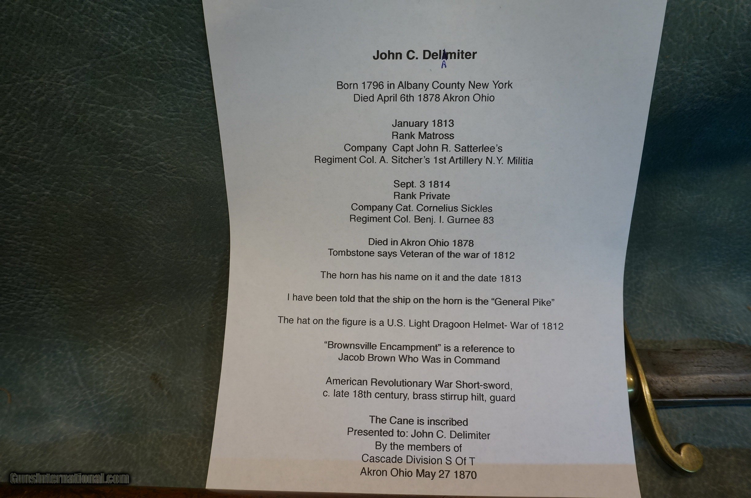 Description: War of 1812 Veteran’s powder horn,sword and walking stick,John Delameter served from 1 with the New York Militia,born 1796 died 1878.Great history!!! SOLD |