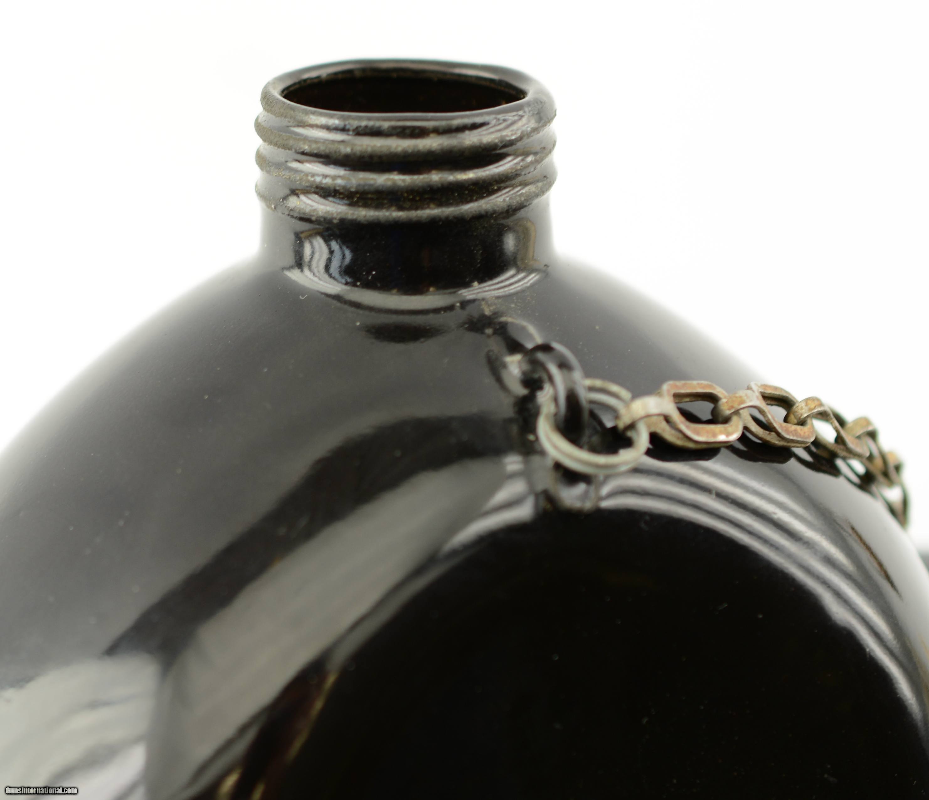 Description: This is a fairly scarce original US Model 1942 porcelain or enamel canteen marked in a circle on the bottom "US/USS Co and dated 1942". There are 2 chips to the material; a thumbnail sized chip on the bottom and a smaller chip on the side. The chain remains intact and the cork is in the cap. A very nice example for your collection. SOLD Manufacturer: U.S. Military Model: Canteen |