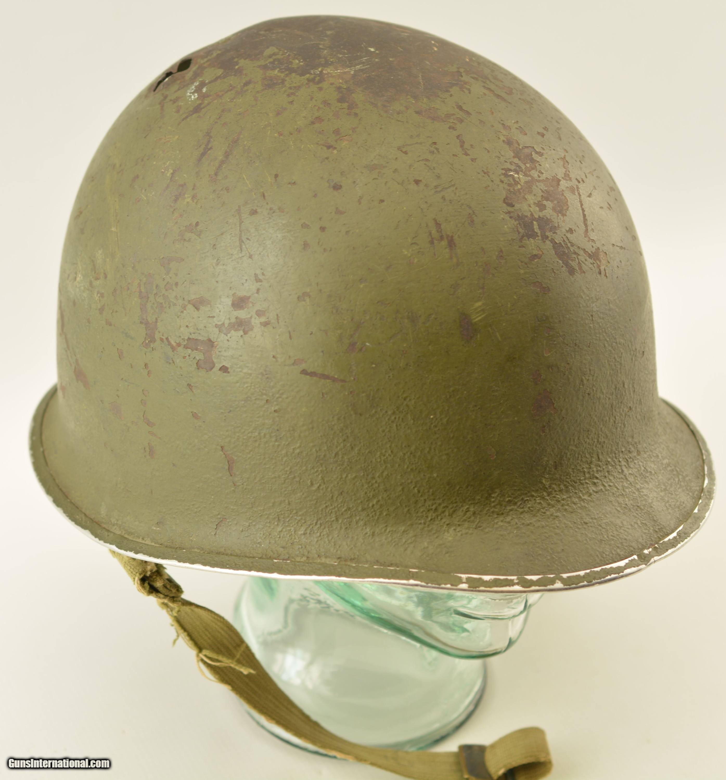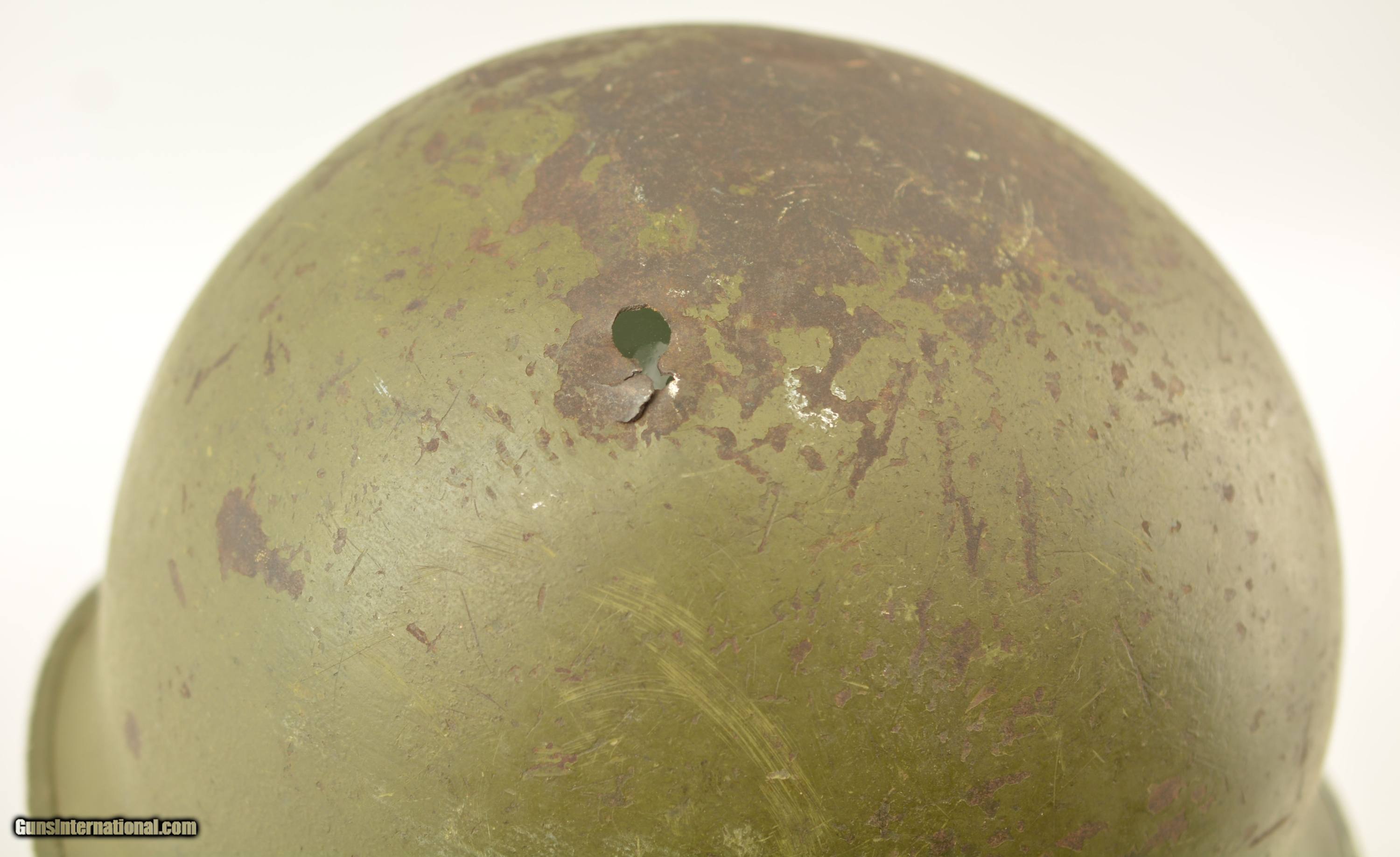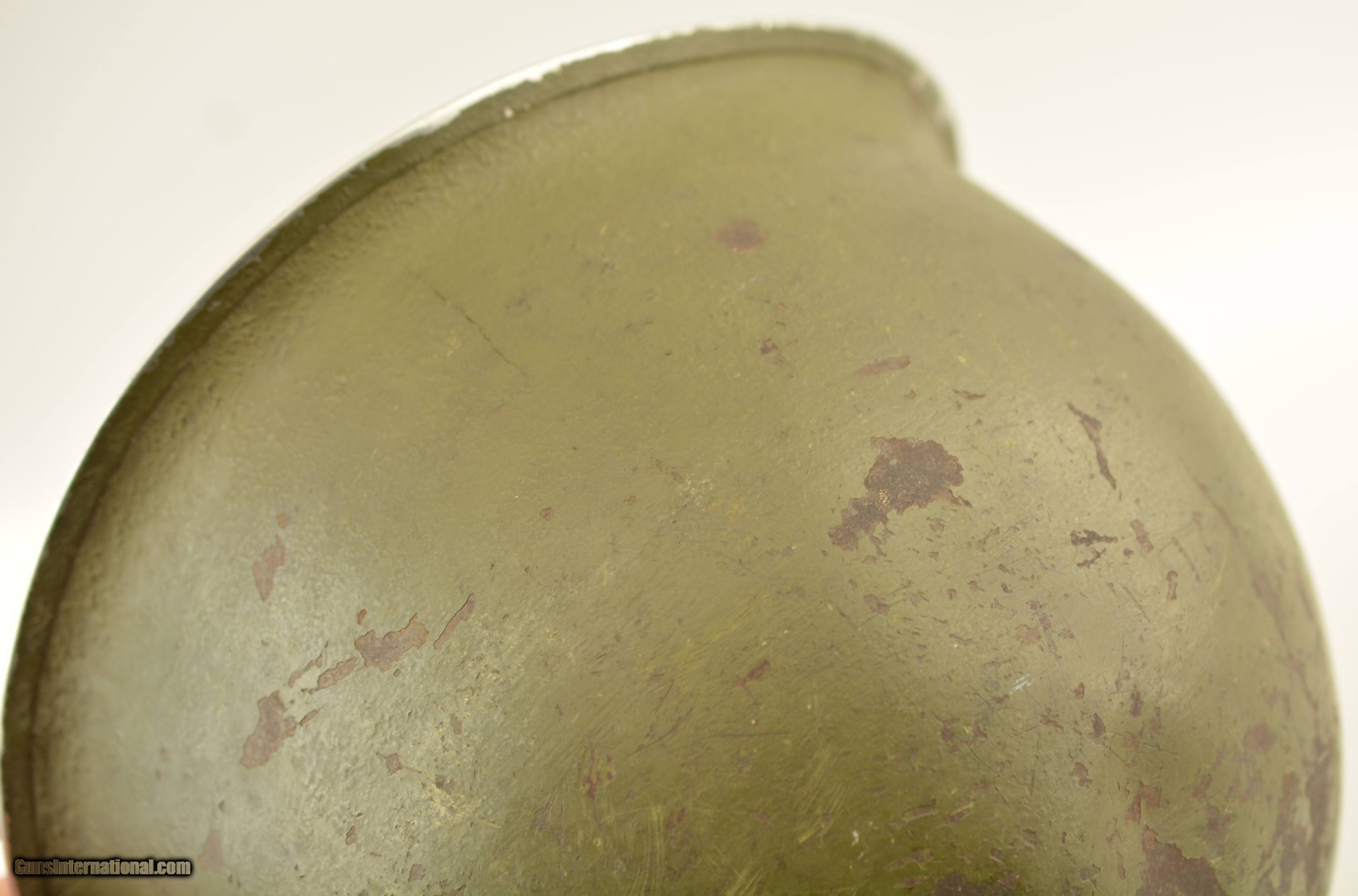 Description: This is a very early (1941 to 1943) WWII, US M1 helmet with fixed bale and earliest type brass fixture chin strap. This front seam helmet has the early spot welds and characteristic paint loss on the outer edge (an issue they fixed in later production). The helmet is in battle used condition with a shrapnel hole and dent in the top. The helmet has about 70% of the original green paint with rough cork finish. The top of the helmet has numerous dings and areas of paint loss from the multi-purpose use as a wash basin, seat and other battlefield necessities. The original chin strap is wel worn and remains attached with about a third of the original stitching – a common wear issue for the fixed bale model. This is a great early helmet that has seen use on the battlefield. SOLD Manufacturer: US Military Model: Helmet |