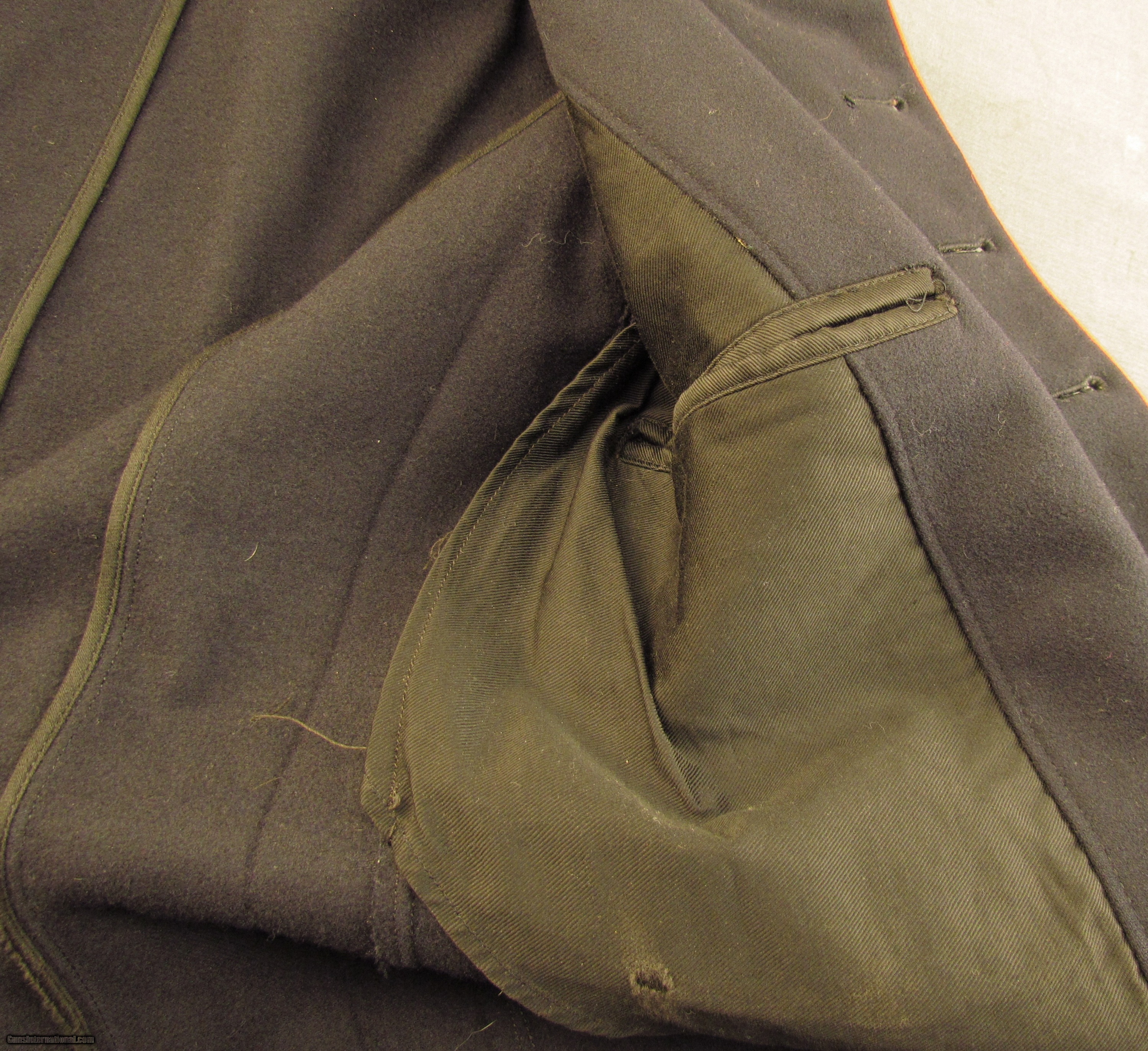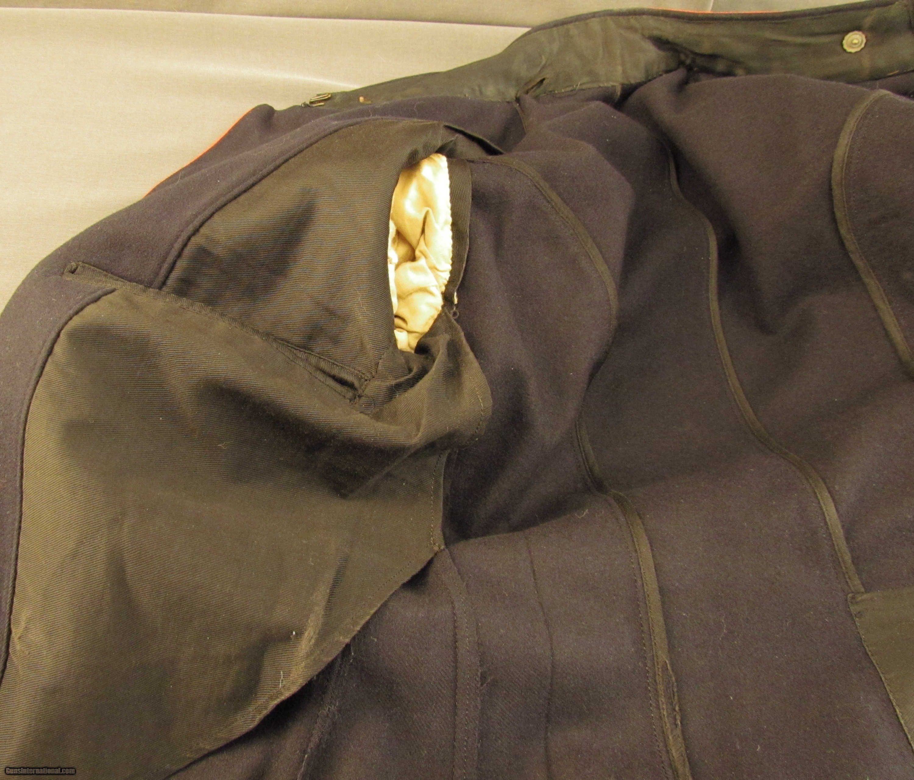 Description: U.S.M.C. dress tunic marked Quartermasters Dept U.S. Marine Corps 1941-42 4-M ink stamp left sleeve liner. This piece is in good plus condition with corporal rank and collar insignia. There are a few moth nips on the lower front. Nice WWII sample. SOLD Manufacturer: US Military Model: Uniform |