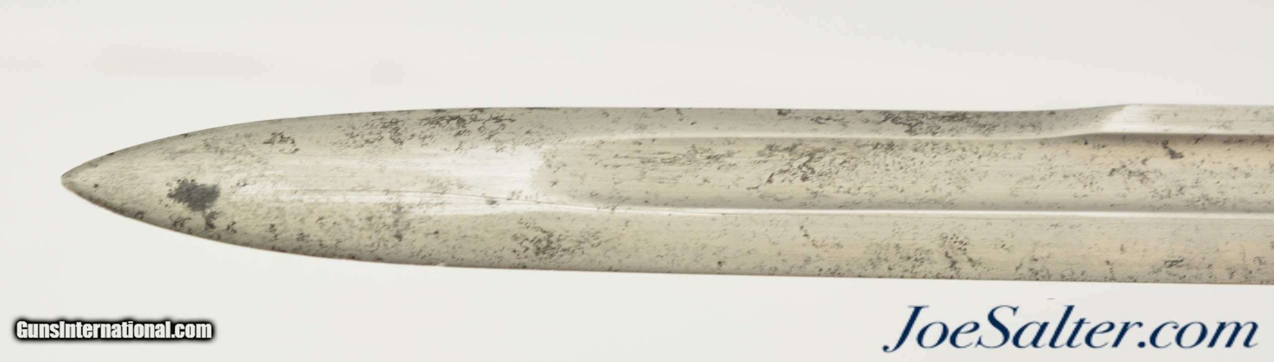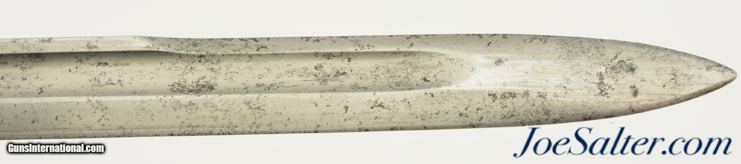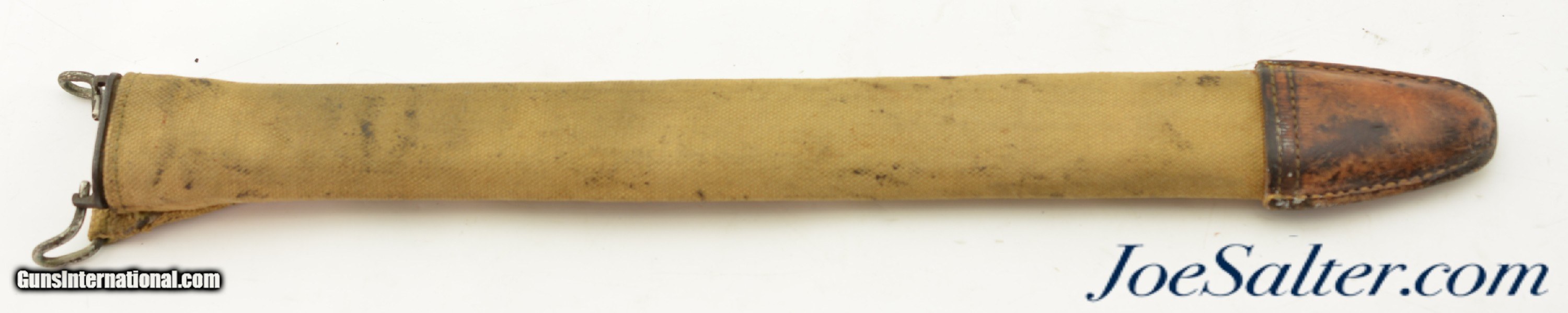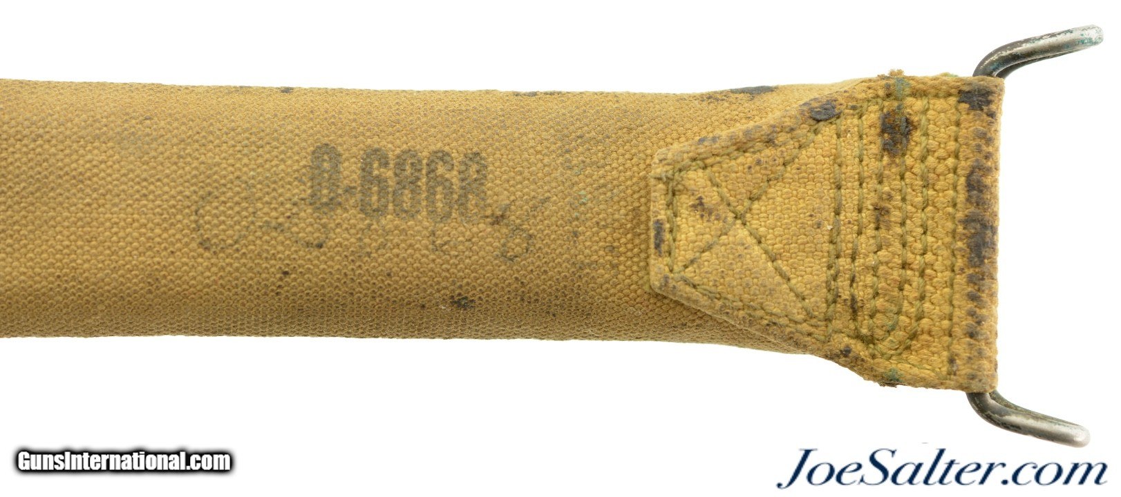 Description: This bayonet was manufactured in 1909 by the Rock Island Arsenal. The 15 7/8" unsharpened blade is bright with specked finish in very good condition, no chips, nice tip. The ricasso is marked with the "RIA flaming bomb and 1909", reveres is marked "US 149034" The guard and pommel show handling and use marks with some oxidation. The handle appears the original wood scales with a light patina. Locking mechanism works fine and attaches correctly to scabbard and rifle. This M1910, stamped "0-6868" also hand written "0-6868" and stamped with an unknown line of 4 or 5 letters, scabbard is in very good condition with intact and correct leather over wood interior and nice canvas cover free from tares and minor age soiling.; Price: $550.00 Contact Seller |