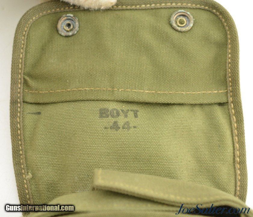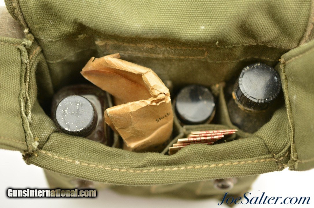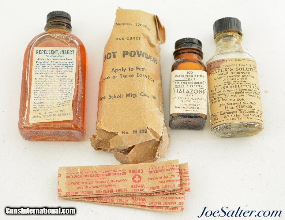 Description: This is a very nice, incomplete, Kit, Jungle, Medical, Individual, M-2 housed in an excellence 1944 Boyt made pouch. It contains: 4 White cross adhesive bandages, 1 full bottle of Insect Repellent, 1 full bottle of Halazone, 1 empty bottle of Frazer's Solution and a near empty packet of foot powder. A must for any collection.; Price: $195.00 Contact Seller |