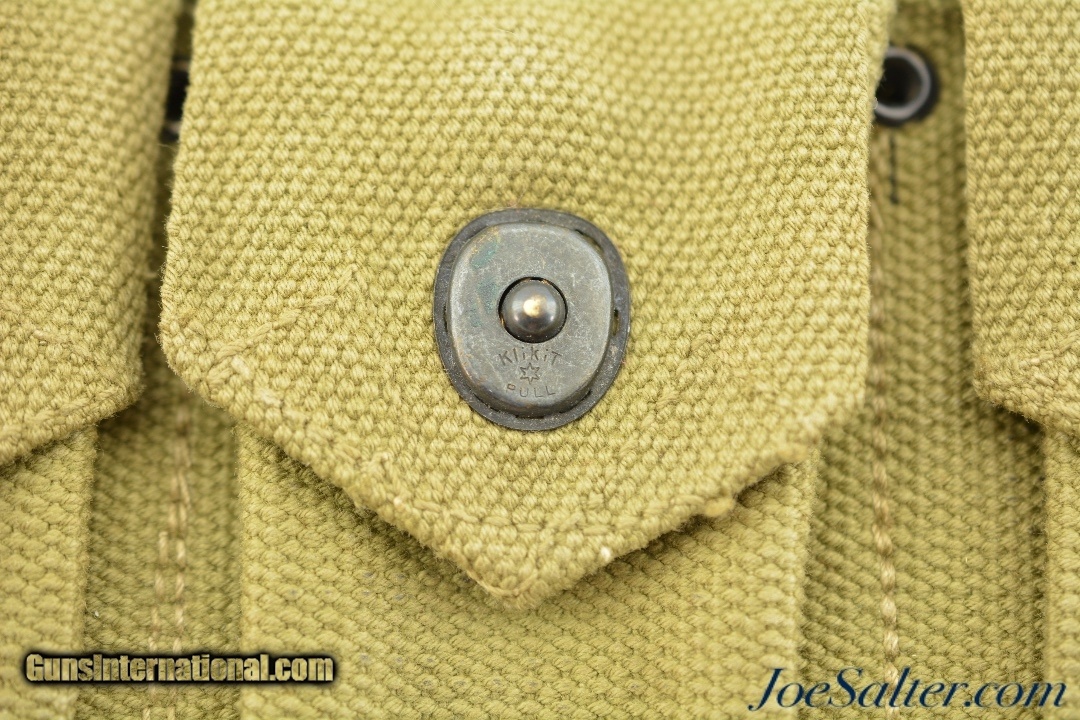 Description: This is an original original khaki early WWII U.S. Army / U.S. Marine Corps (USMC) M1923 dismounted cartridge belt, made by the Burlington Mills Company in 1943. It is in excellent condition showing only some slight soiling from storage. The belt is made of khaki cotton canvas, it is marked " U.S. " on the front, and is stamped with the manufacturer's name and date on the back, "BURLINGTON MILLS, Inc. 1943". Metal hardware on the belt is blackened brass, except for main buckles, those are black-painted steel. Snaps are "lift-the-dot" type, inside straps have blackened brass snaps. SOLD |