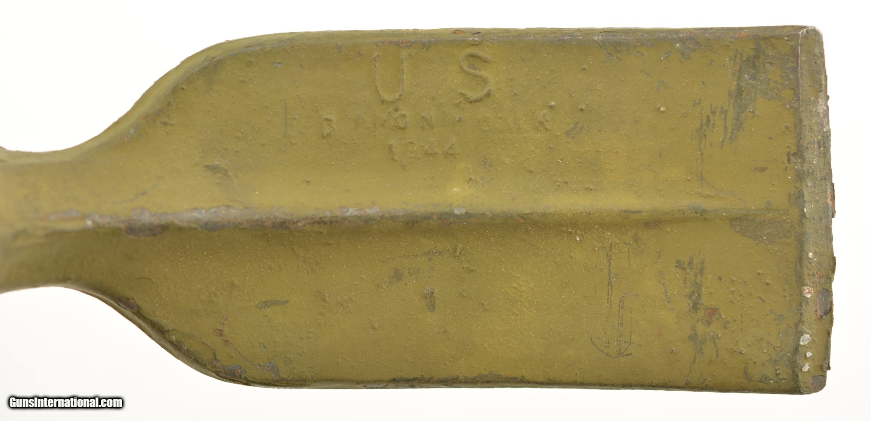 Description: This is a fine example of a US Army M1910 Pick and Mattock Set. The cast head is in excellent condition which appears unused with only storage marks and age soil. The manufacture is there but I can't make it out, is clearly stamped US 1944. The canvas carrier was manufactured by J.A. Shoe marked 1944, unit is in excellent original condition. The green wooden handle is original and is marked US. SOLD |