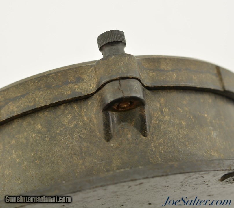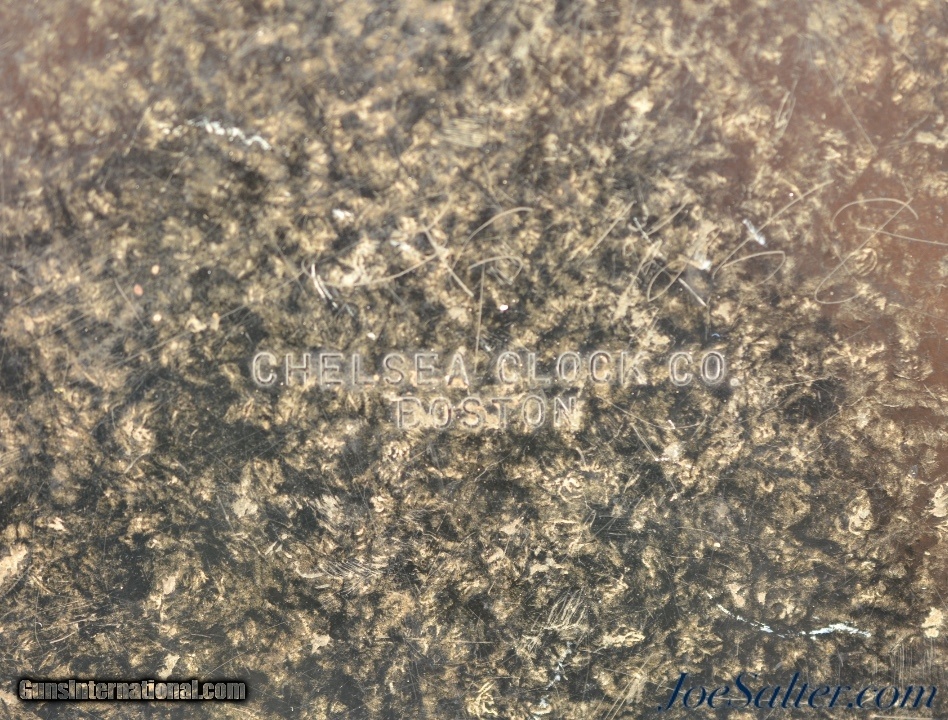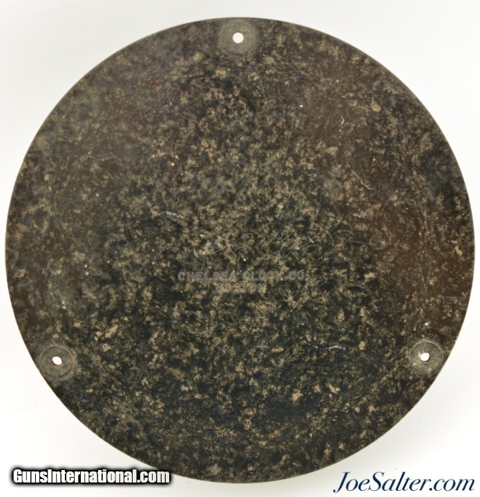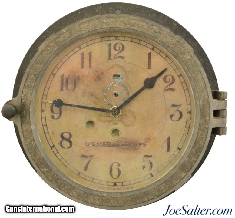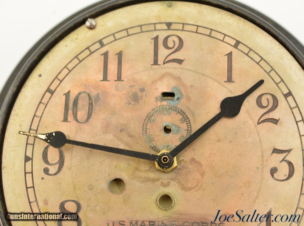 Description: This is an original WWII USMC Bakelite Wall Clock made by Chelsea Clock Co, Boston Massachusetts. This clock has had the original winding works removed and an electric movement installed. It has a great patina and is in very good condition. There is a little scuffing in the area of the U.S. Marine Corps on the face. The face, glass and case all appear original and unaltered. Takes one C battery and no winding. Price: $145.00 Contact Seller |