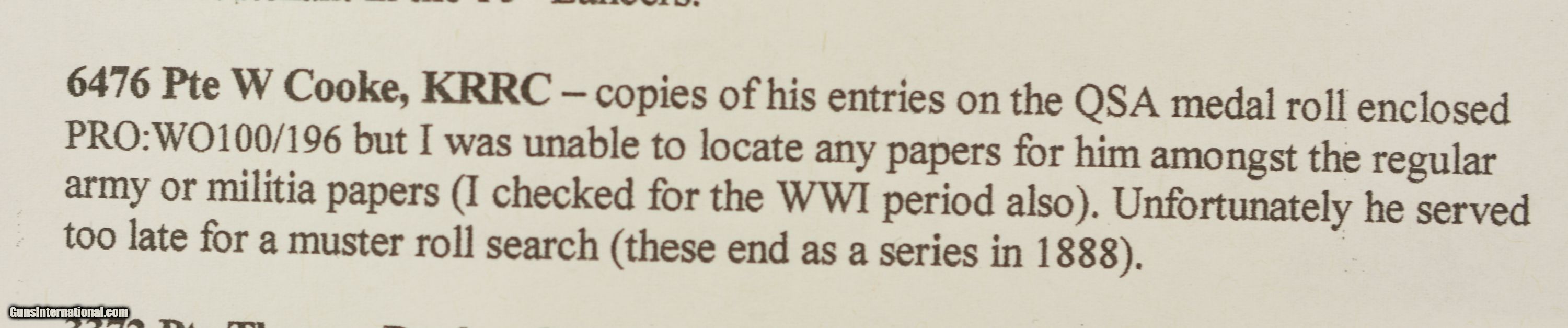 Boer War South Africa Medal and Clasps of Pvt. W. Cooke, KRRC