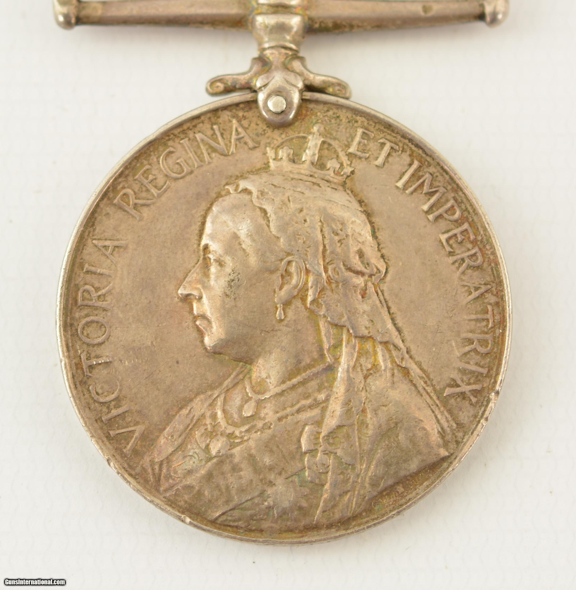 Description: This is a third version medal (without dates) that depicts Queen Victoria on the obverse, and helmeted Britannia holding a victory wreath over a column of marching troops with a pre-dreadnought battleship in the distance. The medal is numbered and identified along the edge: “6476, Pte. W. COOKE K.R.R.C." (King’s Royal Rifle Corps), and the original red, navy blue, and orange ribbon is in fine shape, slightly frayed at the ends, but stabilized with cello-tape. The ribbon is framed by six clasps: Laing’s Nek, Transvaal, Relief of Ladysmith, Orange Free State, Tugela Heights, and Cape Colony. Included with the medal are copies of Cooke’s Medal Roll entries from 1901 and 1902, however, no further information on him has yet been found. This is a splendid piece of Boer War memorabilia, and would make a great addition to any collection of British militaria. SOLD Manufacturer: British Model: Medal |