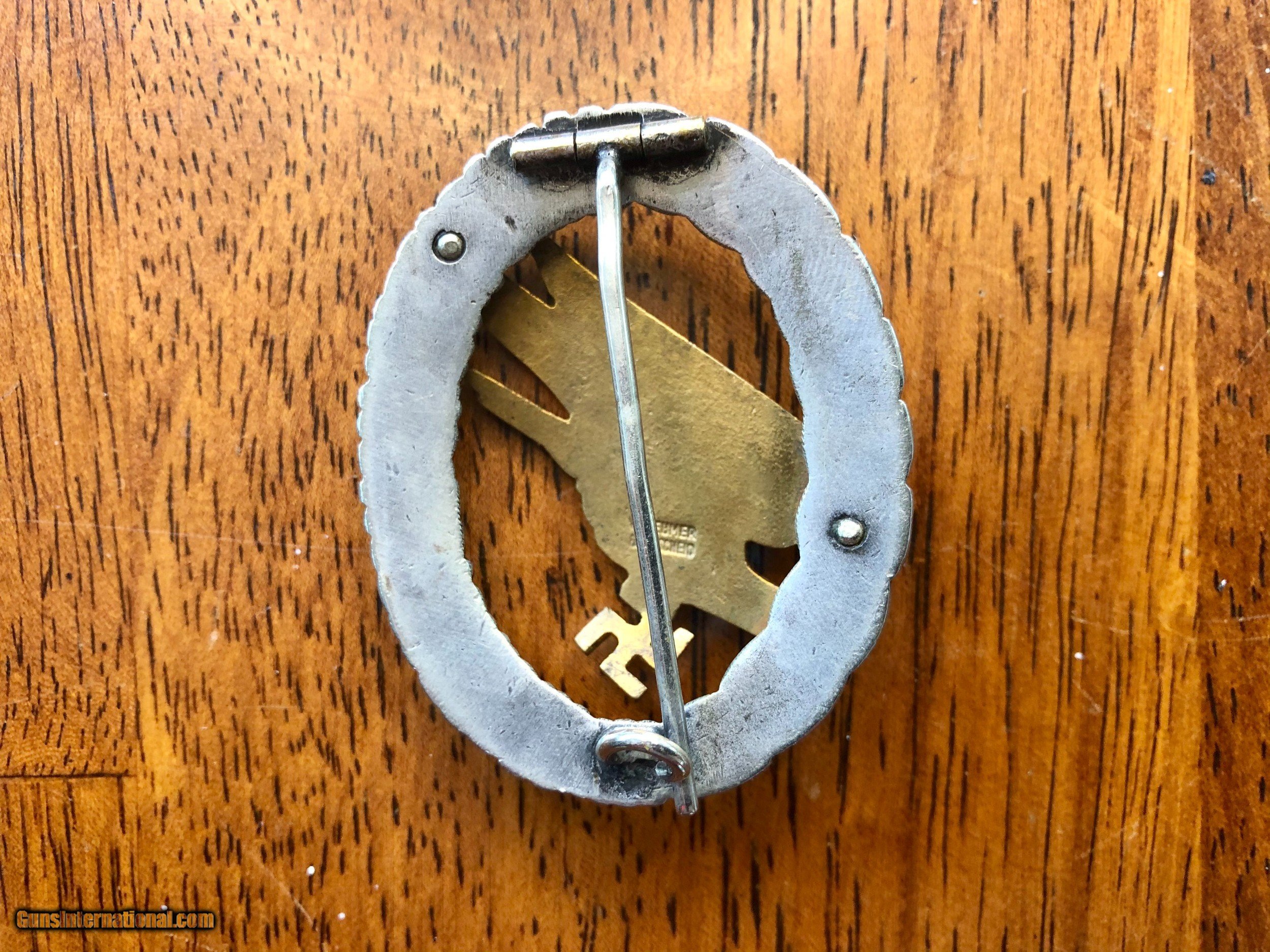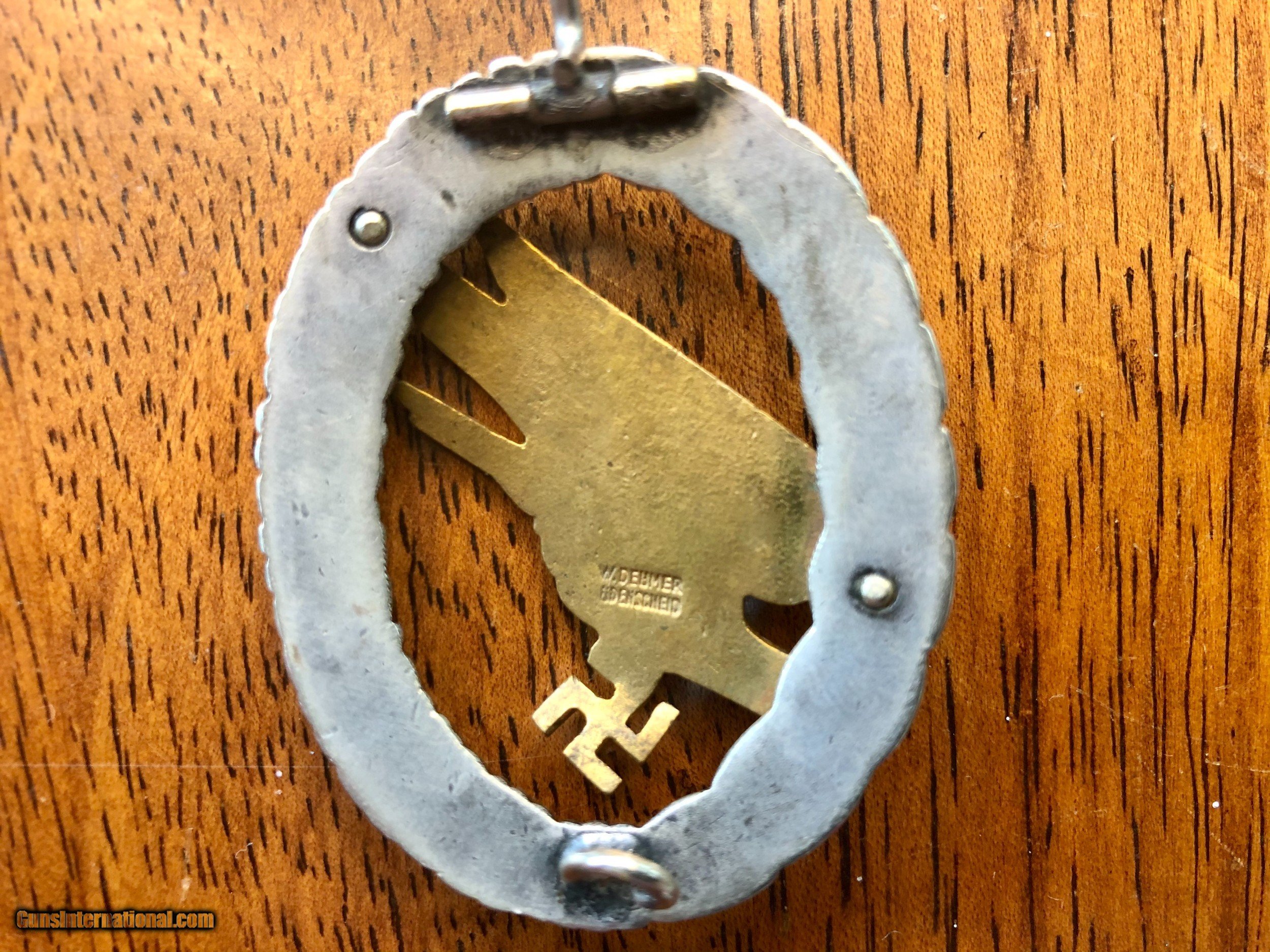 Description: This Luftwaffe Fallschirmjäger Badge produced by the firm Wilhelm Deumer is an absolutely amazing example. With the 2 piece construction consisting of a fire gold gilded brass eagle and nickle/silver wreath that has fantastic patina with amazing detail, this badge really would be hard to upgrade. There is no doubting this is a textbook Type B badge as produced by Deumer with no damage or repairs. The reverse shows a beautiful undisturbed patina and the Deumer makers mark as well as perfect undamaged pin, hinge, and catch. These early FJ badges are getting very hard to find on the open market, this is by far one of the best examples of this type out there by Deumer! Overall the Deumer made Paratrooper badges are some of the most sought after examples on the open market and this is one of the finest we've seen. We are always buying guns and militaria. Contact us about your estate or if wanting to buy, sell, or trade. NO PAYPAL! PAYMENT: -Payment must be recieved within 10 days of purchase. 3% additional charge for credit card processing. SALES TAX: -Florida residents add 7.5% sales tax. PRODUCT: -We operate a gun shop which means that every item is for sale in our store and it may have already been sold when you contact us. CONTACT: -Contact me with any and all questions. We want you to be happy with your purchase. PHONE #: (904) 271-5270 STORE HOURS: Mon-Fri: 11p-6pm Sat: 9a-3p BUYER: -It is Buyer's responsibility to ensure that the weapon is LEGAL to own in your city/state. SOLD |