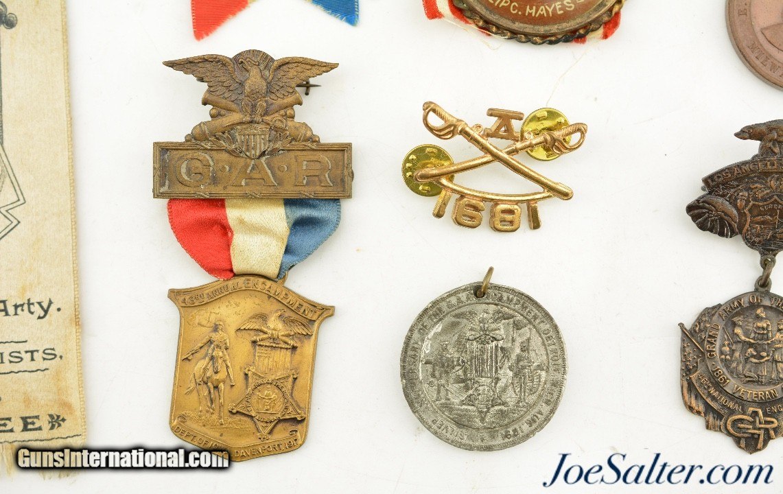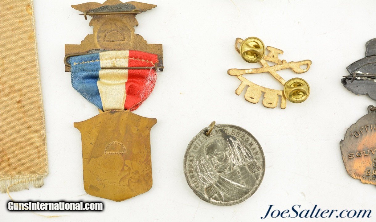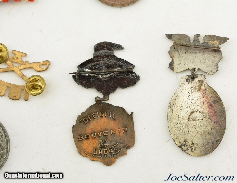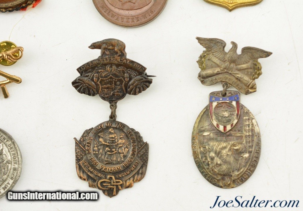 Description: This is a collection of 10 pieces of original G.A.R. (Grand Army of the Republic) Reunion and Encampment medals, ribbons, souvenirs and other uniform items. Included is a cloth ribbon from the 1891 Detroit reunion featuring the 1st Massachusetts Artillery unit with excellent detail and a colorful American flag and included from that reunion is a General Sherman medal and cavalry had badge. Also included is a Massachusetts State G.A.R. Medal; Milwaukee, Wis. Delegate medal; Illinois Philip C. Hayes photo medal from 1909; Souvenir 25th Encampment medal 1891 Detroit; 43rd annual encampment Davenport Iowa; 46th annual encampment Los Angeles, CA; and a 1911 medal from Genesee Falls Rochester, NY. A great assortment of G.A.R. Memorabilia in very high condition. Price: $395.00 Contact Seller |