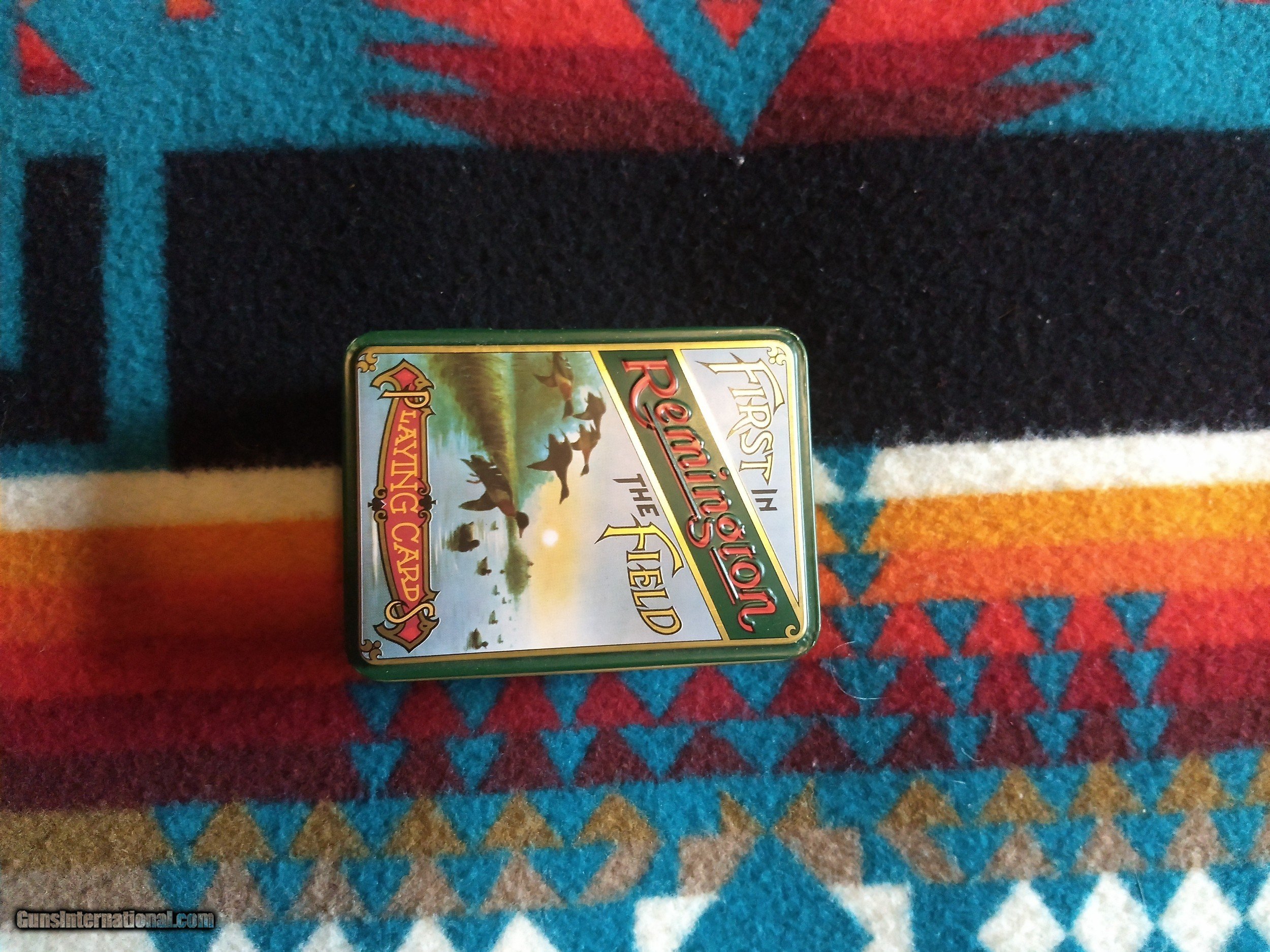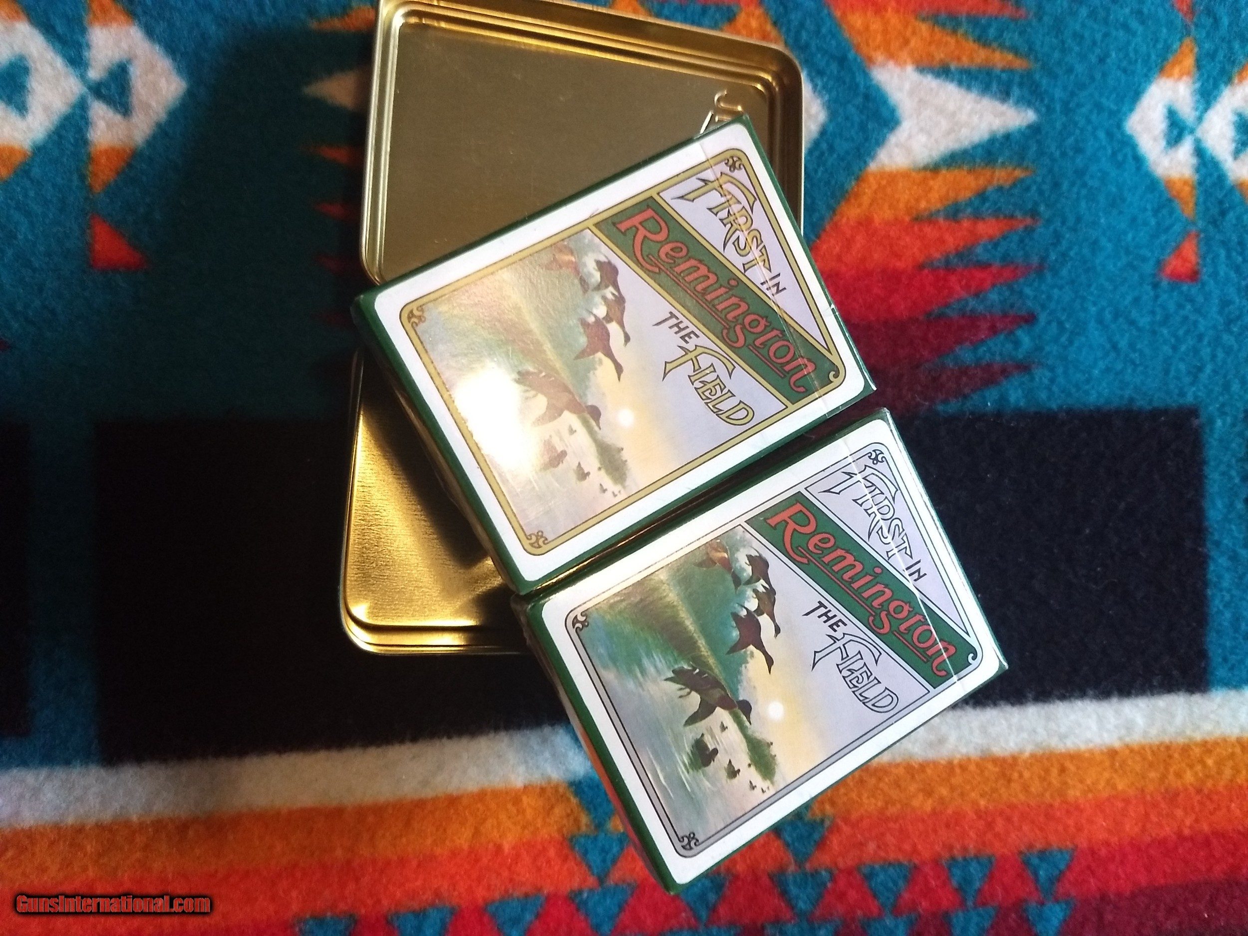 Description: Two decks of unopened Collectible Remington playing cards. This is a nice collectible tin with the two card decks sealed inside. Please see the pictures SOLD |