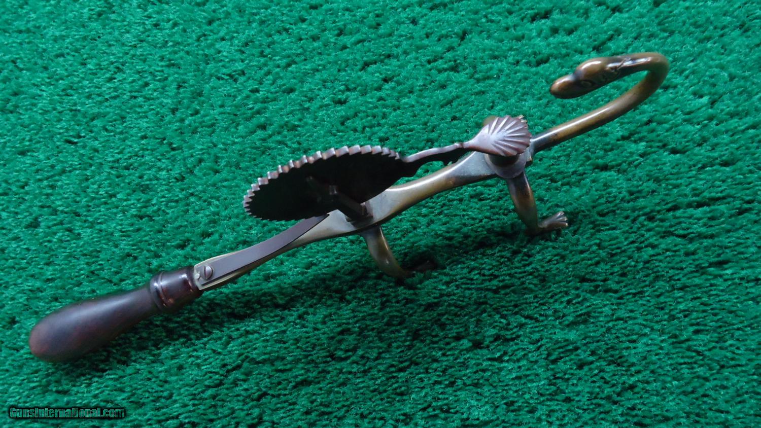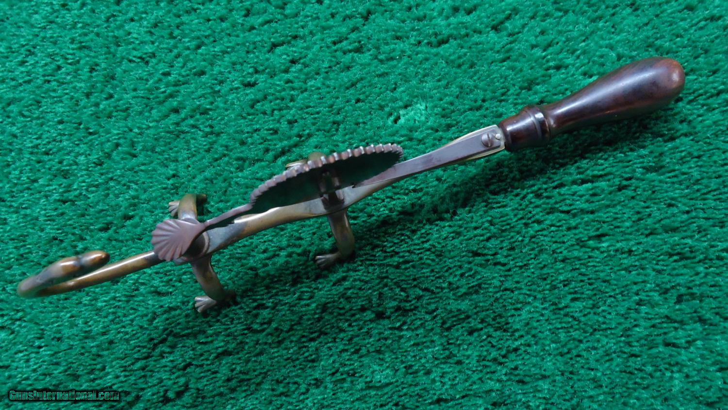 Description: In the shape of some sort of mythological peacock/serpent standing on four feet. Bird's head on one end and a turned wood grip of the 20th century on the other. Very nice item marked "H K C". Graduated wheel is marked from 0-25. Very decorative piece. Well made and in excellent condition with a nice aged brass patina coloration. Leroy Merz Antique Firearms specializes in antique and vintage Winchesters and other fine American firearms. Since 1965 Mr. Merz has taken part in the world of firearms and has been a contributor to many well known reference books. Just recently we mailed the 126th edition of our privately-published catalog. We have hundreds of additional guns in every price range at our home online. Search for Merz Antiques in google. SOLD |