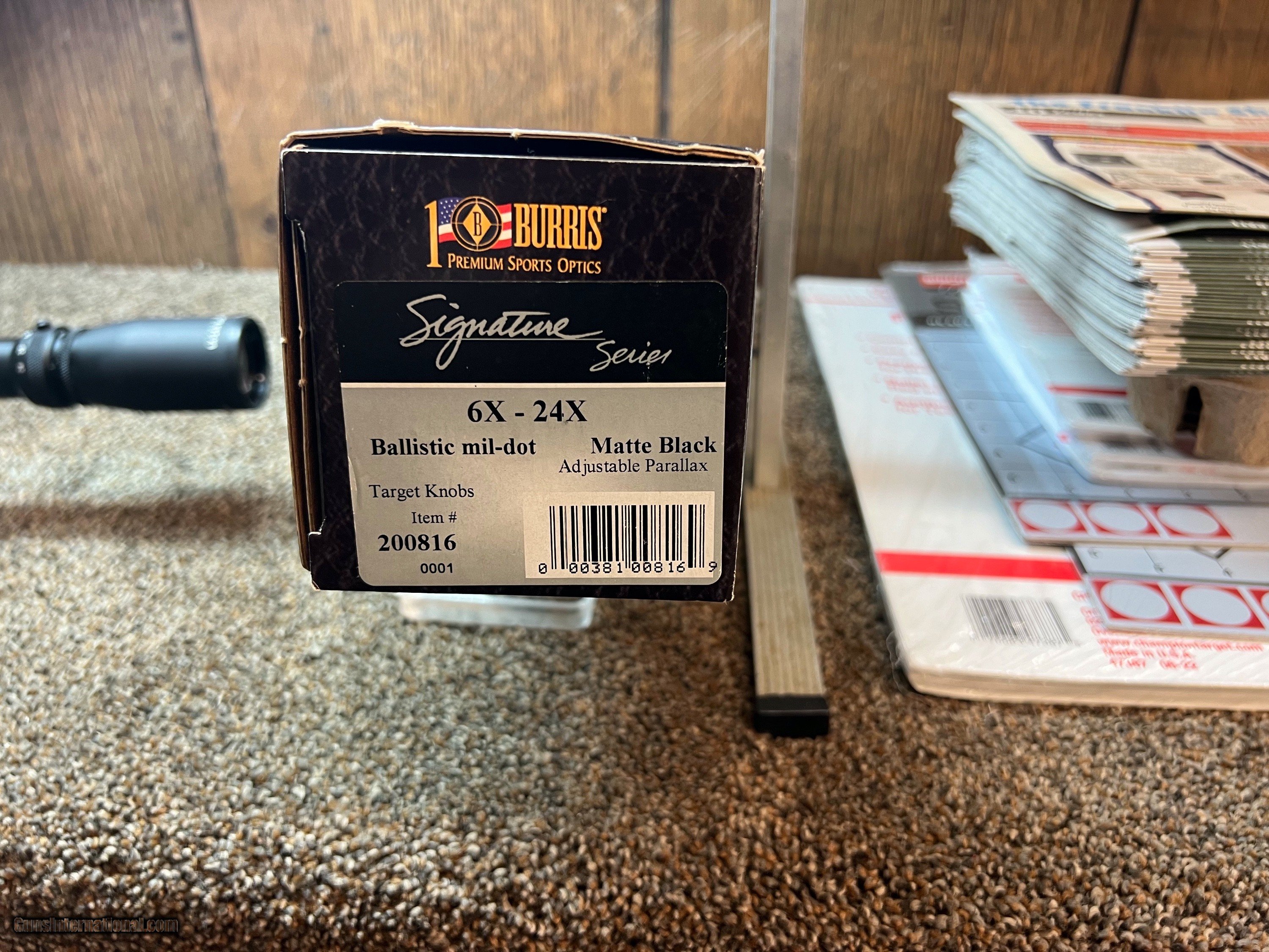 Description: Here's a like new Burris Signature Series 6-24X matte finish scope, 1" tube, target knobs, adjustable objective, ballistic mildot reticle, with it's orig box. 20.00 shipping 2.99% credit card fee PA residents add 6% sales tax. SOLD |