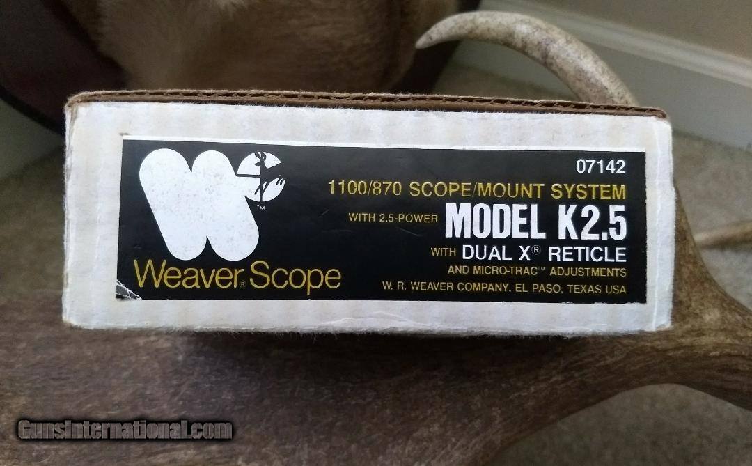 Description: ***The mint K2.5 60B with standard crosshairs has been sold. The NOS K2.5 with duplex type crosshairs is SOLD PENDING FUNDS*** For sale here I have two vintage Weaver K2.5 scopes for sale. One is a mint K2.5 60B that has standard crosshairs. No ring marks and looks virtually new. The second one is a K2.5 with Dual-X reticle (duplex type crosshairs) Micro-Trac. This scope is new and was bought by me about 2yrs ago as NOS in original box as a set-up for scoping a Remington M870 or 1100. I did mount the new one and checked operation by bore sighting it. Again, this is a new old stock Weaver K2.5. I will provide the box if requested on the NOS scope. The mint K2.5 60B is $125 + $10 shipping The NOS K2.5 with Dual-X reticle is $175 + $10 shipping. If the buyer of the NOS scope wants the mounting hardware and instructions for mounting it on an 870 & 1100, that will be $35 more. The NOS Micro-Trac is on the top in all photos. Thanks for looking. SOLD |