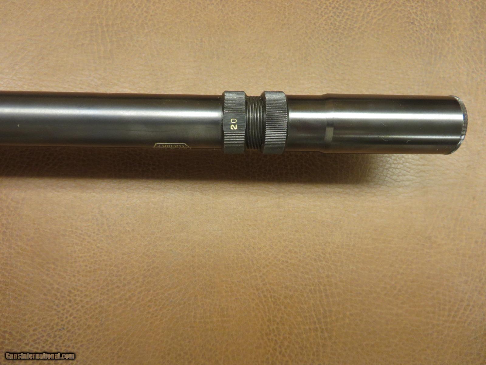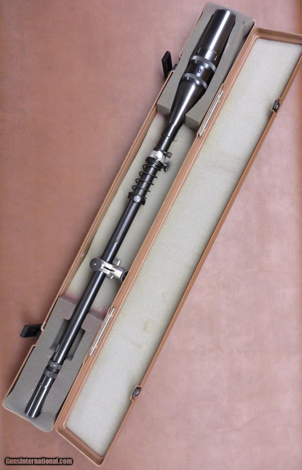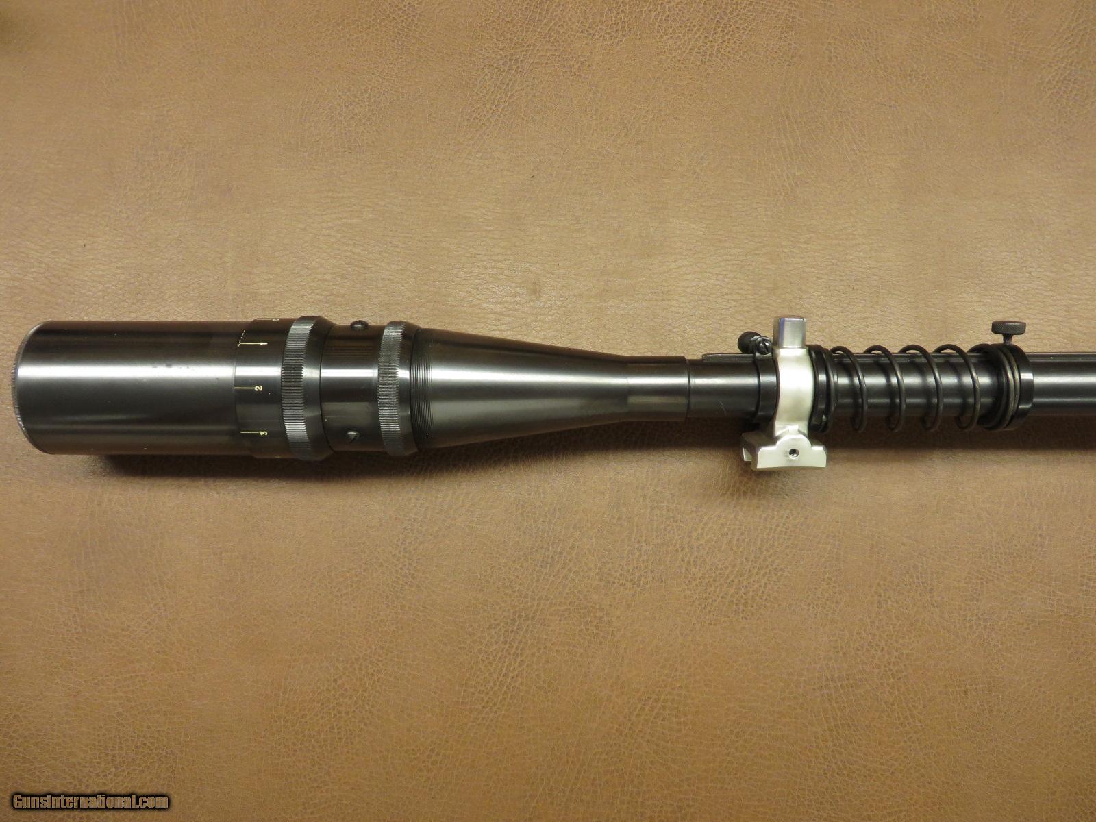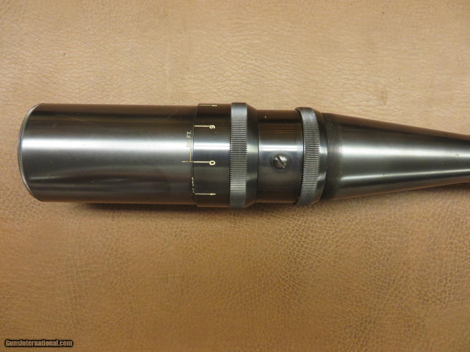 Description: 20 power 3/4 inch tube and 1 1/2 inch adjustable objective. Original screw on lens caps. Rings for mounting on target blocks. Standard crosshair. All in 99% condition in original plastic case. SOLD |