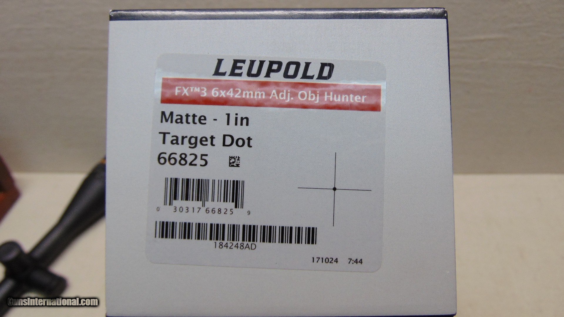 Description: Leupold Fx3 Competition Huter,6X42mm, Matte Black,AO,1" Tube,Target Turrets,Fine Crosshair with Target Dot,Excellent Condition, Very Minor Ring Scuffing, Bright Glass,With Box, Papers, Manual,and Leupold Cover!! Store Hours-Thurs-Fri-10AM-8PM Sat-9AM-12PM All Other Times Please Leave a Message, Thank You! Lower 48 State Sales Only No California Sales 6% Pa Sales Tax Applicable SOLD |