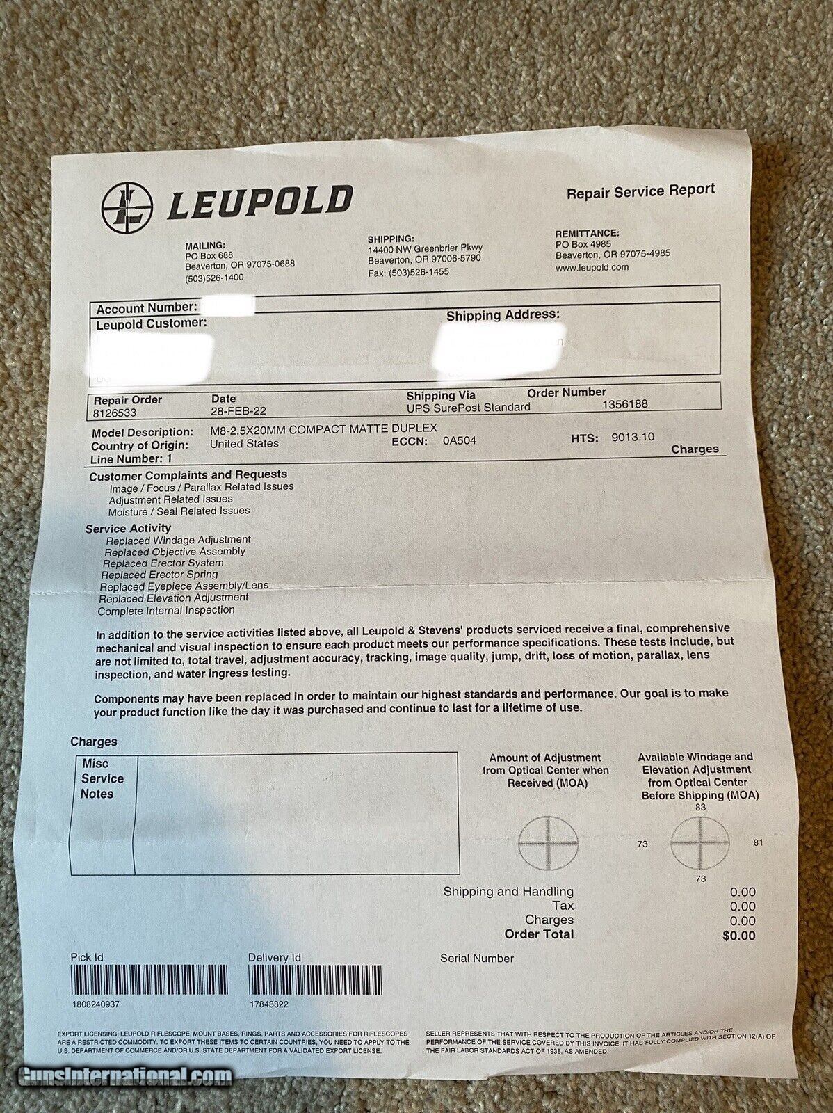 Description: Item specifics Condition: “Scope has been completely factory refurbished and is like new. See description for full details.” Maximum Magnification:2.5x Model:M8 2.5x20 Compact Country of Manufacture:United States Lens Coating:Fully Multicoated Material:Aluminum Sport/Activity:Hunting Tube Diameter:1 in Type:Fixed Scope Features:Compact, Fixed Magnification, Lightweight Color:Black Reticle Type:Duplex For Gun Type:Pistol, Revolver, Rimfire, Rifle, Shotgun Brand:Leupold Objective Lens Diameter:20 mm Year of Manufacture:2003 This scope came to me mounted on a rifle, but the previous owner had used pliers on the turret caps. I sent it back to Leupold (unlimited lifetime warranty!) and they completely refurbished the whole scope! Including new modern glass!!! Check out the photos, including the OEM work order showing that the internals were replaced and the scope fully function checked and gas purged. This thing is new again! Standard 1" tube, but short 8" length and light weight makes it perfect for rimfire or handgun hunting. Simple, low profile, no moving parts makes it great for big bores or dangerous game rifles. Or put it on your short barrel carbine for a light weight, compact package. I would keep it, but I do not have an application for 2.5x so I need to move this one out of the safe to make room for something else. Make it yours with buy it now or send me a reasonable offer. Good luck! Note: this item is also for sale on eBay, but their fees are higher for me so the price is higher there to compensate. Purchasing here on GI makes a better deal for both of us. SOLD |